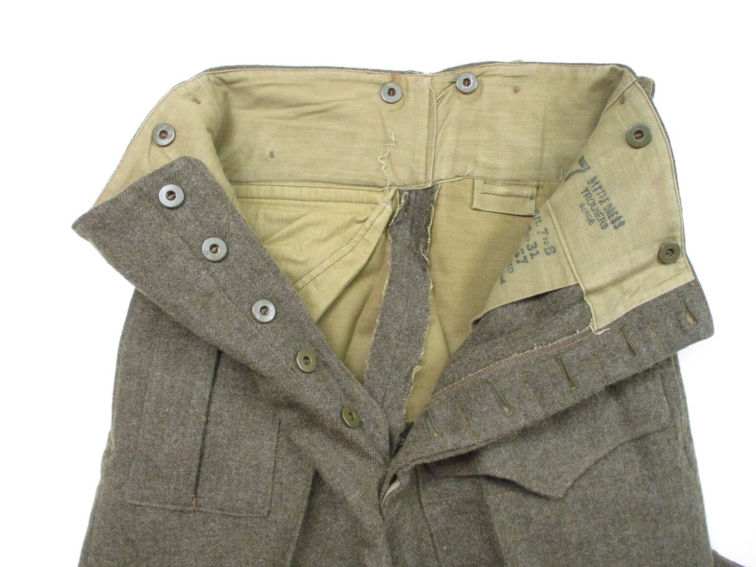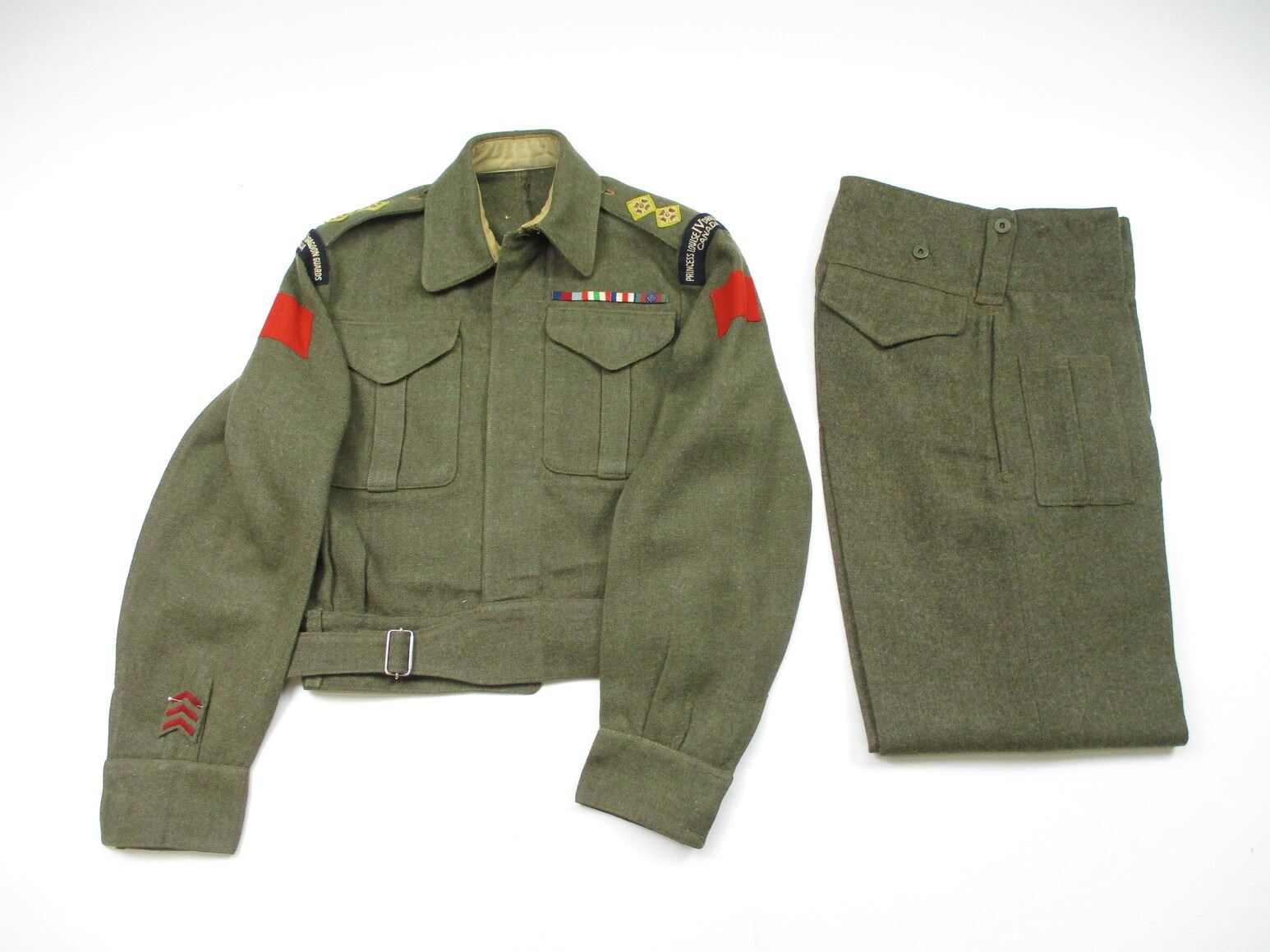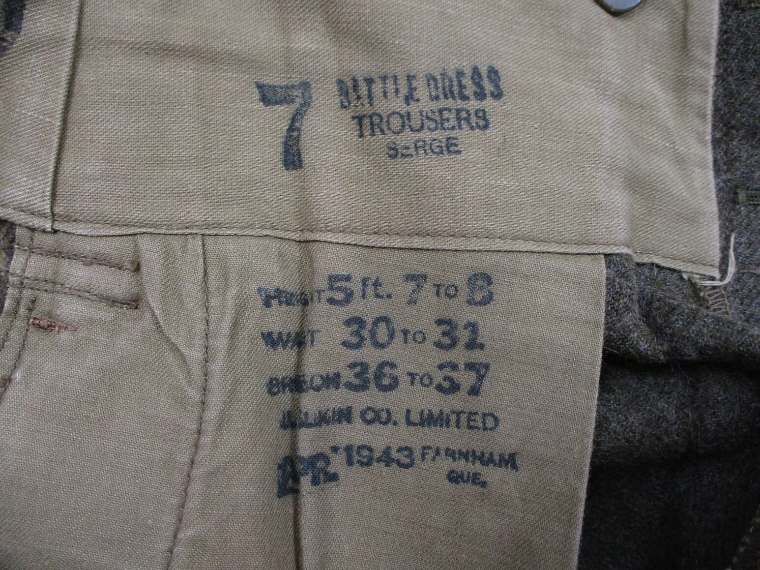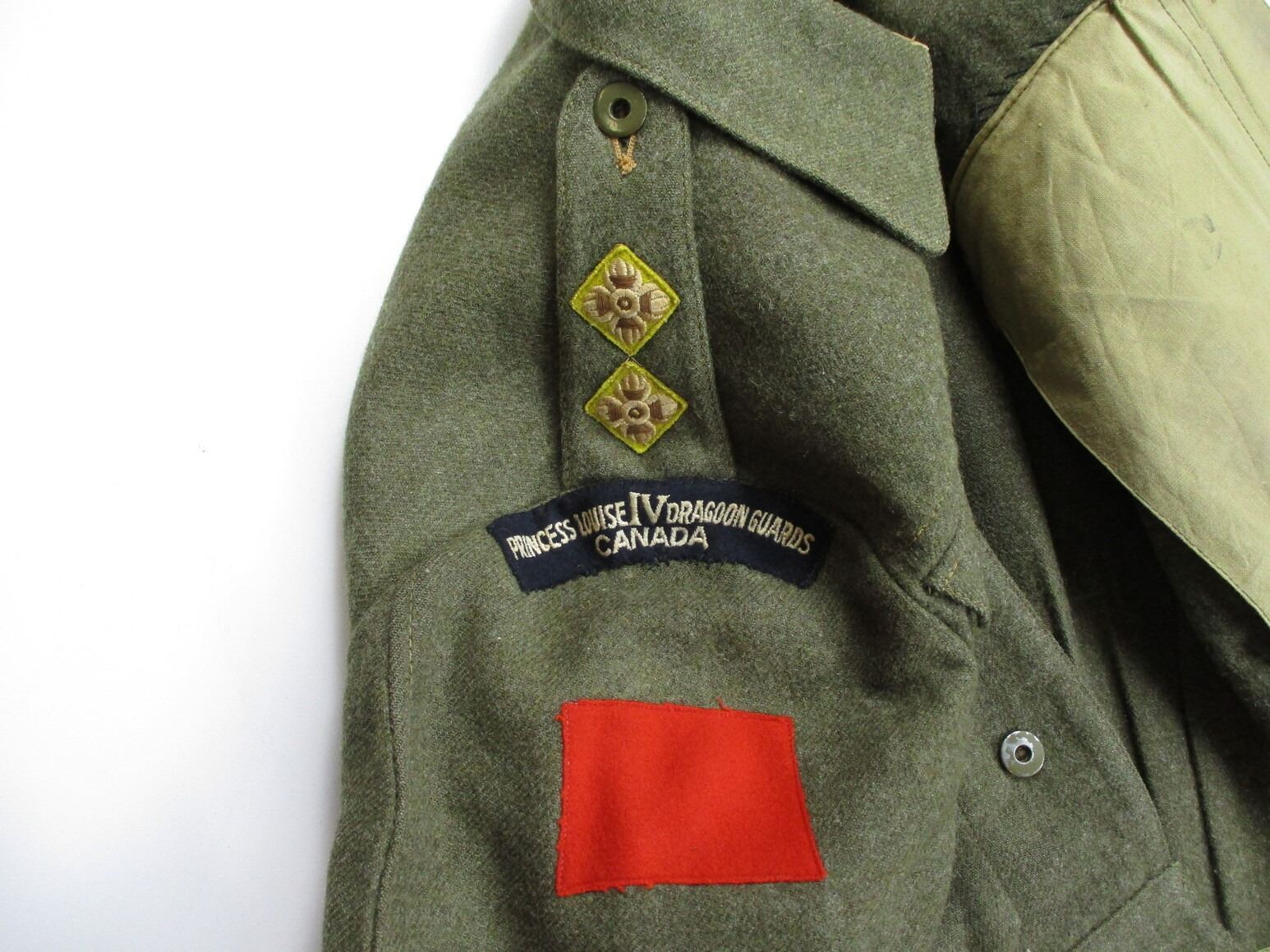 WWII CANADIAN MILITARY BATTLEDRESS UNIFORM, LOT INCLUDES; (1) GREEN WOOL JACKET, CANADA PRINCESS LOUISE IV DRAGOON GUARDS, 1ST DIVISION, WITH 4-SERVICE CHEVRONS & RIBBON BAR (1939-1945 STAR, ITALY STAR, FRANCE & GERMANY STAR & CANADIAN VOLUNTEER SERVICE (AND MAPLE LEAF PIN), FLY-FRONTED, MARKED: "BATTLE DRESS, BLOUSE SERGE, SIZE NO.7, ….. , MASTER CRAFT UNIFORM CO., 1943" & C-BROAD ARROW & (1) PAIR GREEN WOOL PANTS, MARKED: "BATTLE DRESS, TROUSERS, SERGE, SIZE NO.7, J.L. ELKIN CO. LIMITED, APR' 1943, FARNHAM, QUE." & C-BROAD ARROW. SEE PHOTOS.