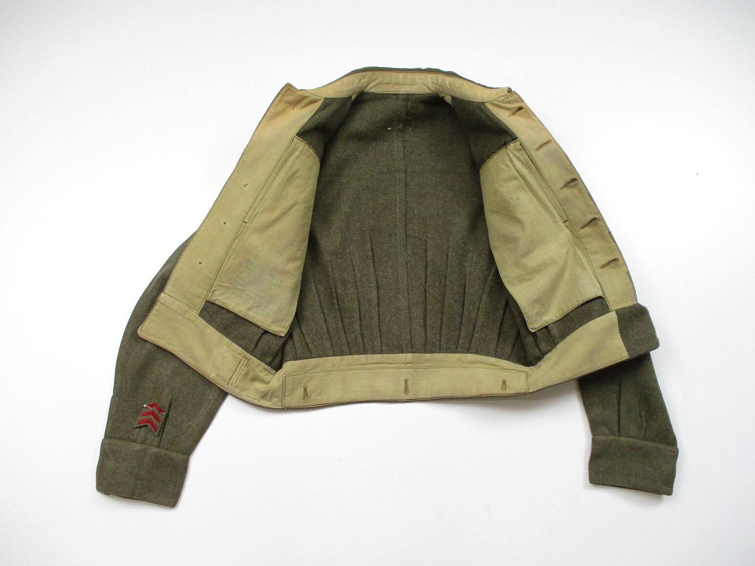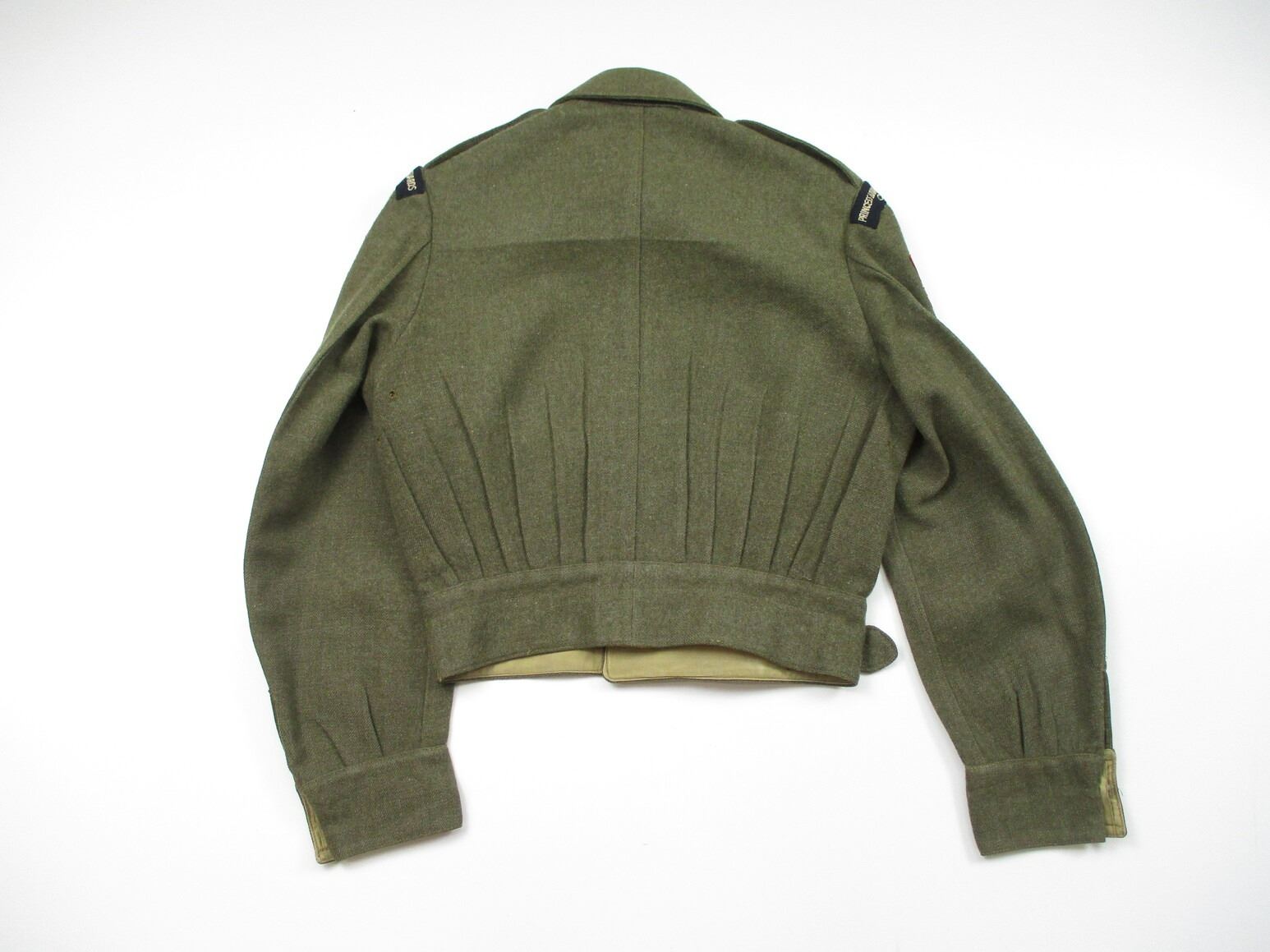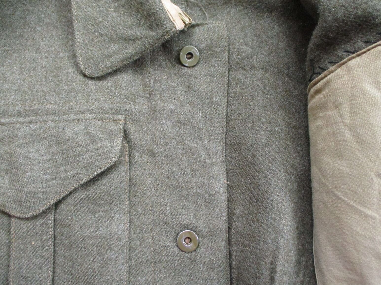 WWII CANADIAN MILITARY BATTLEDRESS UNIFORM, LOT INCLUDES; (1) GREEN WOOL JACKET, CANADA PRINCESS LOUISE IV DRAGOON GUARDS, 1ST DIVISION, WITH 4-SERVICE CHEVRONS & RIBBON BAR (1939-1945 STAR, ITALY STAR, FRANCE & GERMANY STAR & CANADIAN VOLUNTEER SERVICE (AND MAPLE LEAF PIN), FLY-FRONTED, MARKED: "BATTLE DRESS, BLOUSE SERGE, SIZE NO.7, ….. , MASTER CRAFT UNIFORM CO., 1943" & C-BROAD ARROW & (1) PAIR GREEN WOOL PANTS, MARKED: "BATTLE DRESS, TROUSERS, SERGE, SIZE NO.7, J.L. ELKIN CO. LIMITED, APR' 1943, FARNHAM, QUE." & C-BROAD ARROW. SEE PHOTOS.