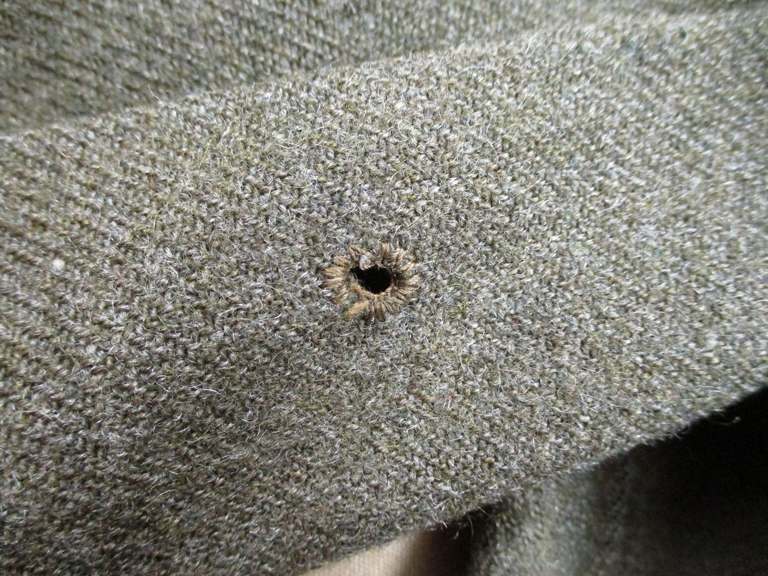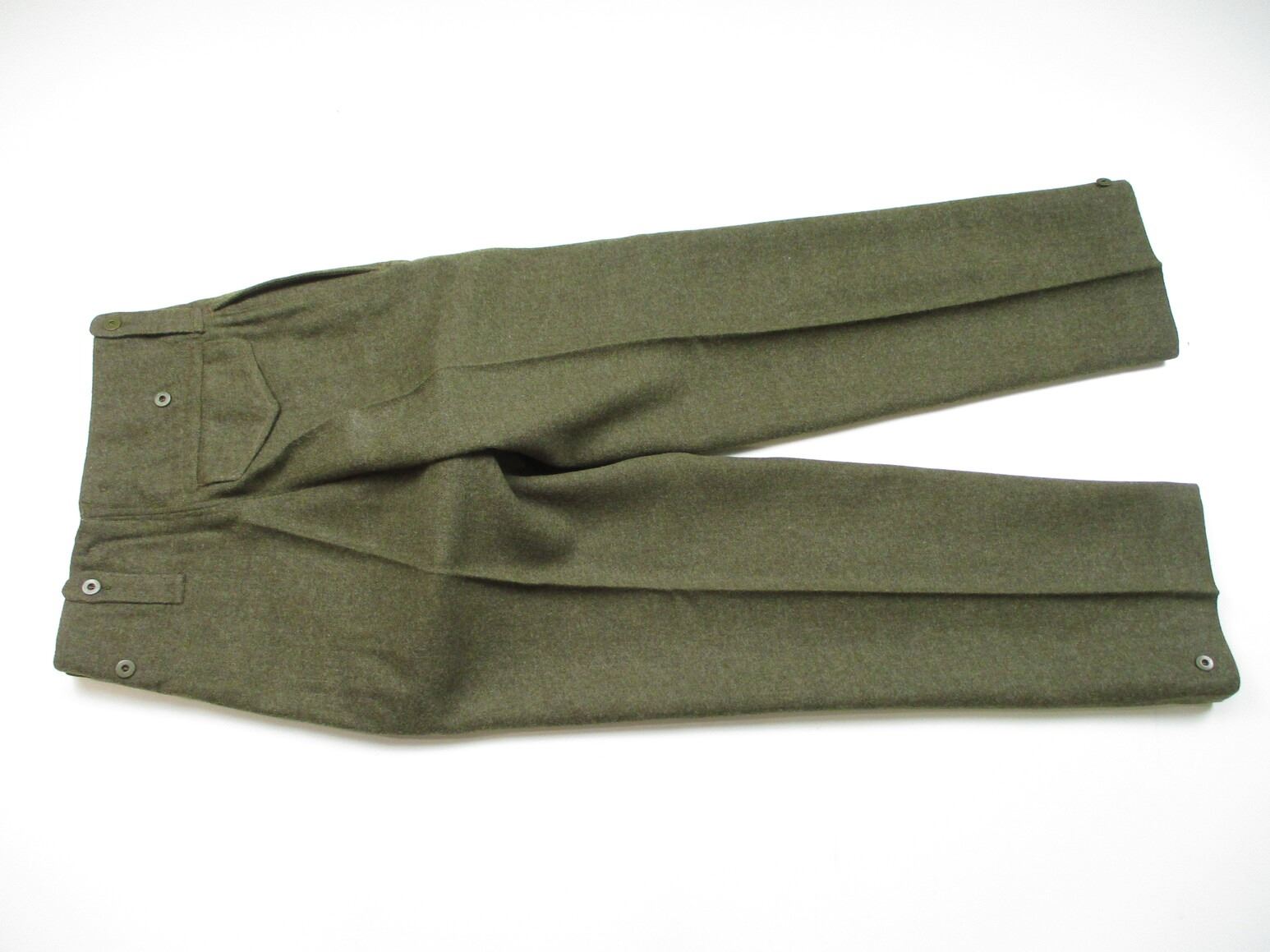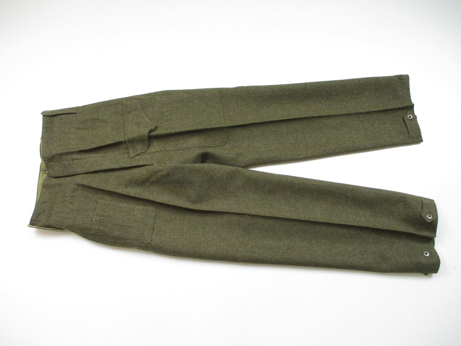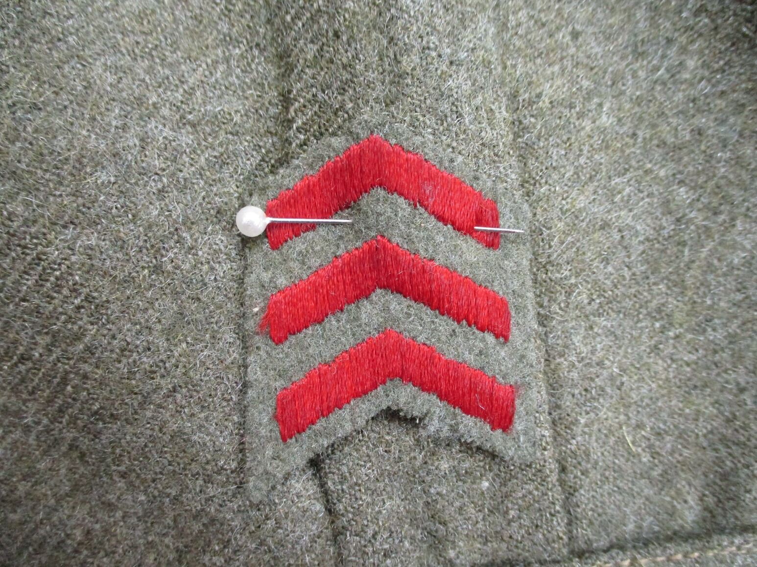 WWII CANADIAN MILITARY BATTLEDRESS UNIFORM, LOT INCLUDES; (1) GREEN WOOL JACKET, CANADA PRINCESS LOUISE IV DRAGOON GUARDS, 1ST DIVISION, WITH 4-SERVICE CHEVRONS & RIBBON BAR (1939-1945 STAR, ITALY STAR, FRANCE & GERMANY STAR & CANADIAN VOLUNTEER SERVICE (AND MAPLE LEAF PIN), FLY-FRONTED, MARKED: "BATTLE DRESS, BLOUSE SERGE, SIZE NO.7, ….. , MASTER CRAFT UNIFORM CO., 1943" & C-BROAD ARROW & (1) PAIR GREEN WOOL PANTS, MARKED: "BATTLE DRESS, TROUSERS, SERGE, SIZE NO.7, J.L. ELKIN CO. LIMITED, APR' 1943, FARNHAM, QUE." & C-BROAD ARROW. SEE PHOTOS.