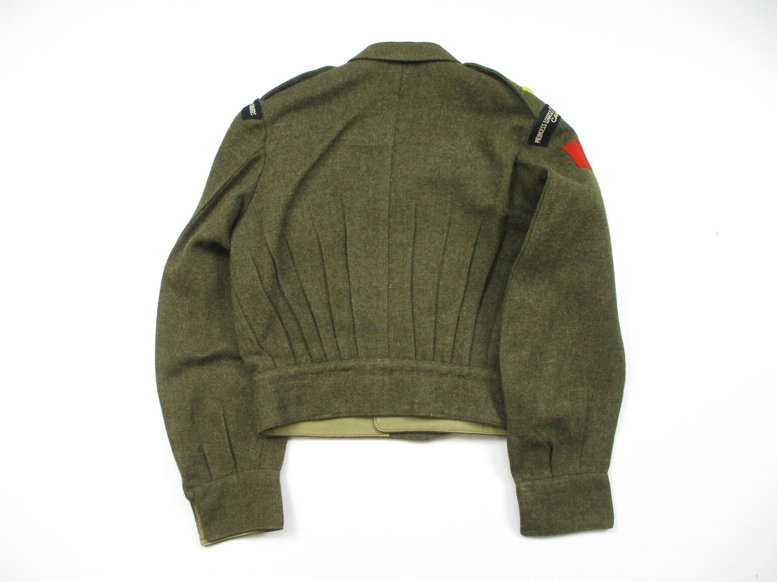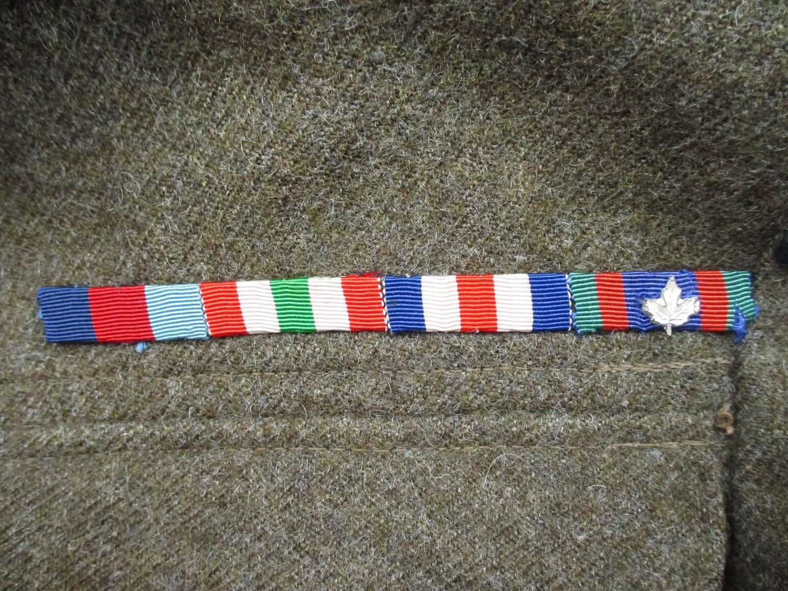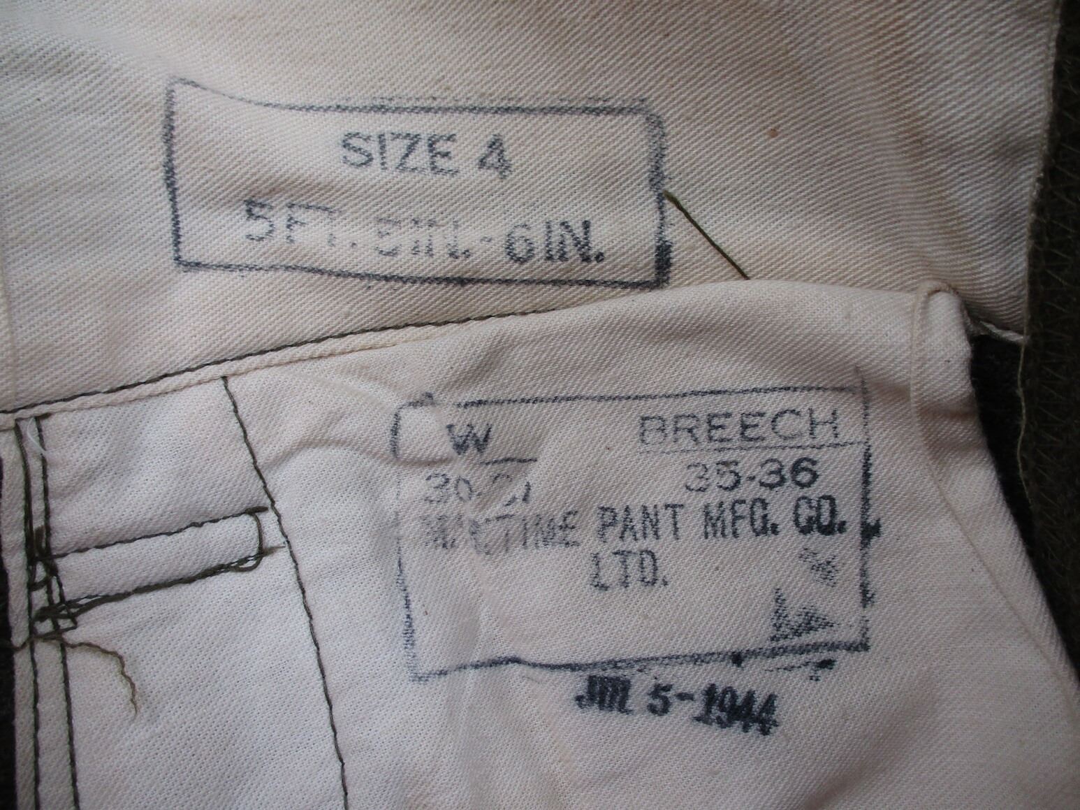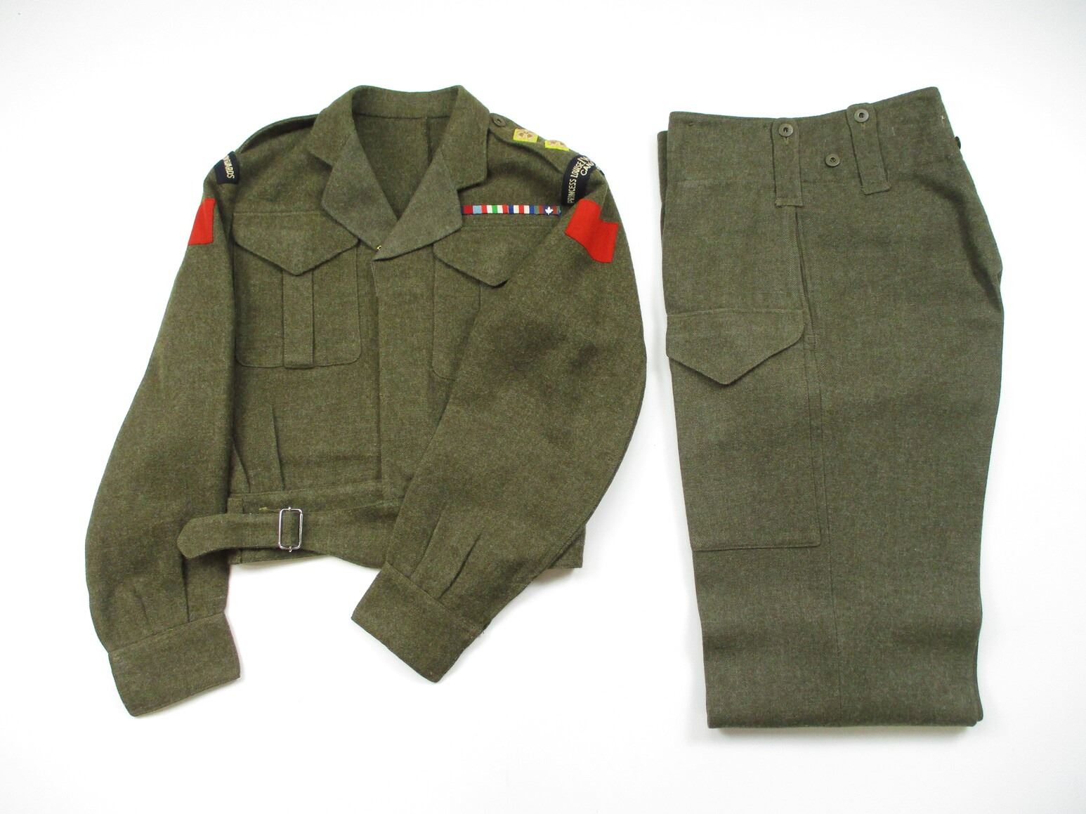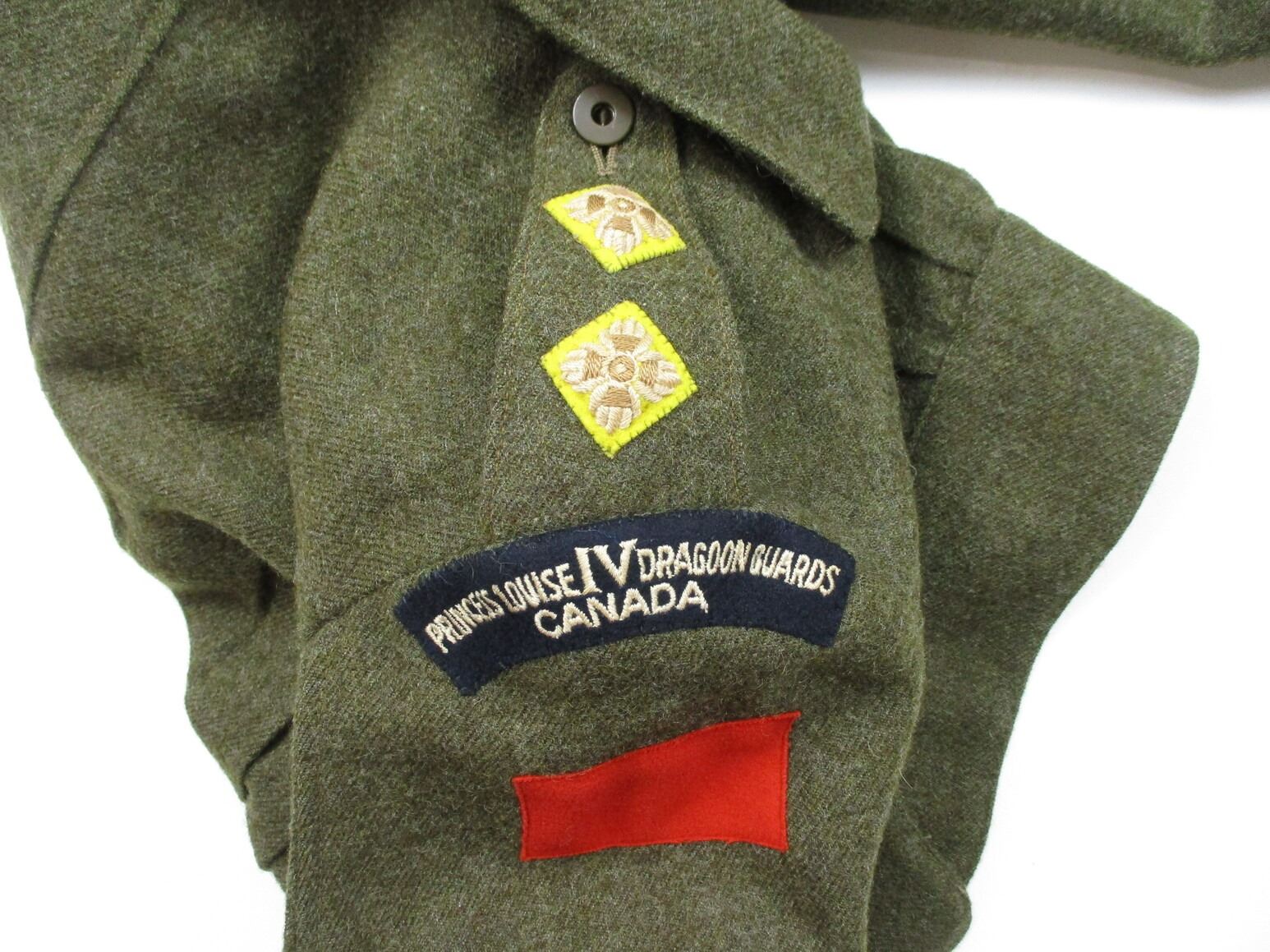 WWII CANADIAN MILITARY BATTLEDRESS UNIFORM, LOT INCLUDES; (1) GREEN WOOL JACKET, CANADA PRINCESS LOUISE IV DRAGOON GUARDS, 1ST DIVISION, WITH RIBBON BAR (1939-1945 STAR, ITALY STAR, FRANCE & GERMANY STAR & CANADIAN VOLUNTEER SERVICE (AND MAPLE LEAF PIN), FLY-FRONTED, FAINT / UN-CLEAR MARKINGS, "1944" & C-BROAD ARROW & (1) PAIR GREEN WOOL PANTS, MARKED: "SIZE 4, MARITIME PANT MFG. CO. LTD., JUL 5-1944" & C-BROAD ARROW. SEE PHOTOS.
