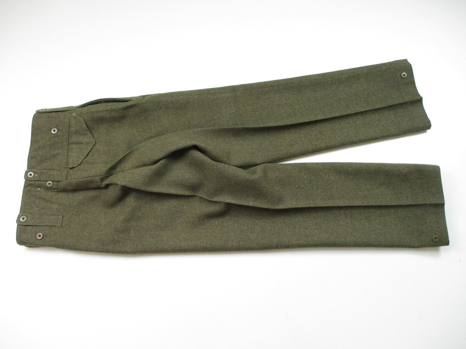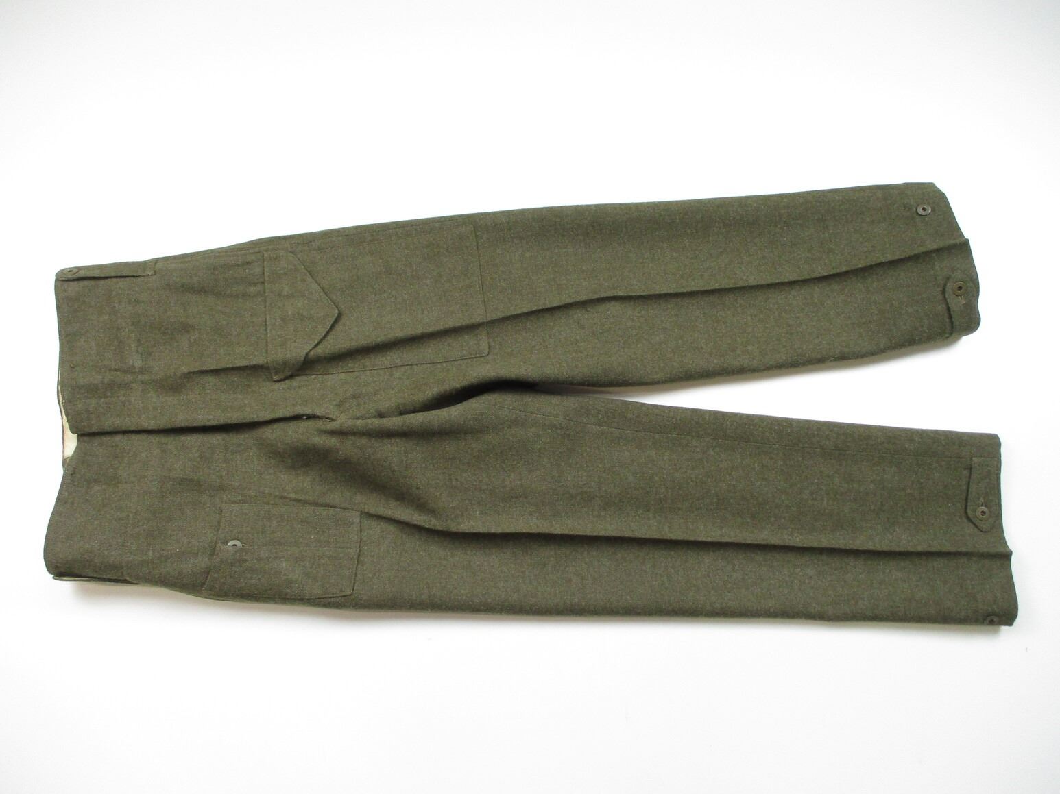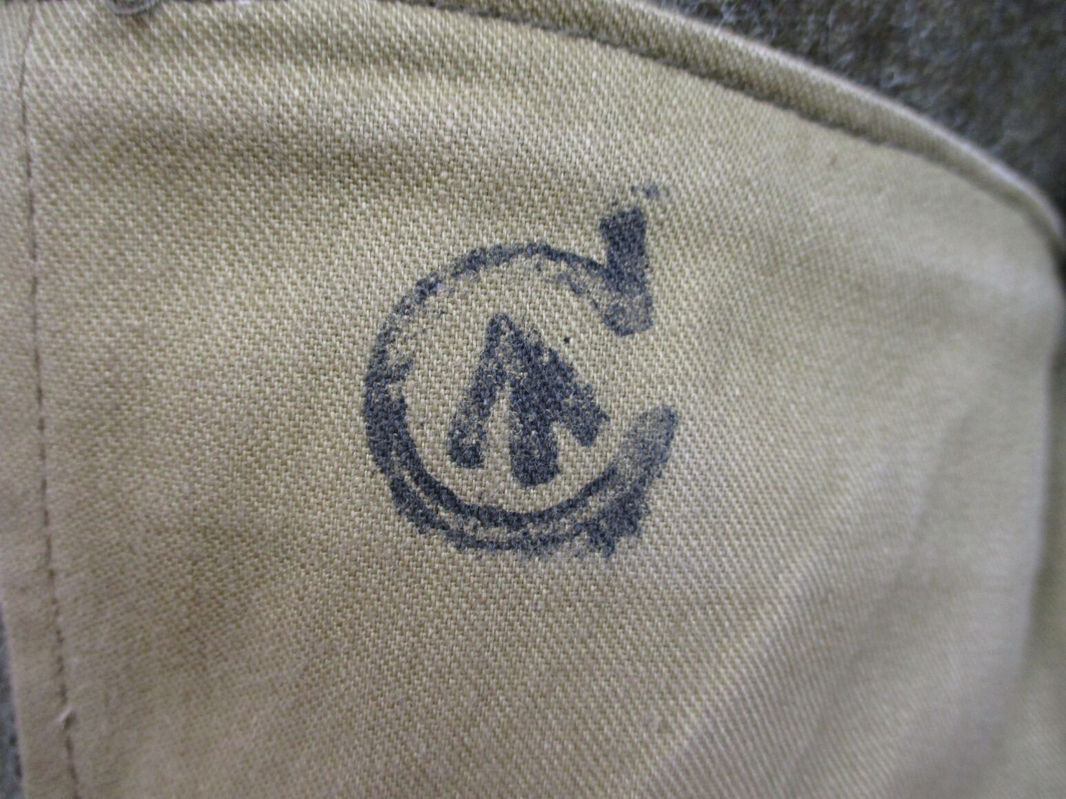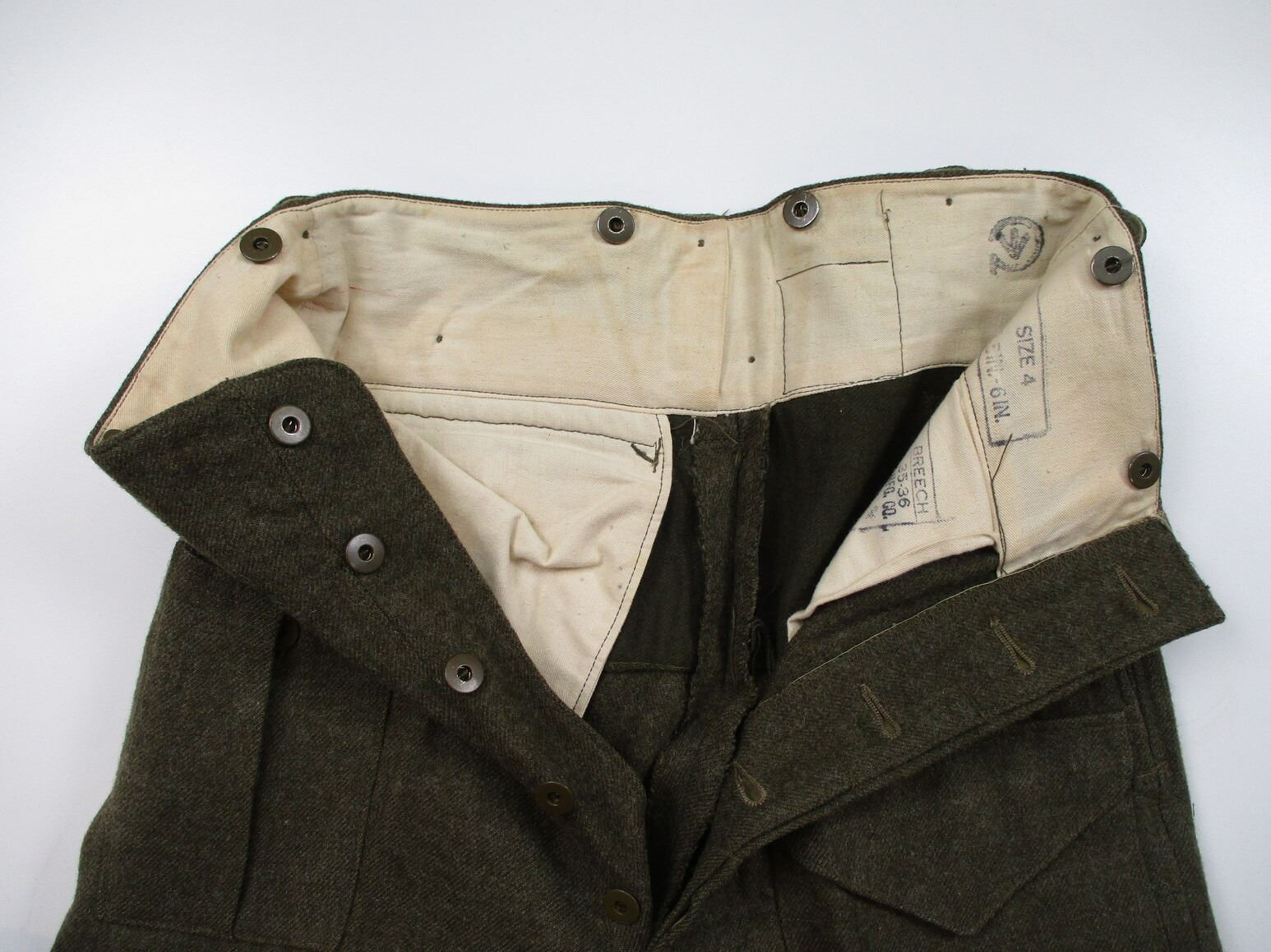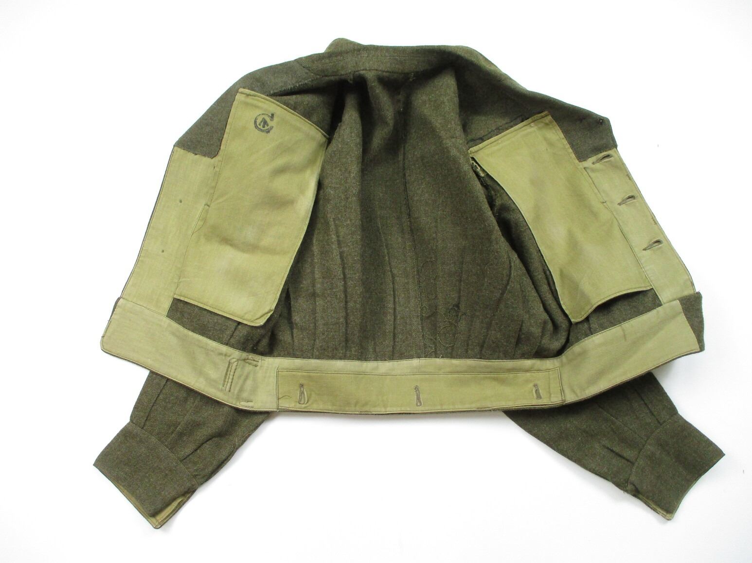WWII CANADIAN MILITARY BATTLEDRESS UNIFORM, LOT INCLUDES; (1) GREEN WOOL JACKET, CANADA PRINCESS LOUISE IV DRAGOON GUARDS, 1ST DIVISION, WITH RIBBON BAR (1939-1945 STAR, ITALY STAR, FRANCE & GERMANY STAR & CANADIAN VOLUNTEER SERVICE (AND MAPLE LEAF PIN), FLY-FRONTED, FAINT / UN-CLEAR MARKINGS, "1944" & C-BROAD ARROW & (1) PAIR GREEN WOOL PANTS, MARKED: "SIZE 4, MARITIME PANT MFG. CO. LTD., JUL 5-1944" & C-BROAD ARROW. SEE PHOTOS.