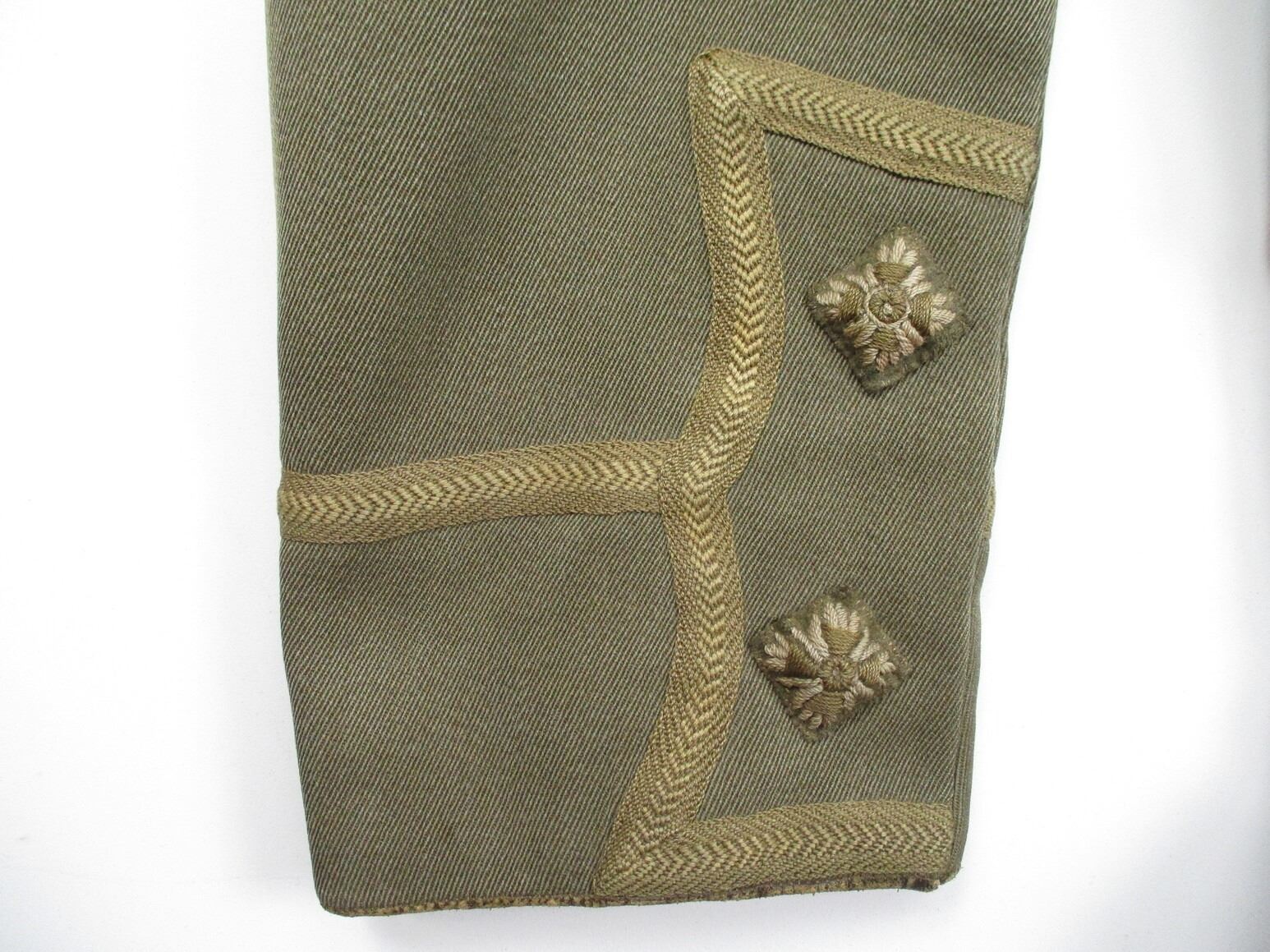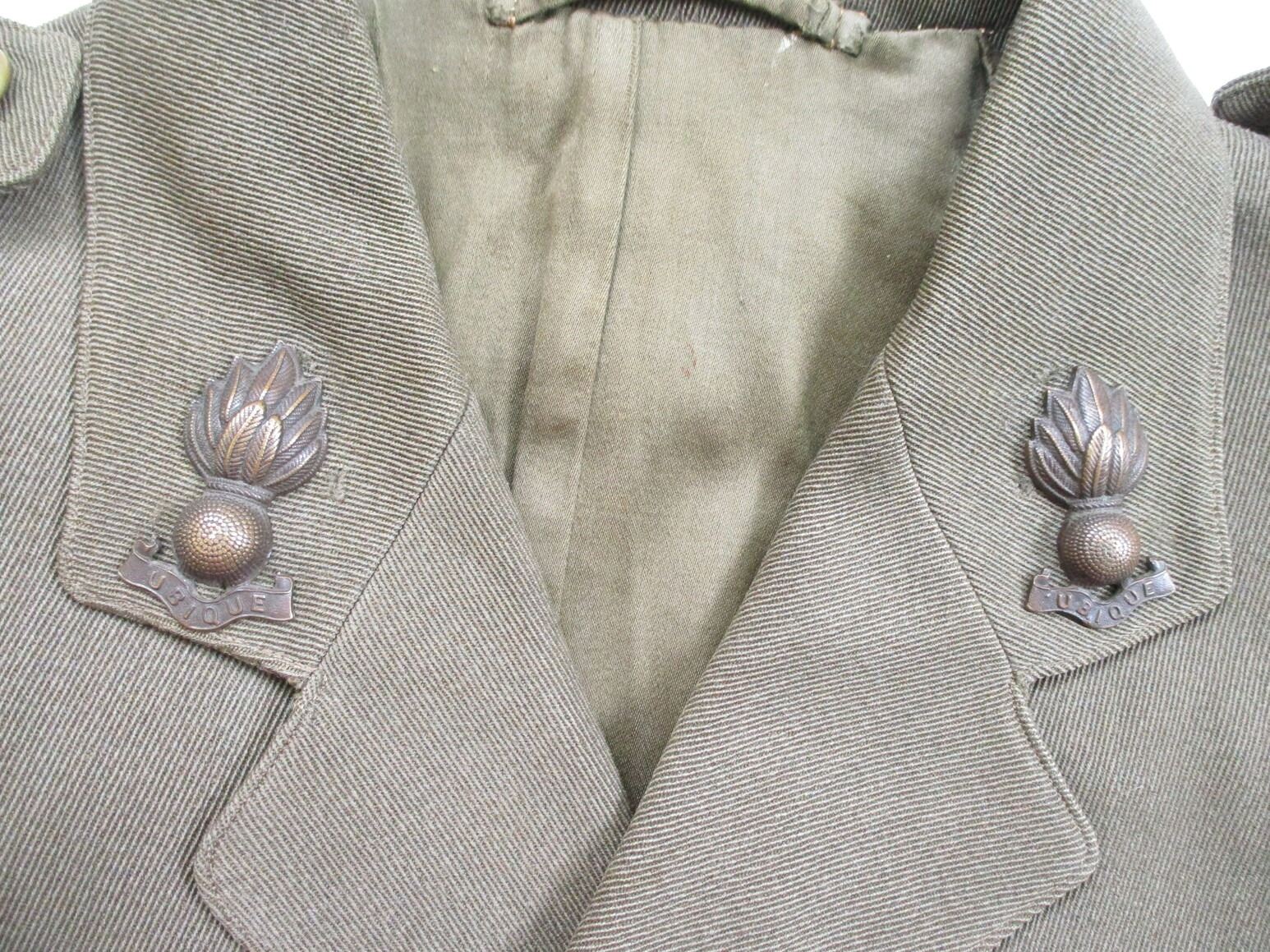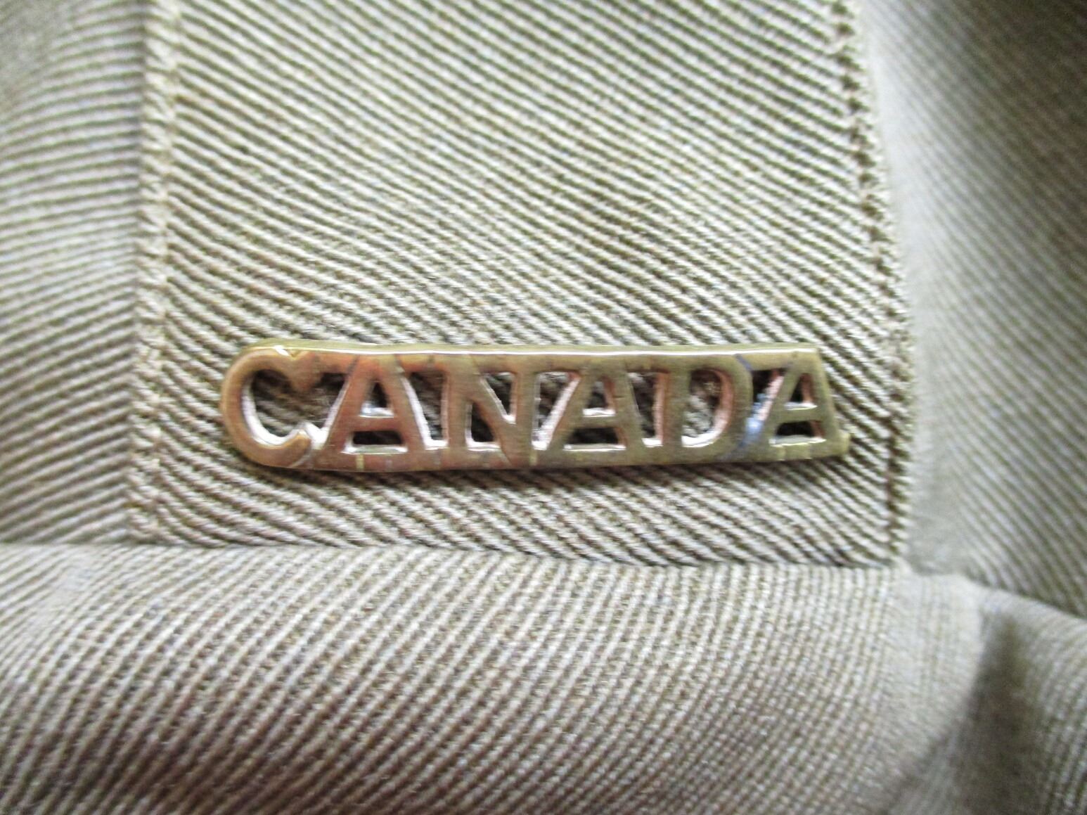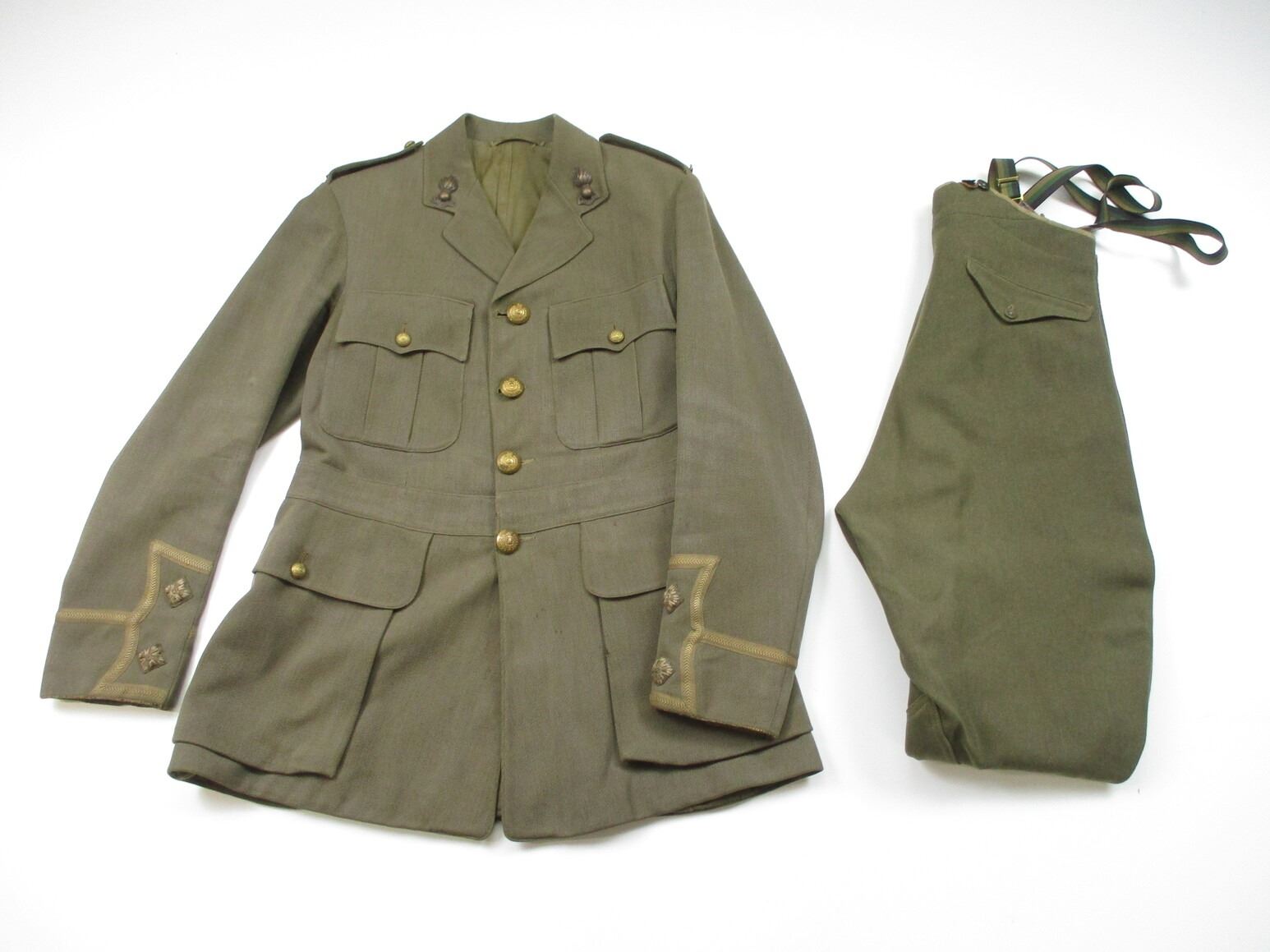WWI CANADIAN MILITARY DRESS UNIFORM, LOT INCLUDES; (1) GREEN JACKET, LIEUTENANT RANKING WITH CANADA / "UBIQUE" PINS & ROYAL ENGINEERS BUTTONS, MARKED: "R.J. INGLIS LTD., 138 PEEL STREET, MONTREAL, LT. A.H. HOLLAND, 15/12/16, NO. 234", SHOULDER WIDTH APPROX. 16", SHOWS VERY LITTLE WEAR & (1) GREEN PAIR OF PANTS, NO VISIBLE MARKINGS, WITH SUSPENDERS, WAIST APPROX. 16". SEE PHOTOS.