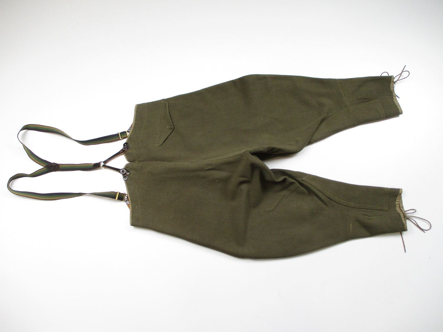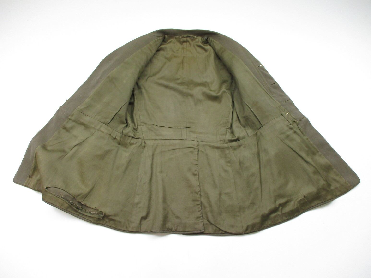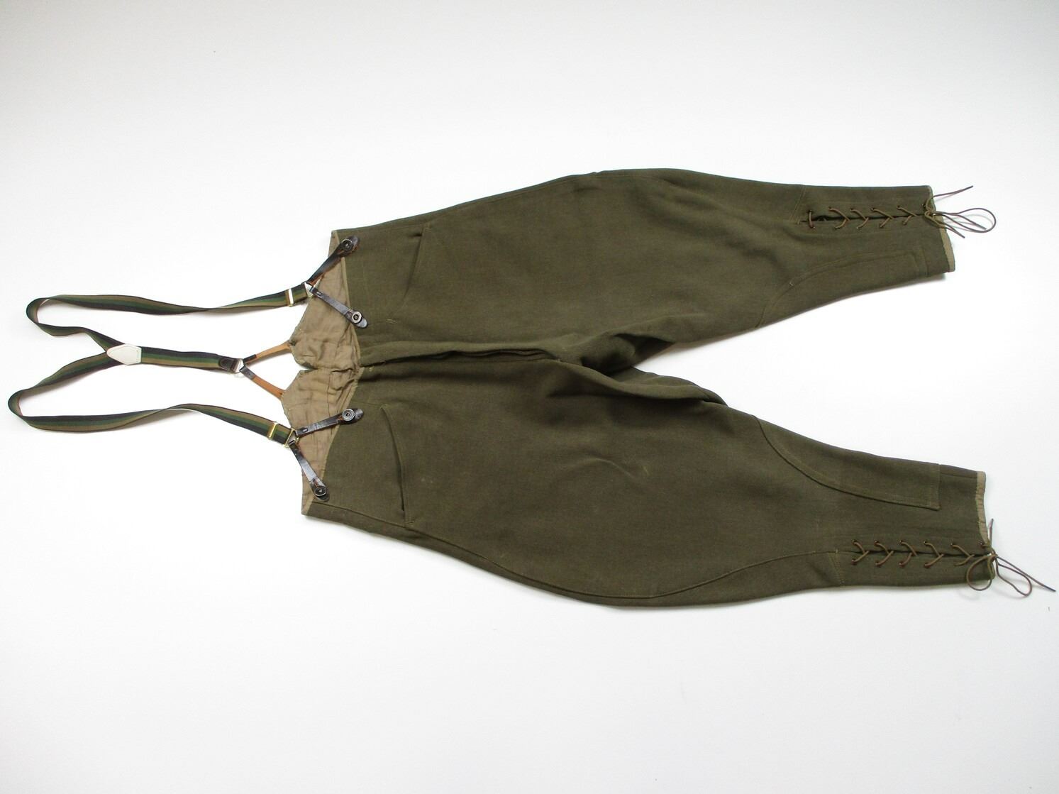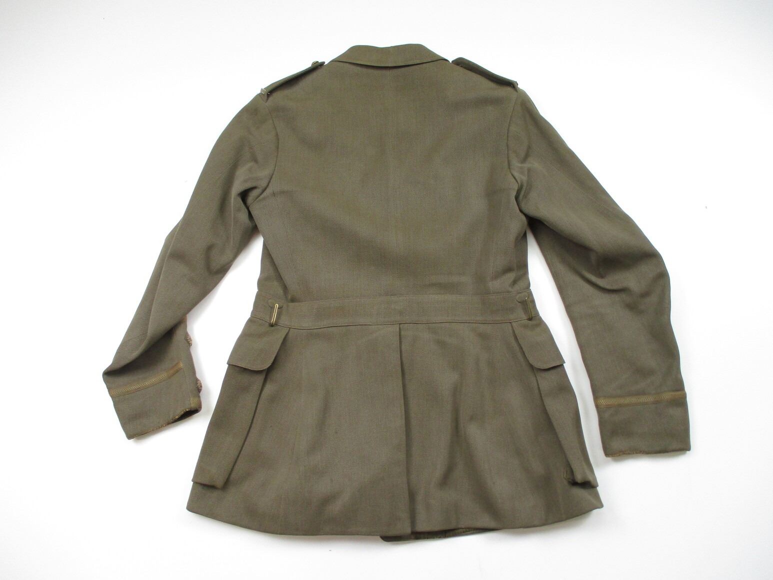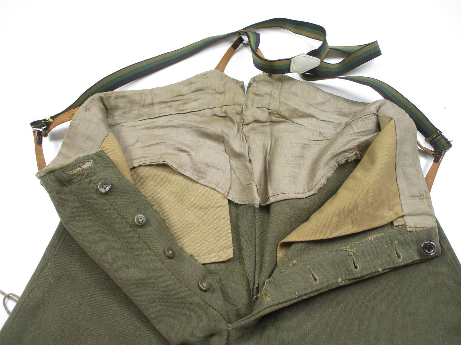 WWI CANADIAN MILITARY DRESS UNIFORM, LOT INCLUDES; (1) GREEN JACKET, LIEUTENANT RANKING WITH CANADA / "UBIQUE" PINS & ROYAL ENGINEERS BUTTONS, MARKED: "R.J. INGLIS LTD., 138 PEEL STREET, MONTREAL, LT. A.H. HOLLAND, 15/12/16, NO. 234", SHOULDER WIDTH APPROX. 16", SHOWS VERY LITTLE WEAR & (1) GREEN PAIR OF PANTS, NO VISIBLE MARKINGS, WITH SUSPENDERS, WAIST APPROX. 16". SEE PHOTOS.