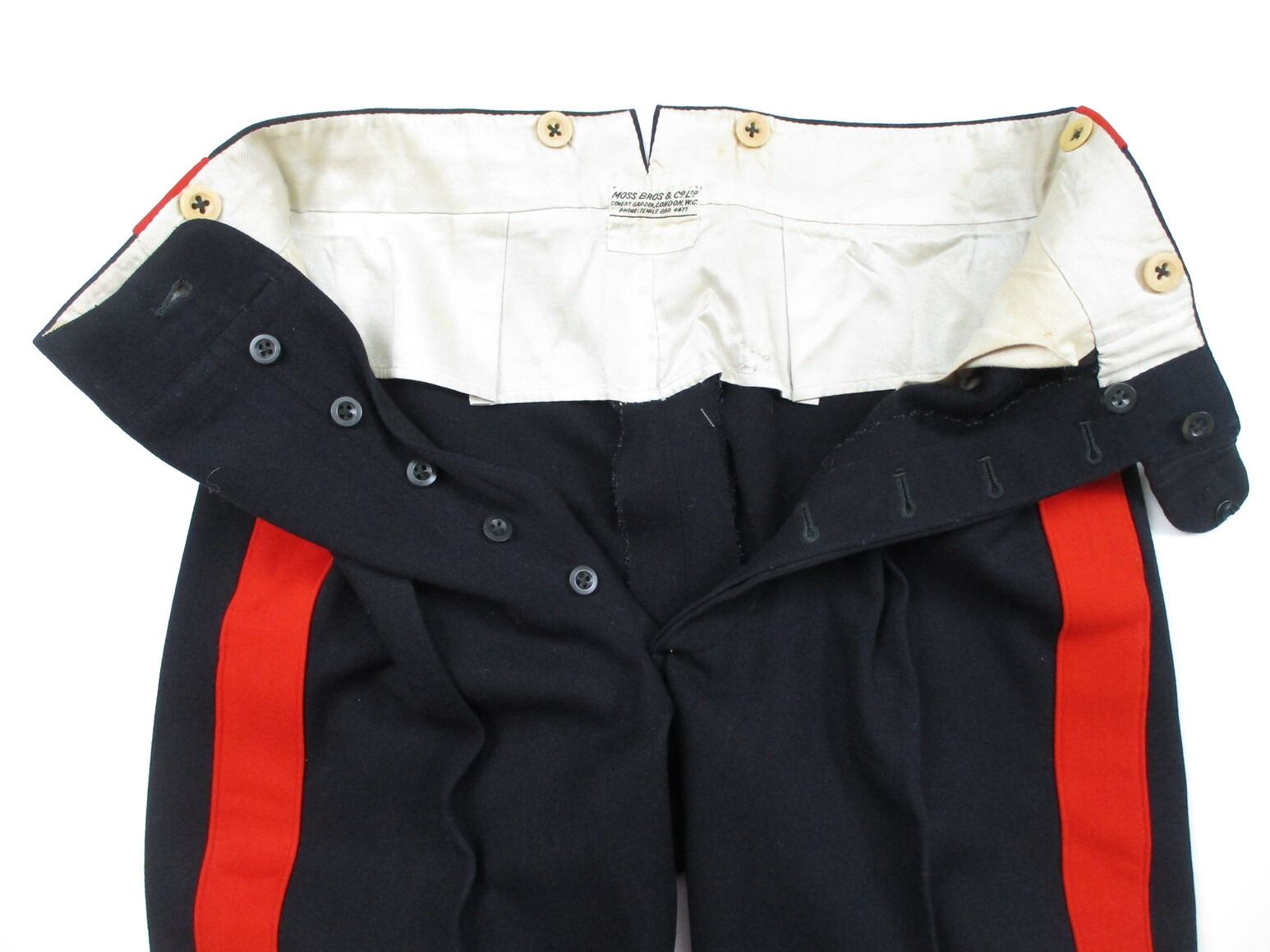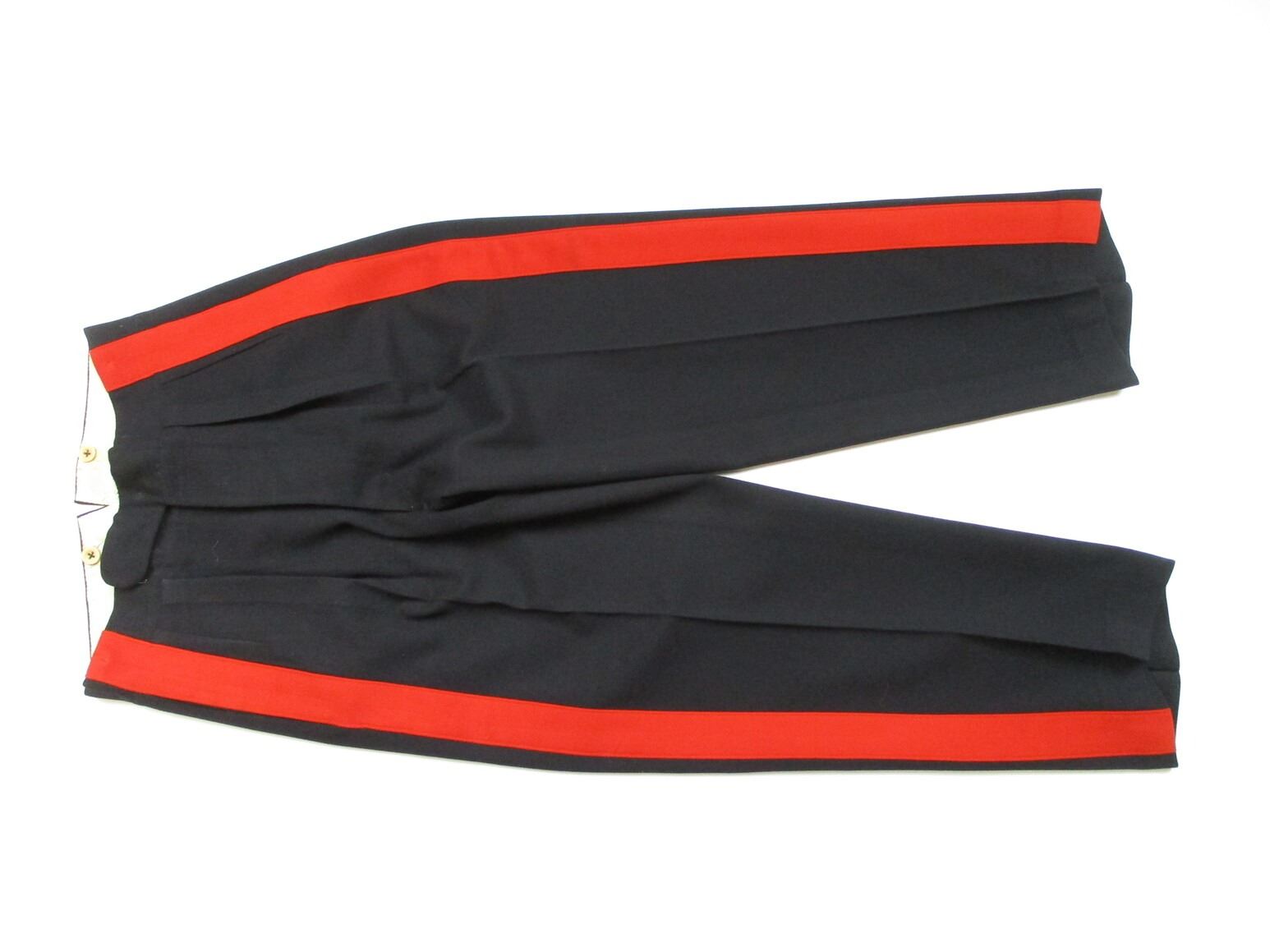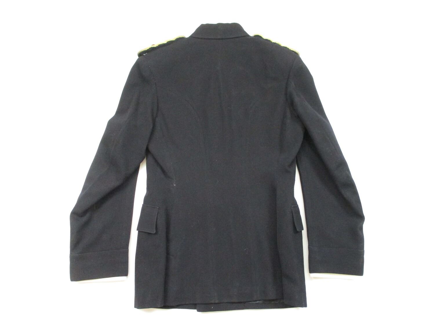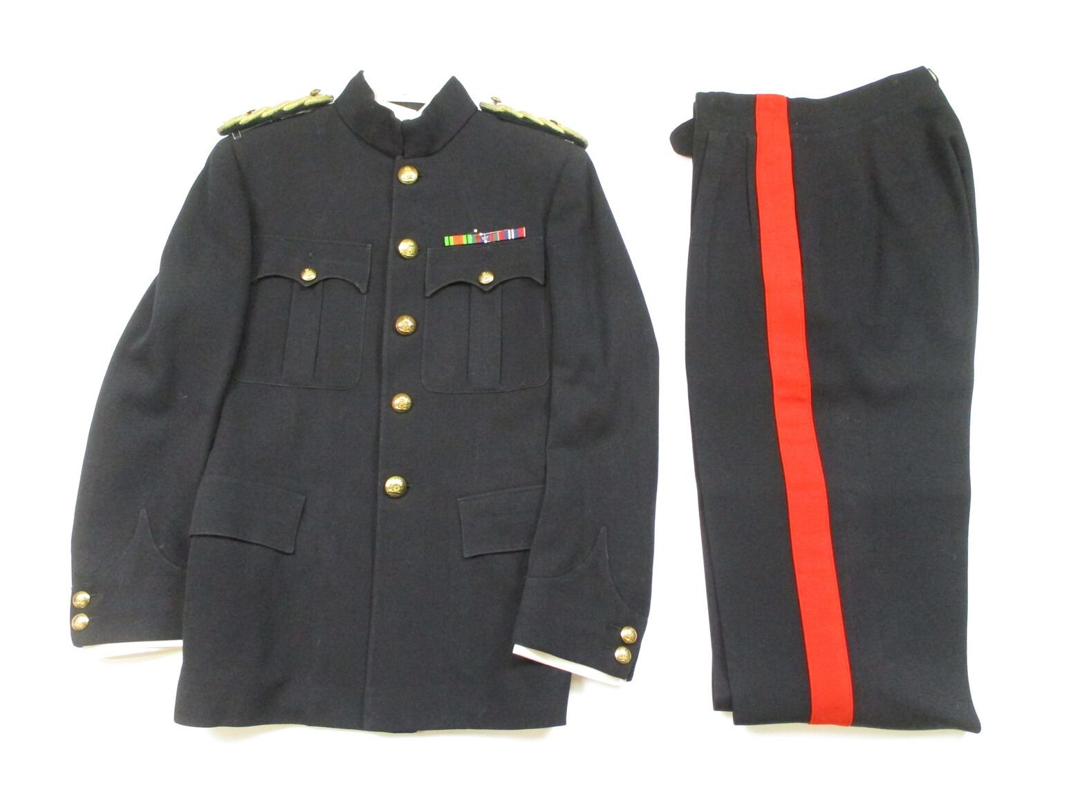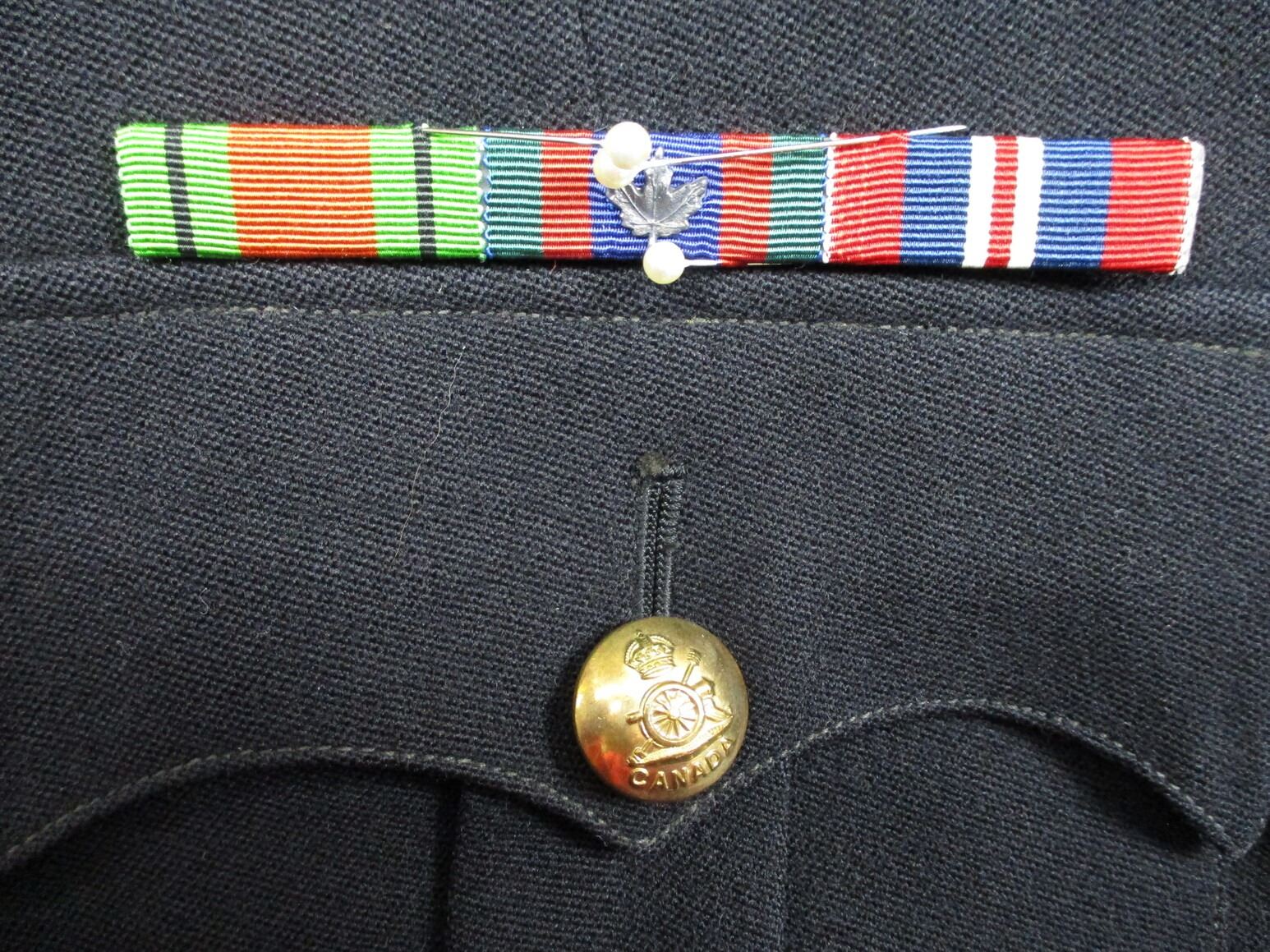 CANADIAN MILITARY PATROL DRESS UNIFORM, LOT INCLUDES; (1) BLUE DRESS JACKET, ROYAL CANADIAN ARTILLERY, MAJOR RANKING WITH RIBBON BAR (DEFENCE MEDAL, CANADIAN VOLUNTEER SERVICE, WAR MEDAL 1939-1945), GOLD SHOULDER CORDS, MARKED: "MOSS BROS & CO. LTD.", SHOULDER WIDTH APPROX. 17" & (1) PAIR OF BLUE DRESS PANTS WITH RED STRIPE, FLY-FRONT, MARKED: "MOSS BROS & CO. LTD." & OTHER FAINT / UN-CLEAR MARKINGS, WAIST APPROX. 30". SEE PHOTOS.