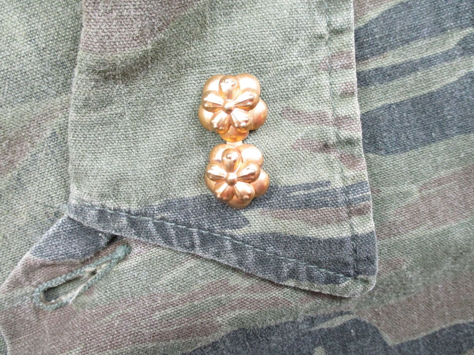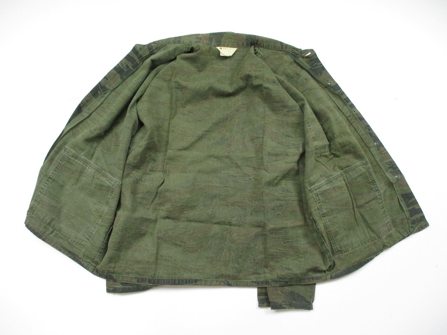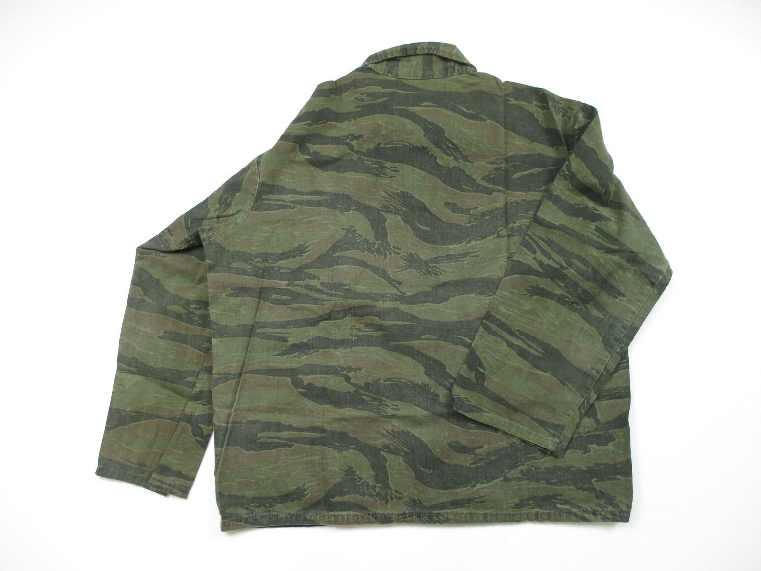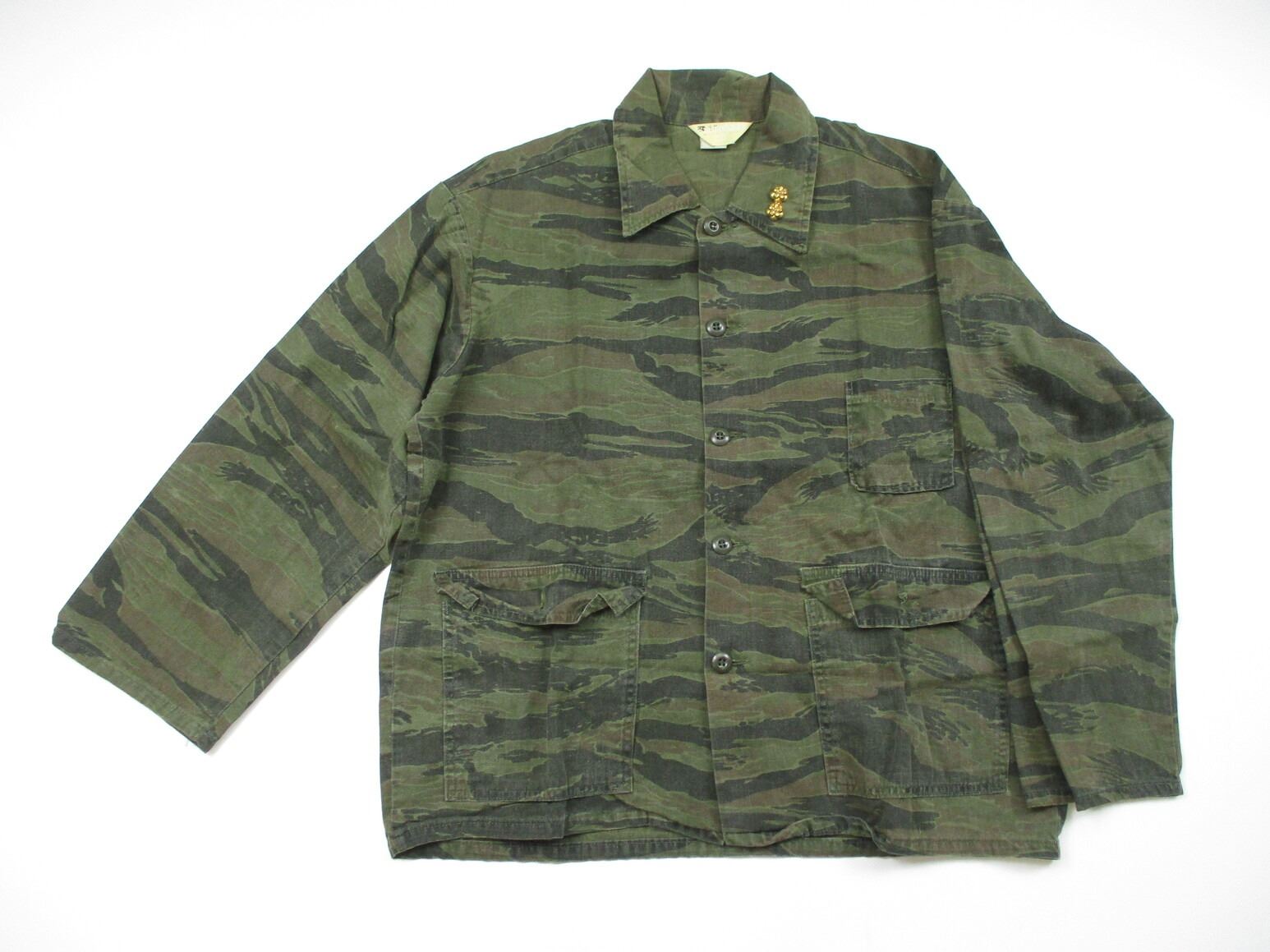 SOUTH VIETNAMESE MILITARY VIETNAM WAR SHIRT, (1) TIGERSTRIPE CAMO FIELD SHIRT, RANK INSIGNIA INDICATES SOUTH VIETNAMESE ARMY LIEUTENANT, FAINT / UN-CLEAR LABELS INDICATE U.S. MANUFACTURING, SHOULDER WIDTH APPROX. 20.5". SEE PHOTOS.
