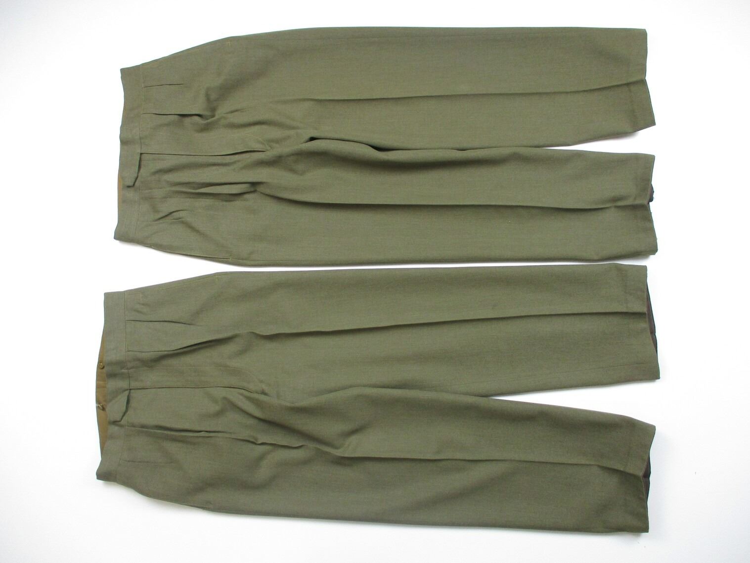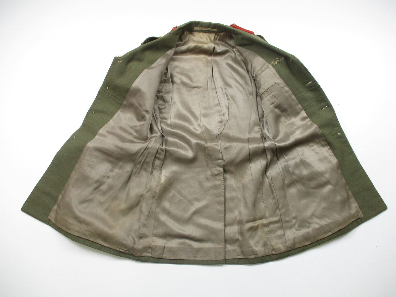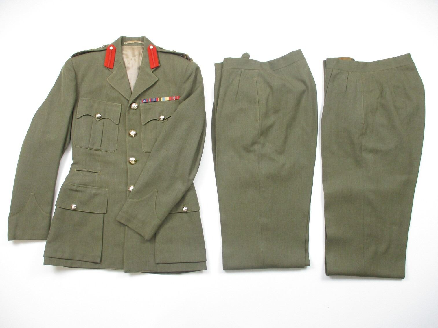 KOREA WAR ERA CANADIAN MILITARY DRESS UNIFORM, LOT INCLUDES; (1) GREEN WOOL JACKET, BRIGADIER GENERAL RANKING WITH RIBBON BAR (CANADIAN VOLUNTEER SERVICE (WITH MAPLE LEAF PIN), WAR MEDAL 1939-1945, UNITED NATIONS EMERGENCY FORCE 1 & CANADIAN FORCES DECORATION (WITH FLOWER PIN), SCARLET GORGET PATCHES, NO VISIBLE MARKINGS, SHOULDER WIDTH APPROX. 17" & (2) PAIRS OF GREEN DRESS PANTS, NO VISIBLE MARKINGS, WAIST APPROX 26". SEE PHOTOS.