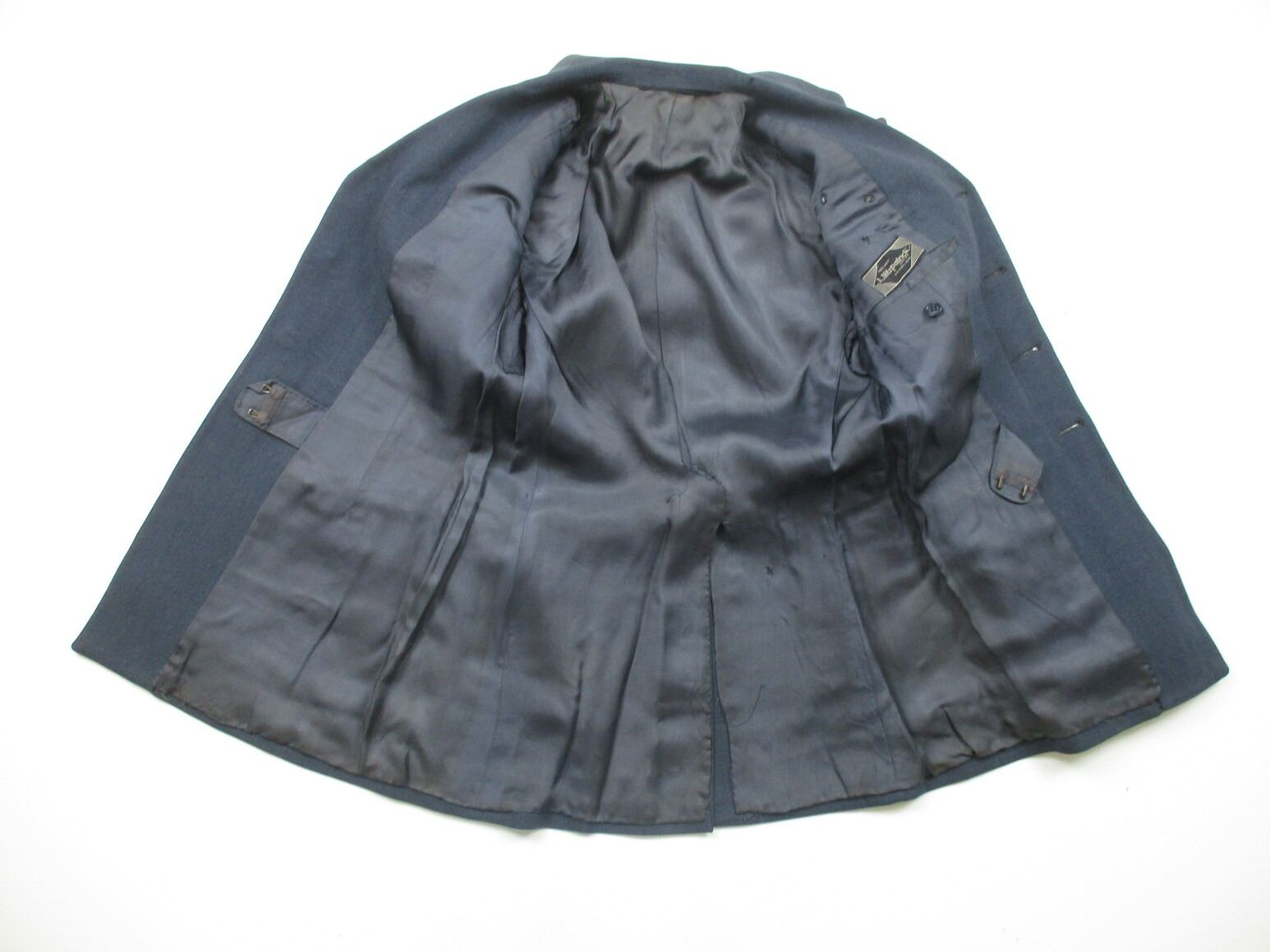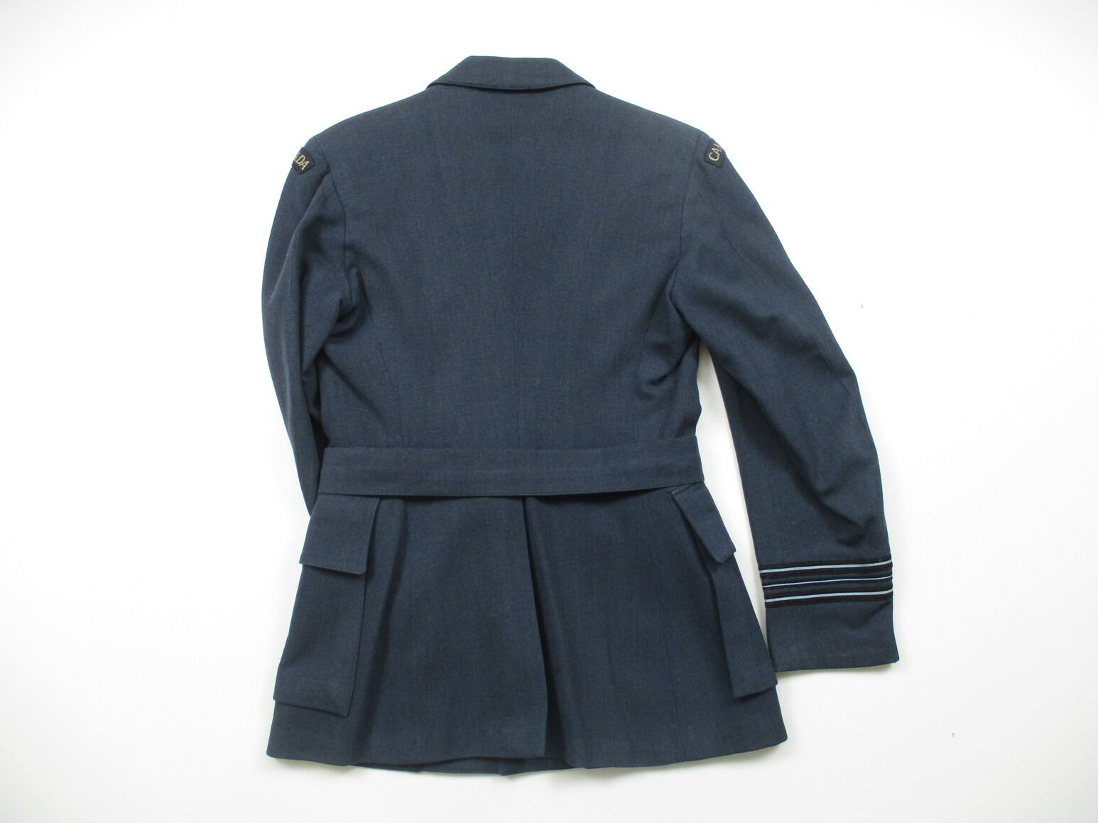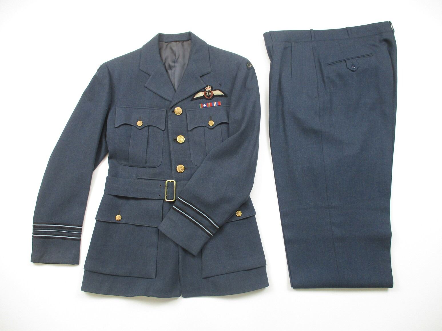 RCAF SERVICE DRESS UNIFORM, LOT INCLUDES; (1) BLUE JACKET, MAJOR RANK WITH PILOT WINGS, RIBBON BAR (CANADIAN VOLUNTEER SERVICE & WAR MEDAL 1939-1945) & BELT, MARKED: "MEN'S WEAR, J.J. FITZPATRICK & CO. LTD., CALGARY, ALTA.", SHOULDER WIDTH APPROX. 16.5" & (1) PAIR OF BLUE PANTS, NO VISIBLE MARKINGS, WAIST APPROX. 32". SEE PHOTOS.