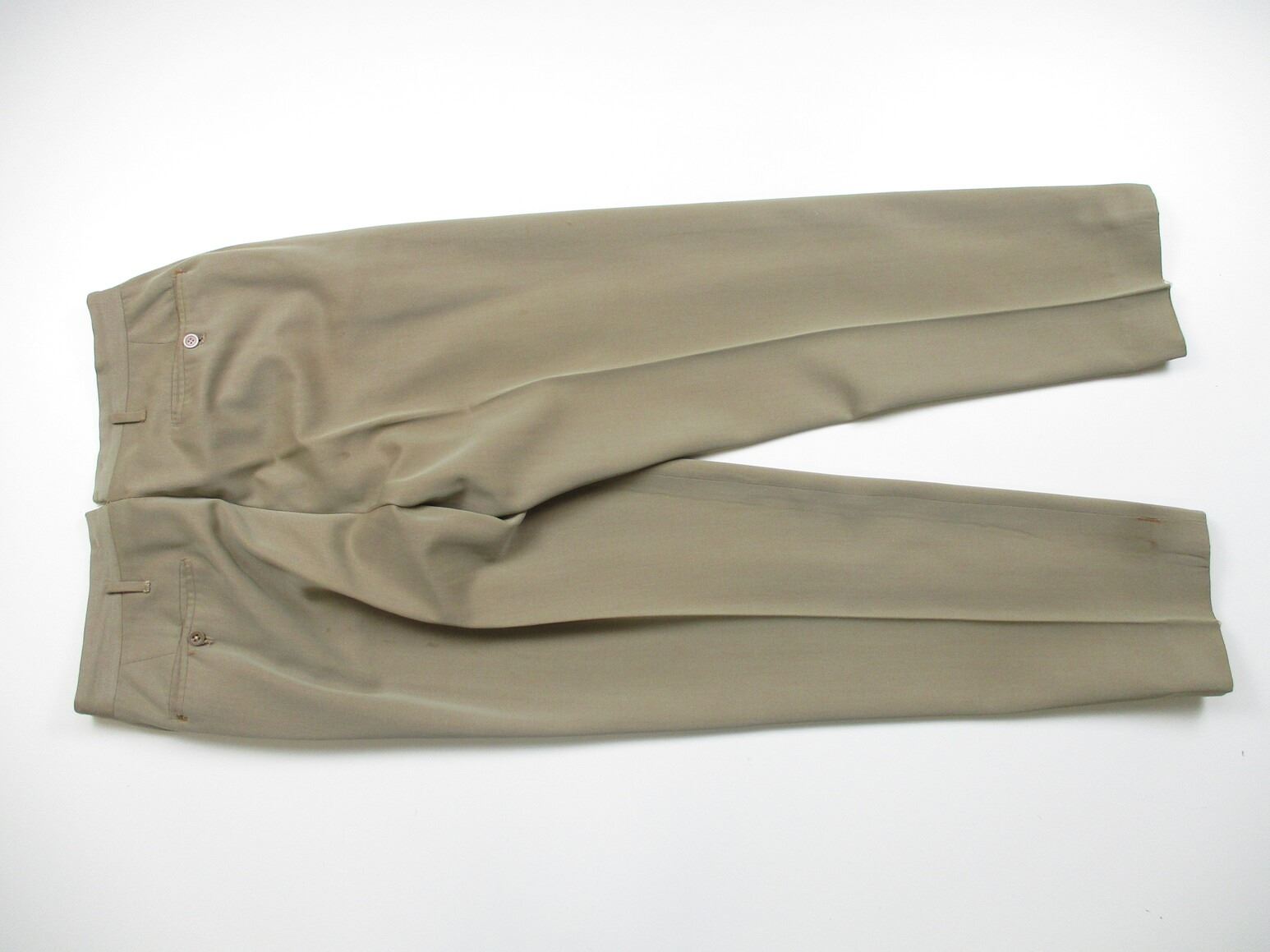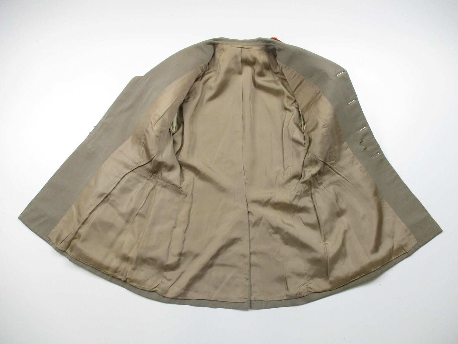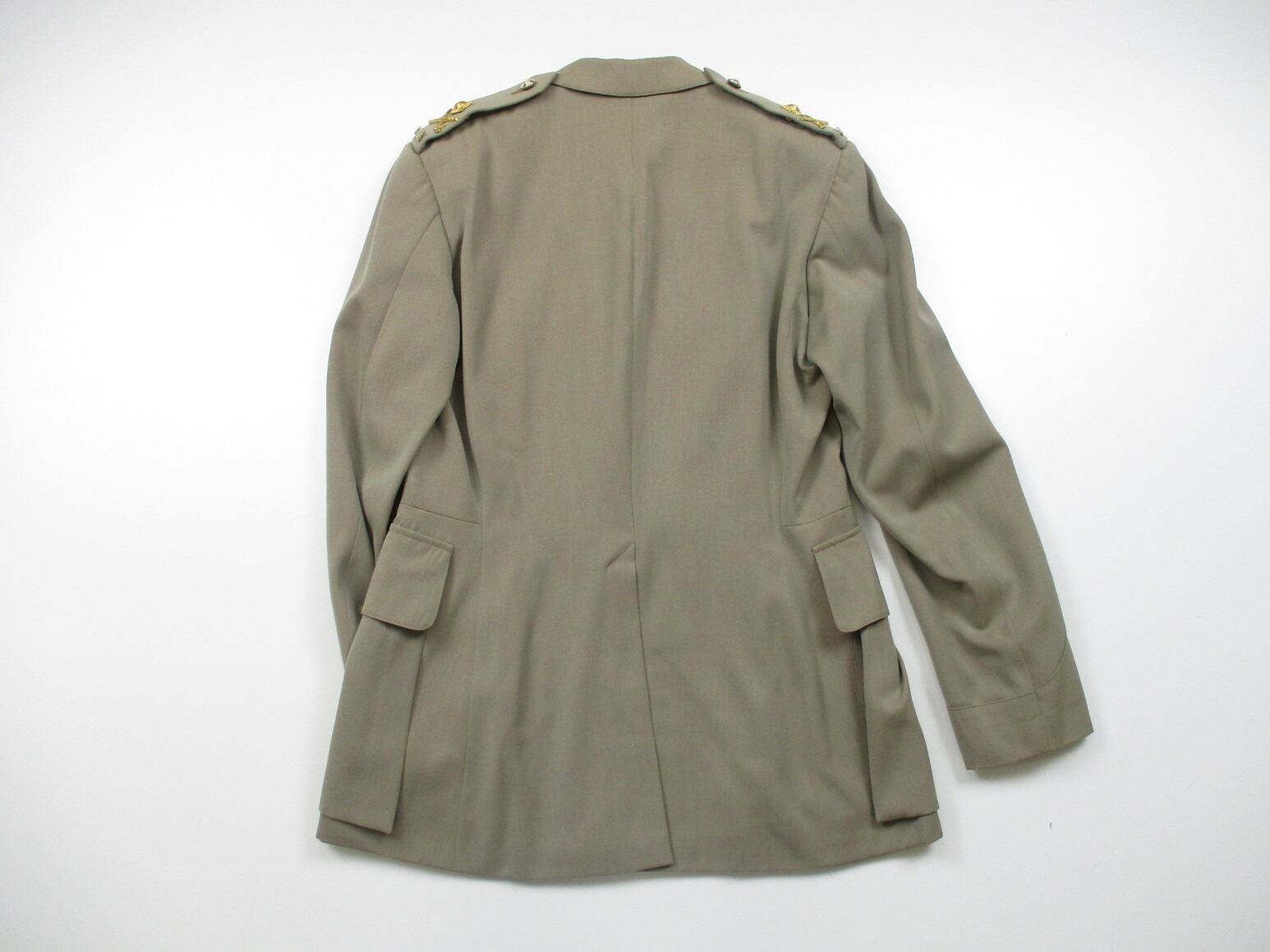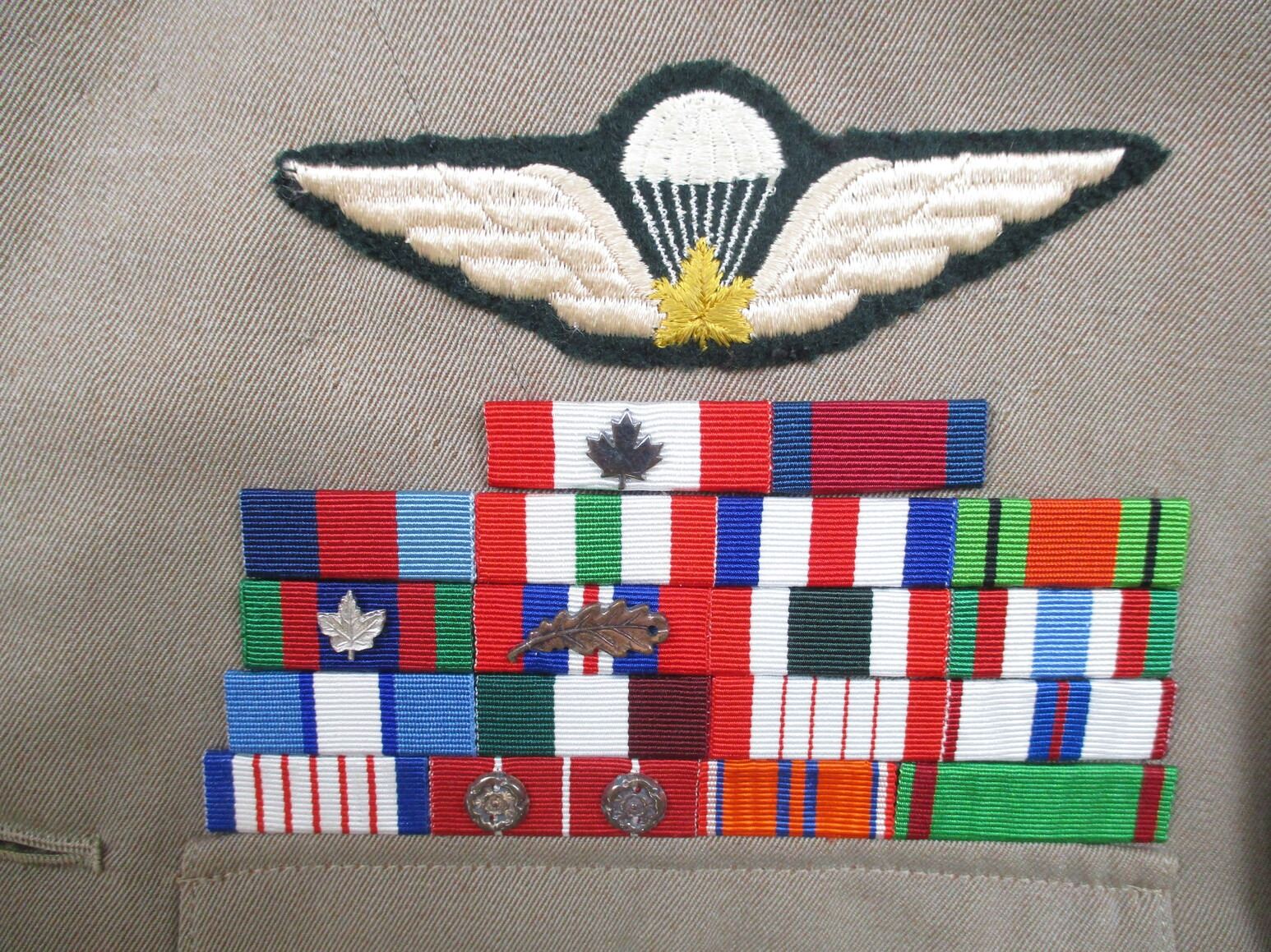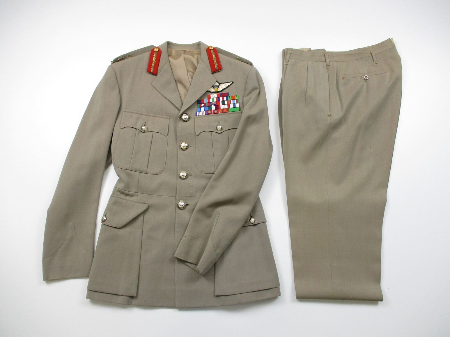 CANADIAN MILITARY DRESS UNIFORM, LOT INCLUDES; (1) TAN JACKET, MAJOR GENERAL RANKING WITH PARATROOPER WINGS & RIBBON BAR (MEMBER OF THE ORDER OF CANADA, DISTINGUISHED SERVICE ORDER, 1939-1945 STAR, ITALY STAR, FRANCE & GERMANY STAR, DEFENSE MEDAL, CANADIAN VOLUNTEER SERVICE (WITH MAPLE LEAF PIN), WAR MEDAL 1939-1945 (WITH OAK LEAF PIN), ETC.), SCARLET GORGET PATCHES, NO VISIBLE MARKINGS, SHOULDER WIDTH APPROX. 17.5" & (1) PAIR TAN PANTS, NO VISIBLE MARKINGS, WAIST APPROX 29". SEE PHOTOS.