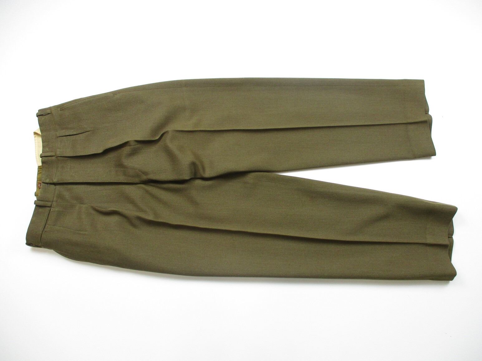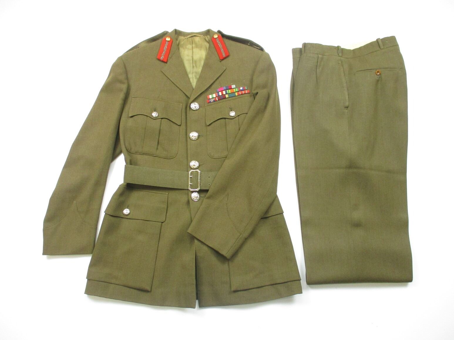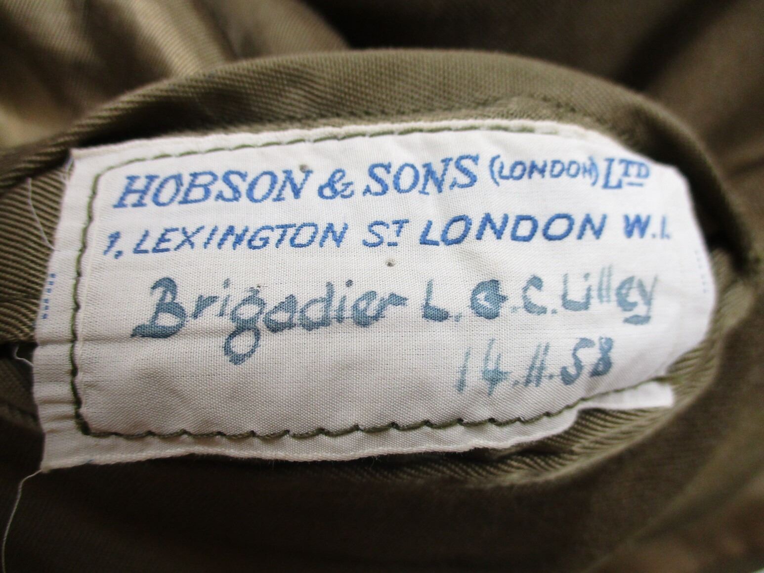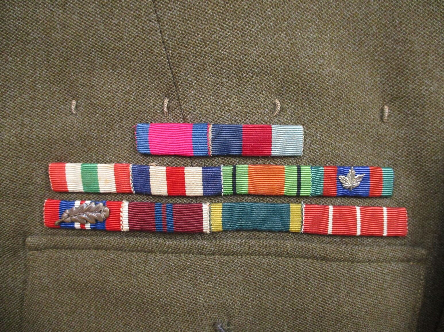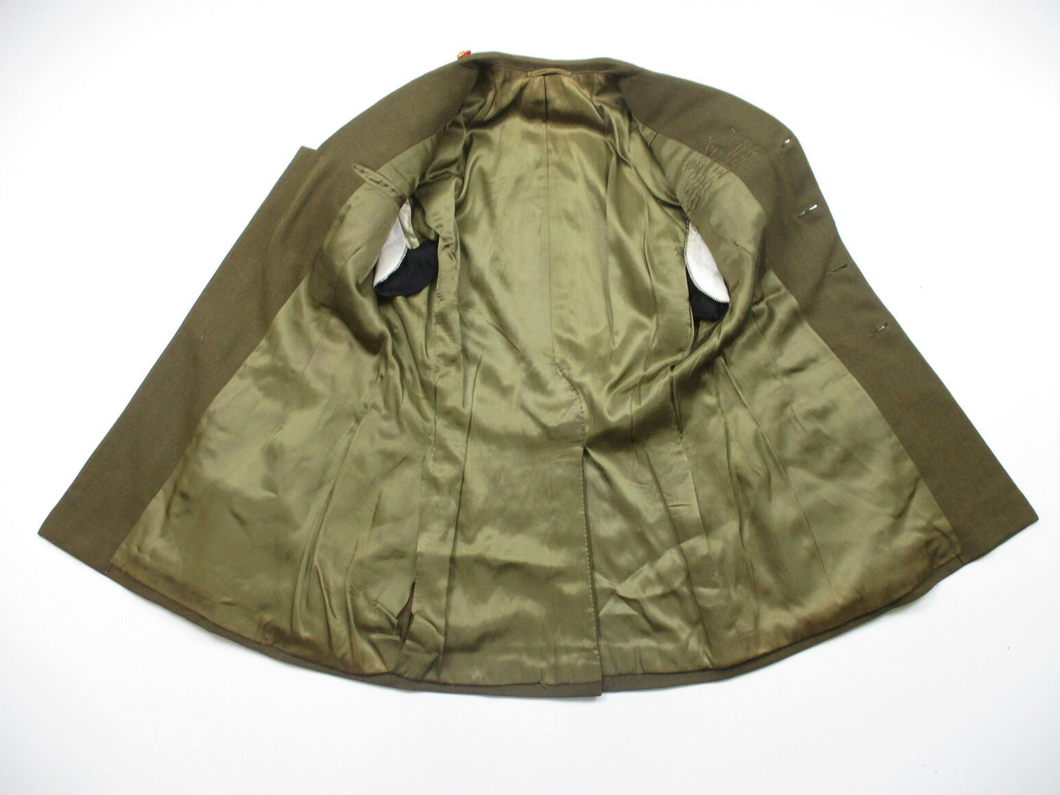 CANADIAN MILITARY DRESS UNIFORM, LOT INCLUDES; (1) GREEN JACKET, LIEUTENANT GENERAL RANK WITH RIBBON BAR (DISTINGUISHED SERVICE ORDER, 1939-1945 STAR, ITALY STAR, FRANCE & GERMANY STAR, DEFENSE MEDAL, CANADIAN VOLUNTEER SERVICE (WITH MAPLE LEAF PIN), WAR MEDAL 1939-1945 (WITH OAK LEAF PIN), ETC.), SCARLET GORGET PATCHES, MARKED: "HOBSON & SONS (LONDON) LTD., 1, LEXINGTON ST LONDON W.I., BRIGADIER L.G.C. LILLEY, 14.11.58", SHOULDER WIDTH APPROX. 19" & (1) PAIR OF GREEN PANTS, BUTTON FLY FRONT, NO VISIBLE MARKINGS, WAIST APPROX 31". SEE PHOTOS.