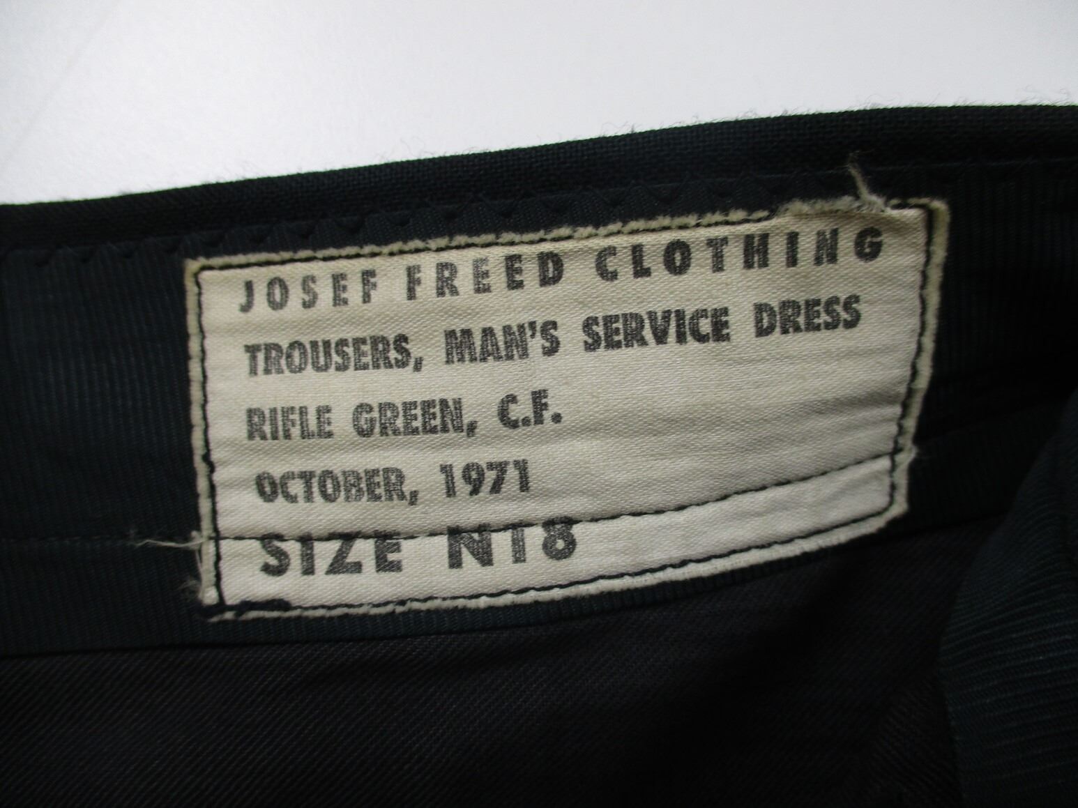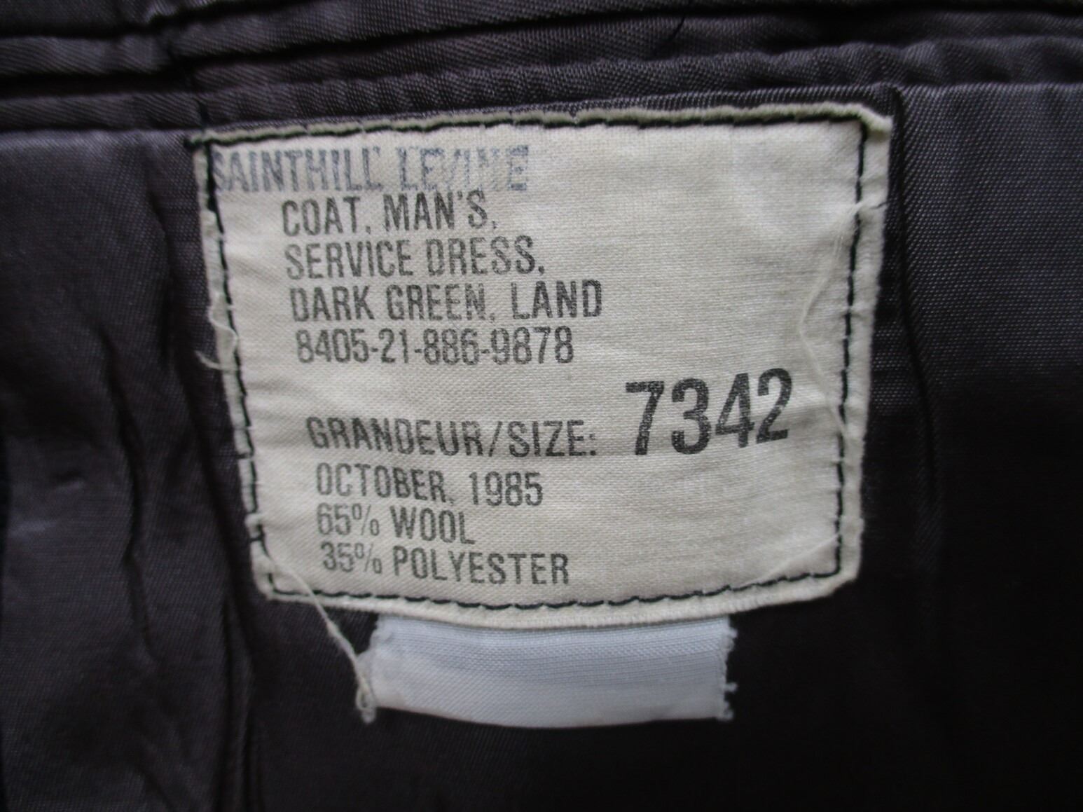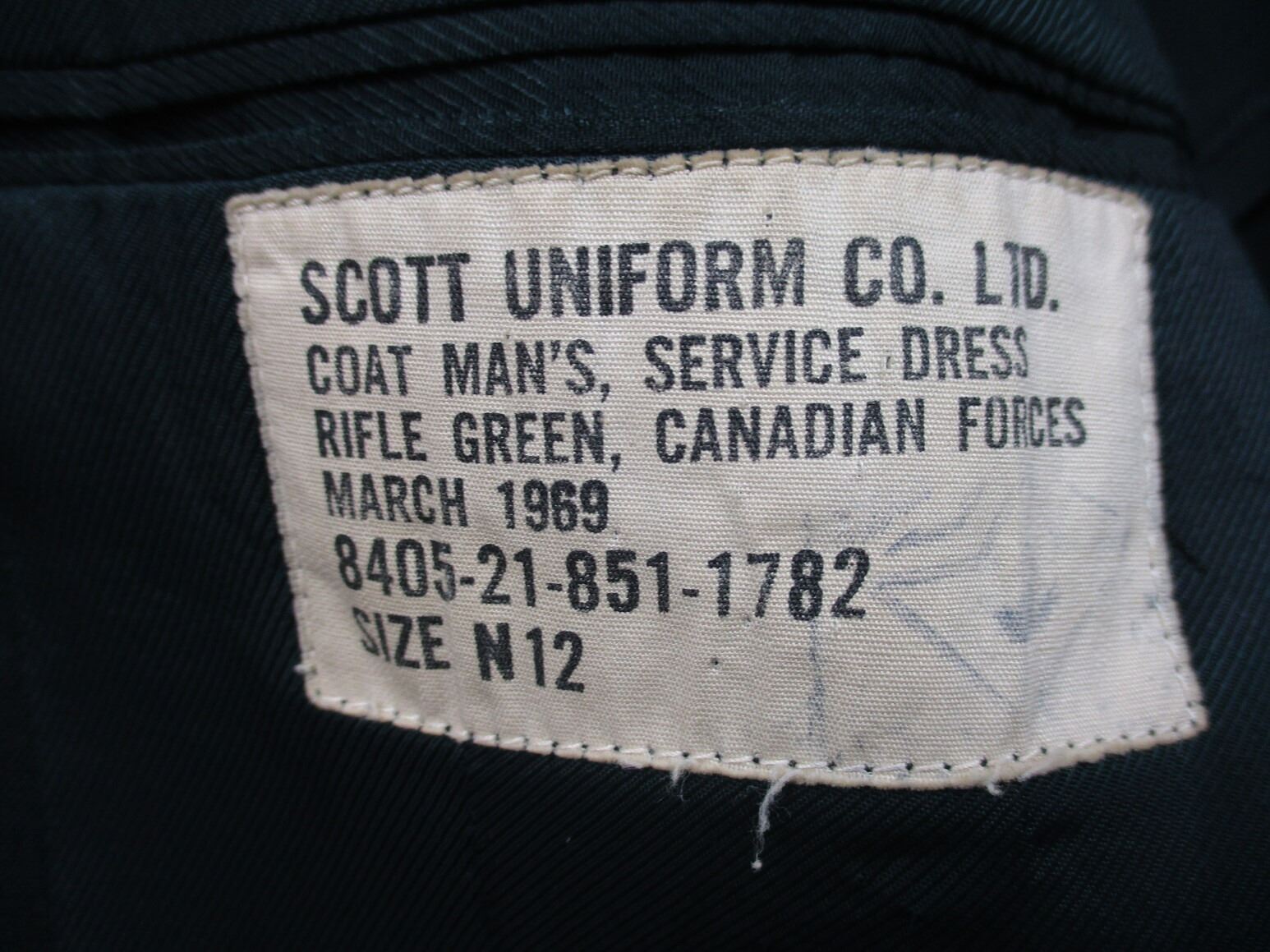 CANADIAN MILITARY DRESS UNIFORM LOT, LOT INCLUDES; (2) DARK GREEN JACKETS, BOTH COLONEL RANK, ONE WITH ROYAL CANADIAN ARTILLERY PINS, ONE MARKED: "SCOTT UNIFORM CO. LTD., COAT MAN'S SERVICE DRESS, MARCH 1969, SIZE N12", ETC., OTHER ONE MARKED: "COAT MAN'S SERVICE DRESS, OCTOBER 1985, SIZE: 7342", ETC. & (2) PAIRS GREEN PANTS, ONE MARKED: "TROUSERS, MEN'S, S.D. HVY. WT., LAND, SIZE 6730", ETC. OTHER ONE MARKED: "TROUSERS, MAN'S SERVICE DRESS, OCTOBER 1971, SIZE N18", ETC. SEE PHOTOS.