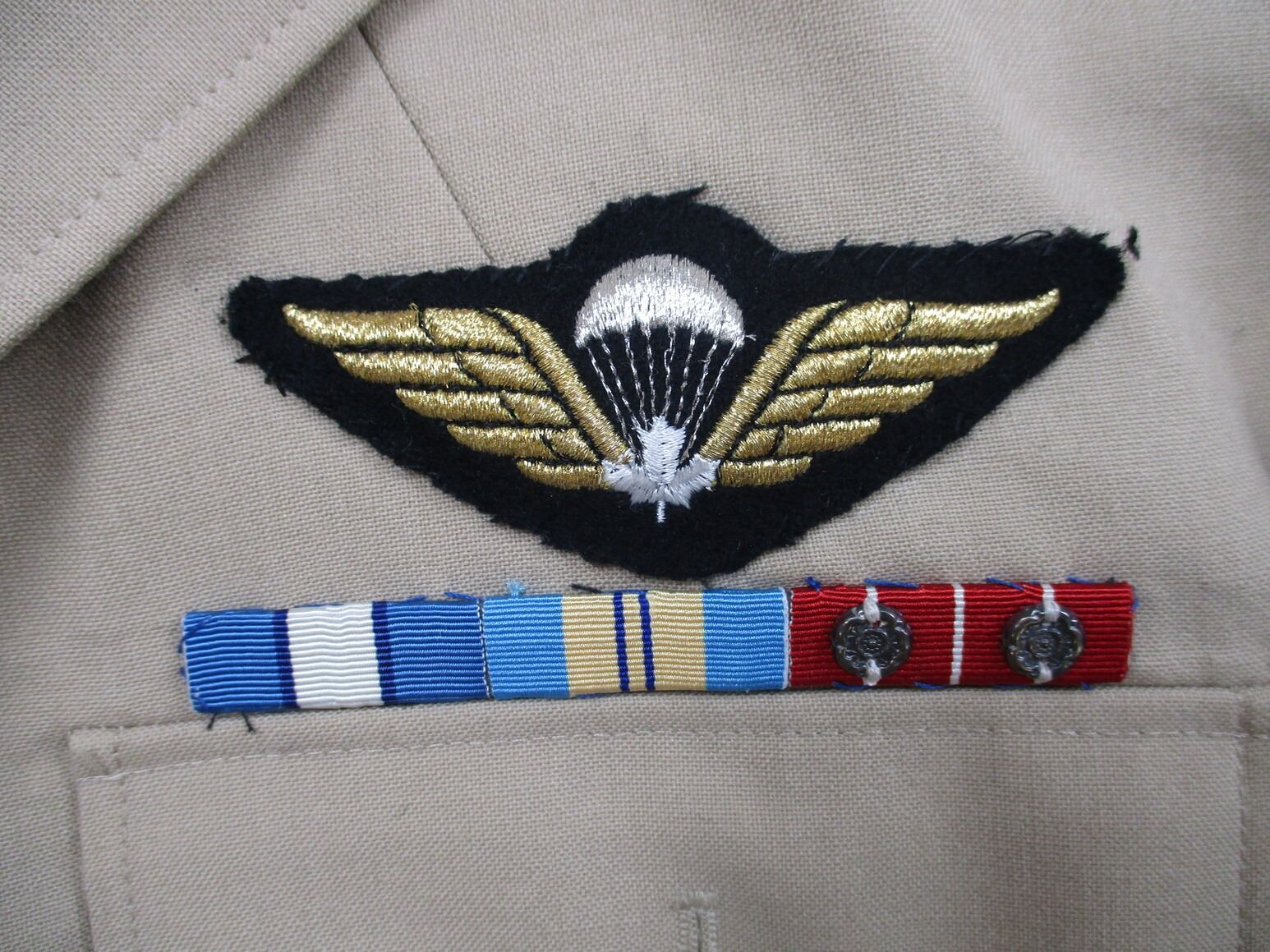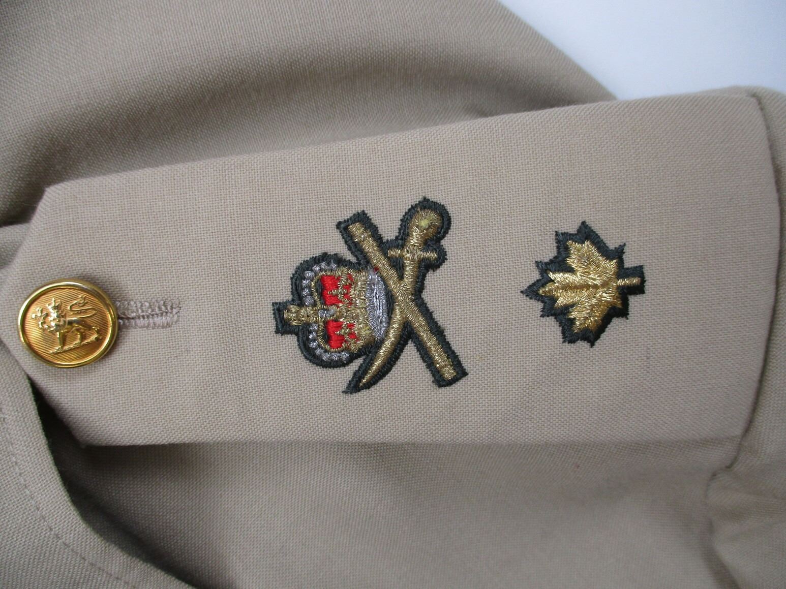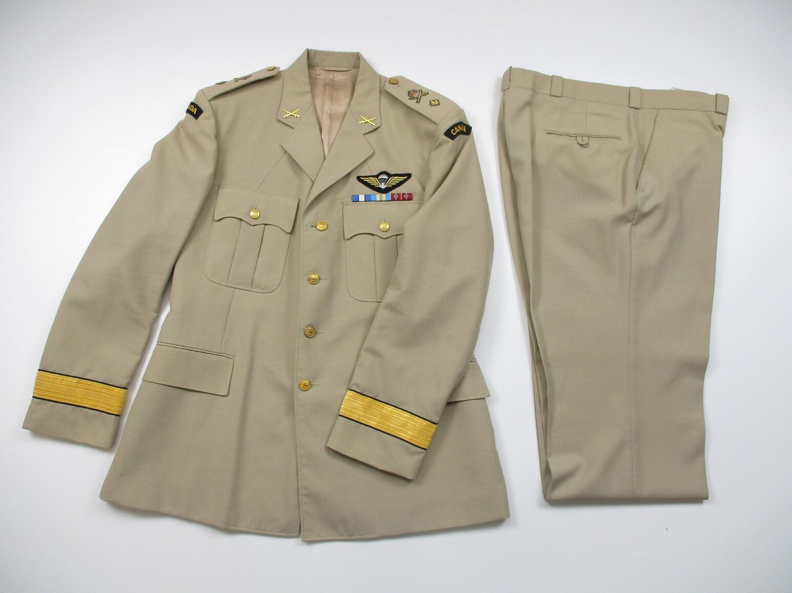 CANADIAN MILITARY DRESS UNIFORM, LOT INCLUDES; (1) TAN JACKET, BRIGADIER GENERAL RANK WITH OPERATIONAL PARACHUTIST WINGS & RIBBON BAR (U.N. FORCES IN CYPRUS, U.N. EMERGENCY FORCE MIDDLE EAST & CANADIAN FORCES DECORATION (WITH 2 FLOWER PINS), CROSSED-SWORDS PINS ON COLLAR (INFANTRY GENERAL OFFICER), MARKED: "SIZE: 7344" & OTHER VARIOUS MARKINGS & (1) PAIR TAN PANTS, MARKED: "SIZE: 7038" & OTHER VARIOUS MARKINGS. SEE PHOTOS.