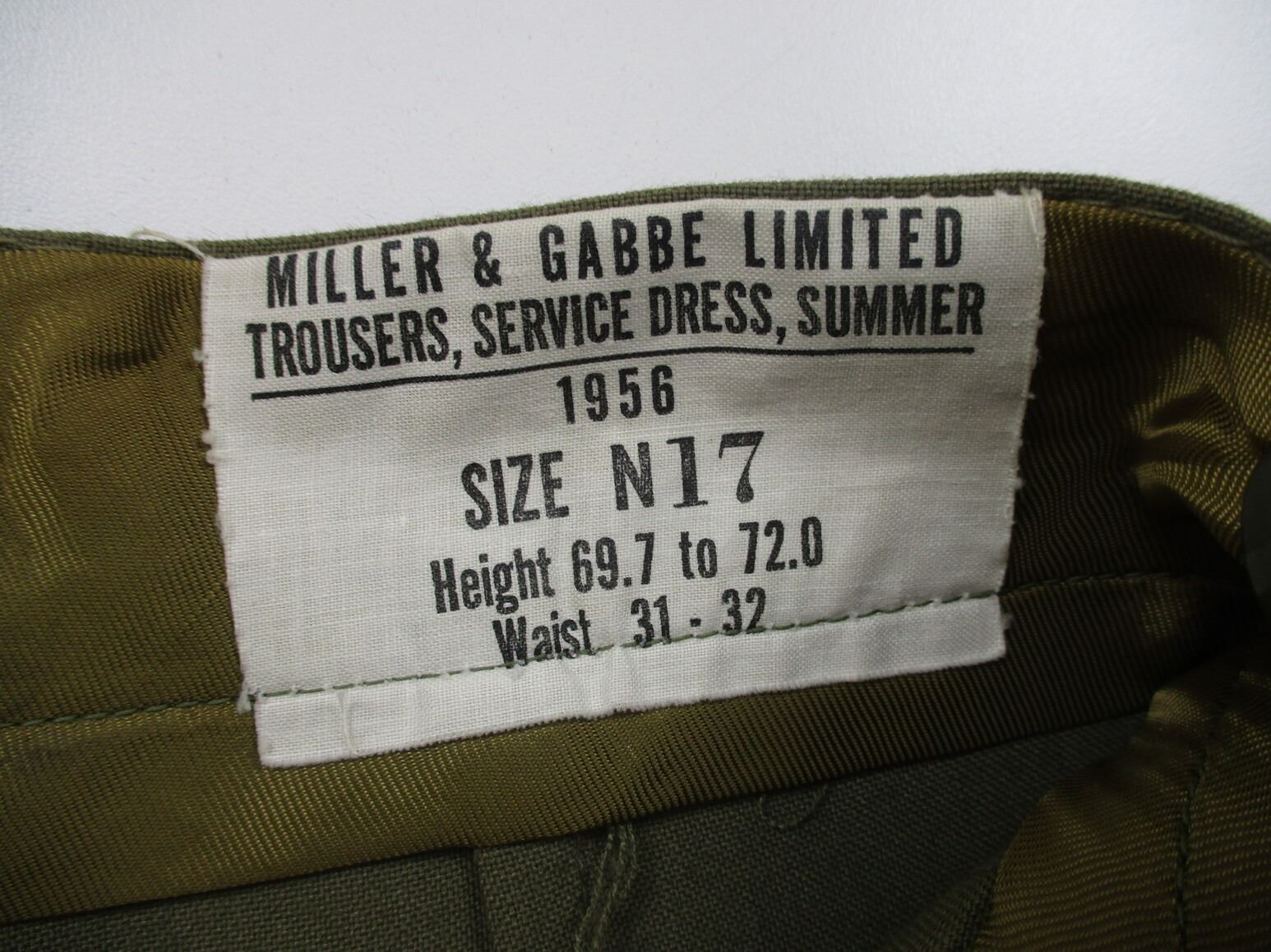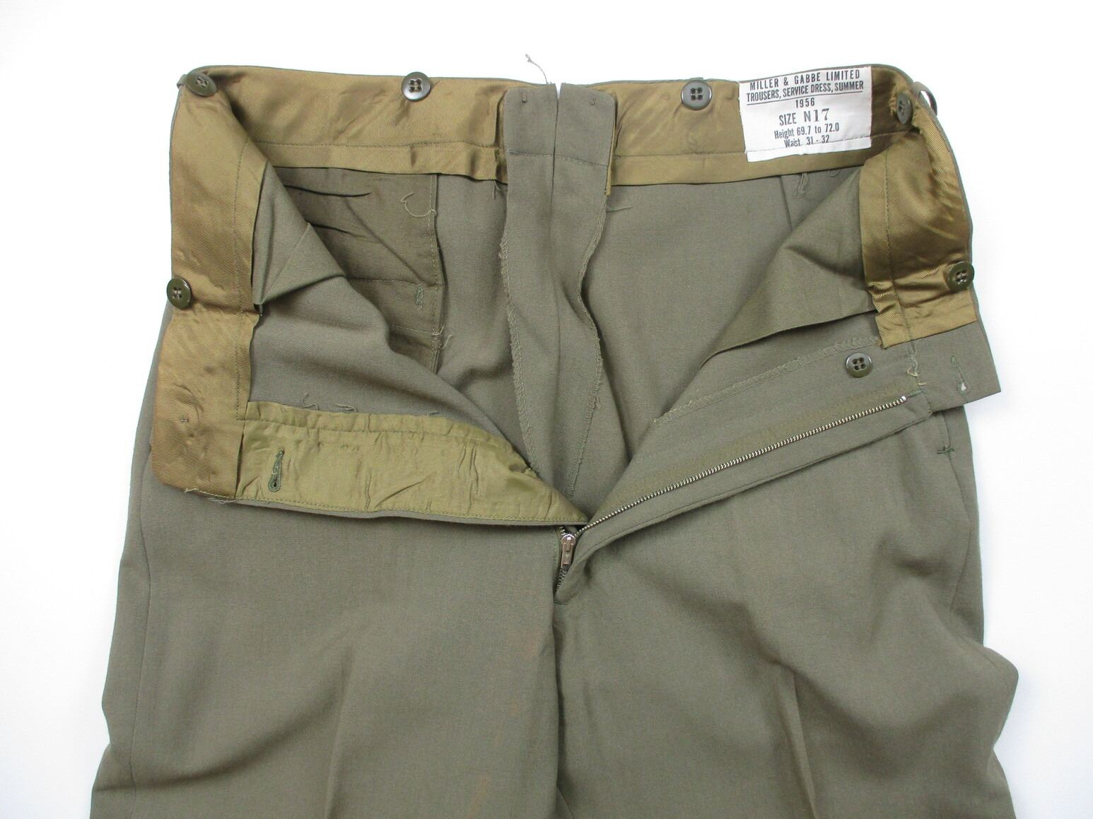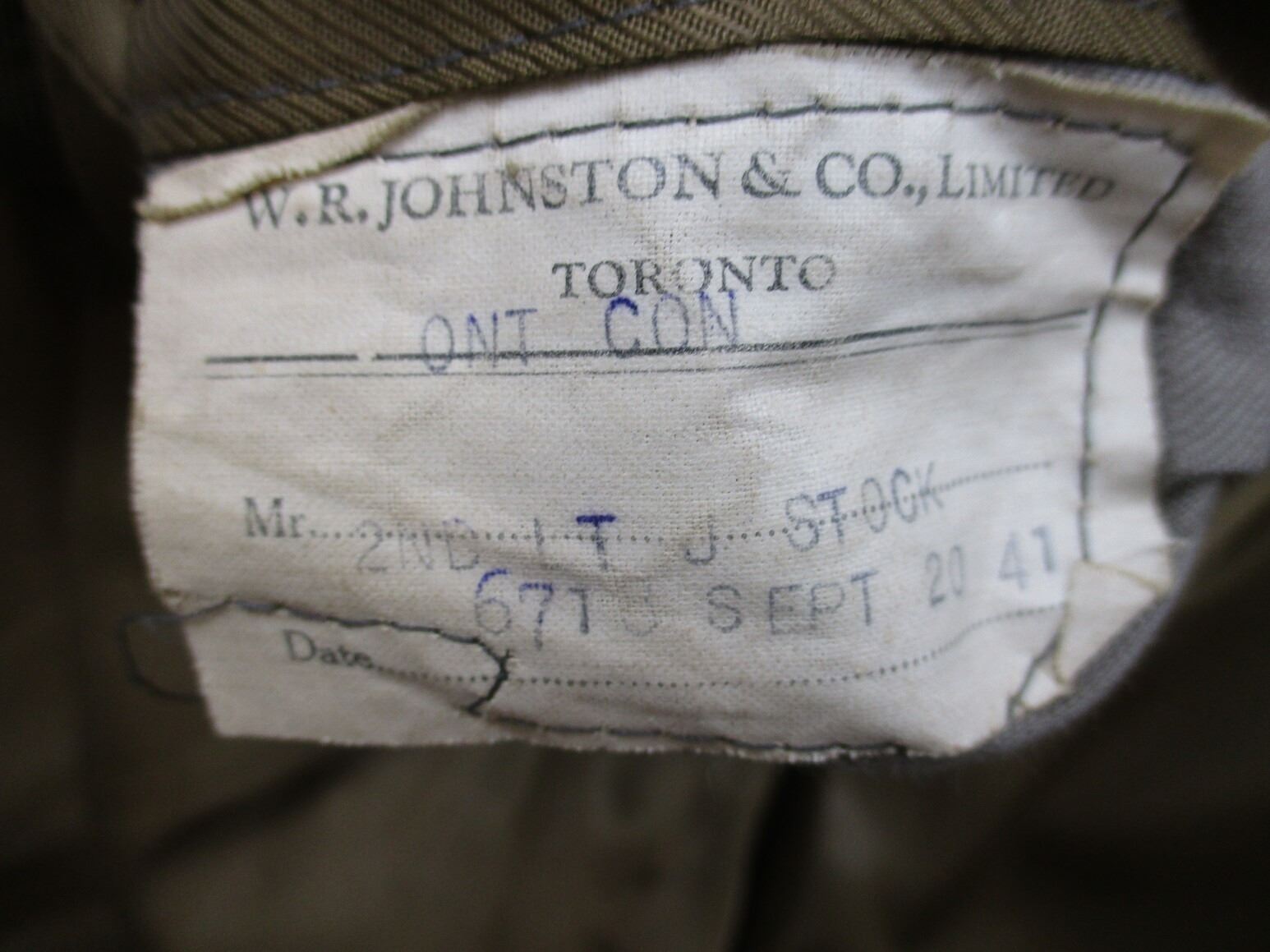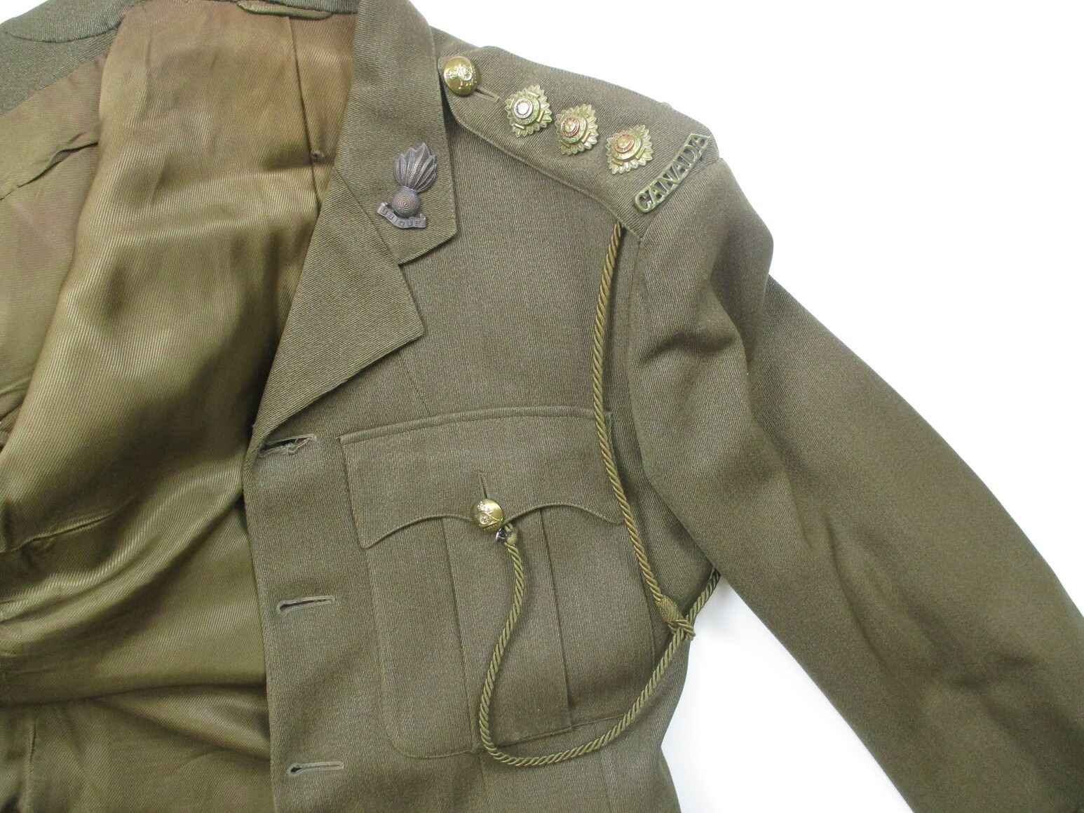 CANADIAN MILITARY DRESS JACKET AND DRESS PANTS LOT, LOT INCLUDES; (1) GREEN, ROYAL CANADIAN ARTILLERY, CAPTAIN RANK, GREEN SHOULDER BRAID, METAL BELT HOOKS, MARKED: "JOHNSTON APPROVED CLOTHES" & "W.R. JOHNSTON & CO. LIMITED, TORONTO, ONT CANADA, 2ND LT. J STOCK, SEPT 20 1941", SHOULDER WIDTH APPROX. 16.5" & (1) PAIR GREEN PANTS, MARKED: "MILLER & GABBE LIMITED, TROUSERS, SERVICE DRESS, SUMMER, 1956, SIZE N17". SEE PHOTOS.