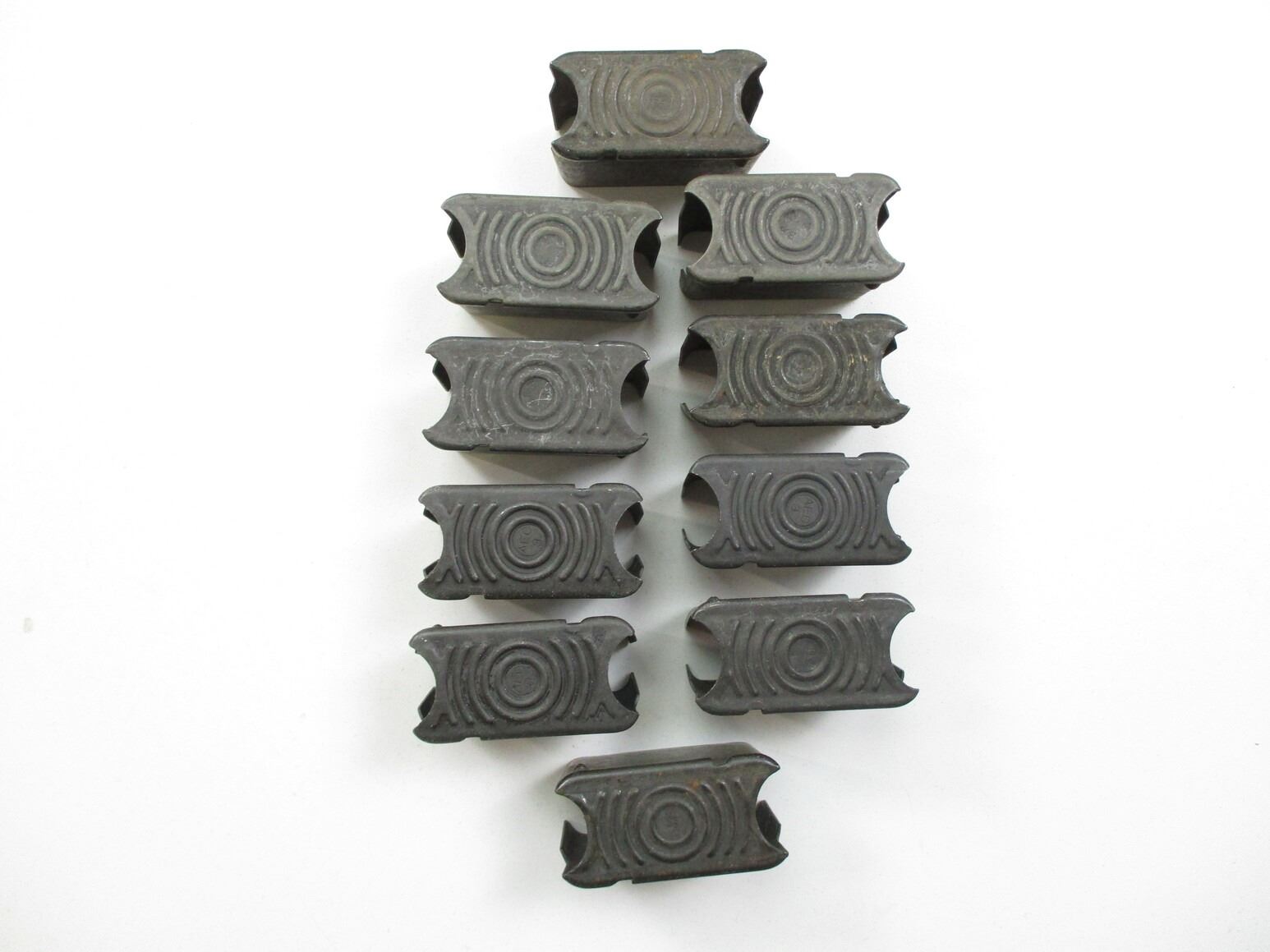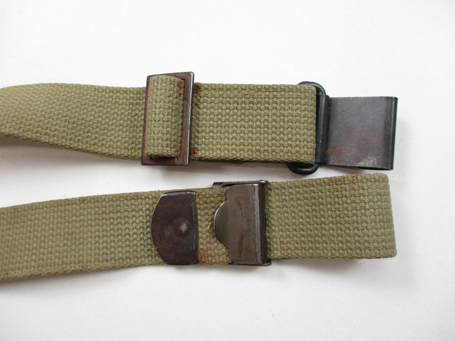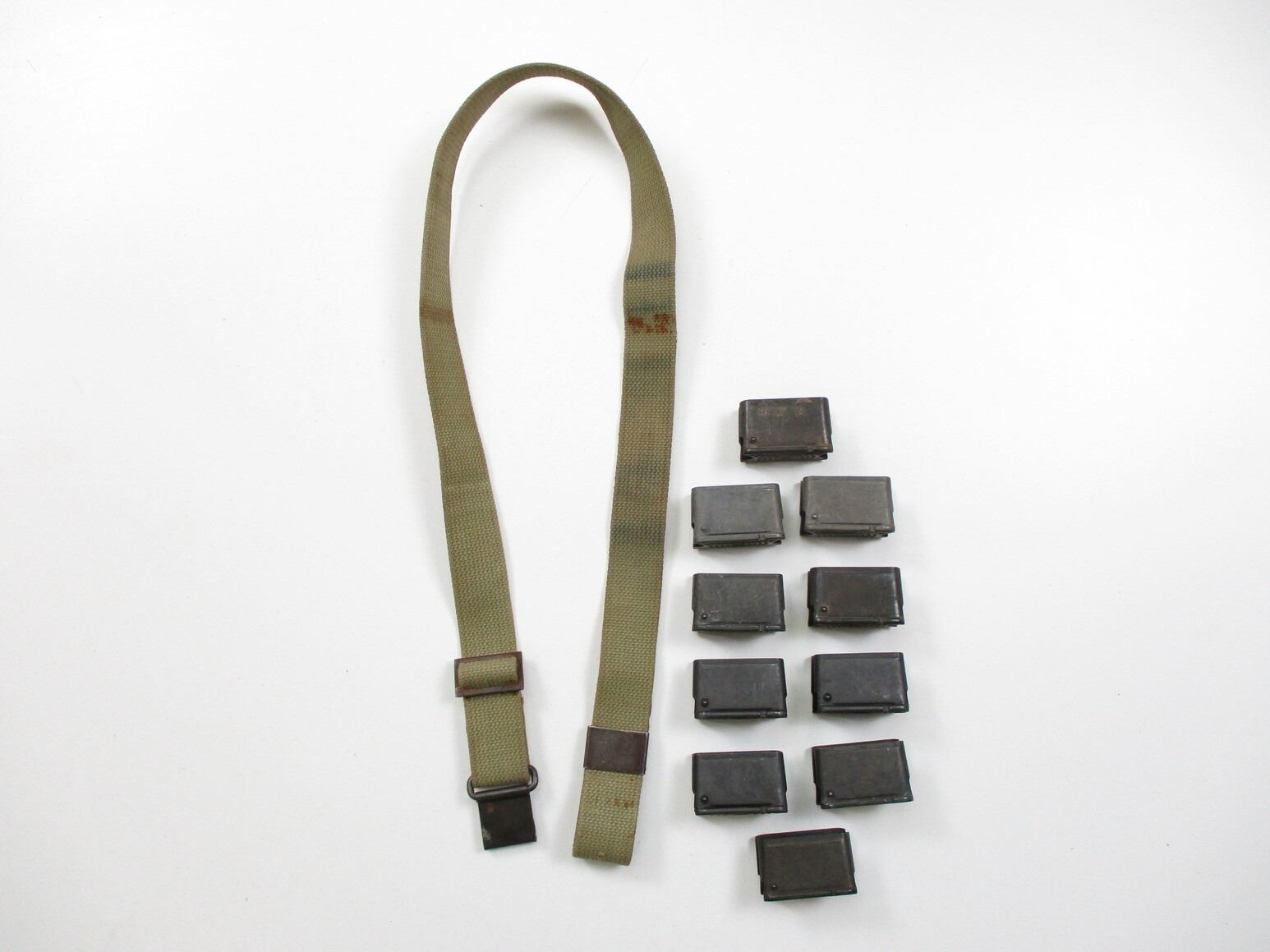 U.S. M1 GARAND ACCESSORIES LOT, LOT INCLUDES; (1) WWII TYPE GREEN CANVAS SLING WITH FLAT BUCKLE, OAL APPROX. 37", ADJUSTABLE & (10) .30-06, 8-RND ENBLOCS. SEE PHOTOS.