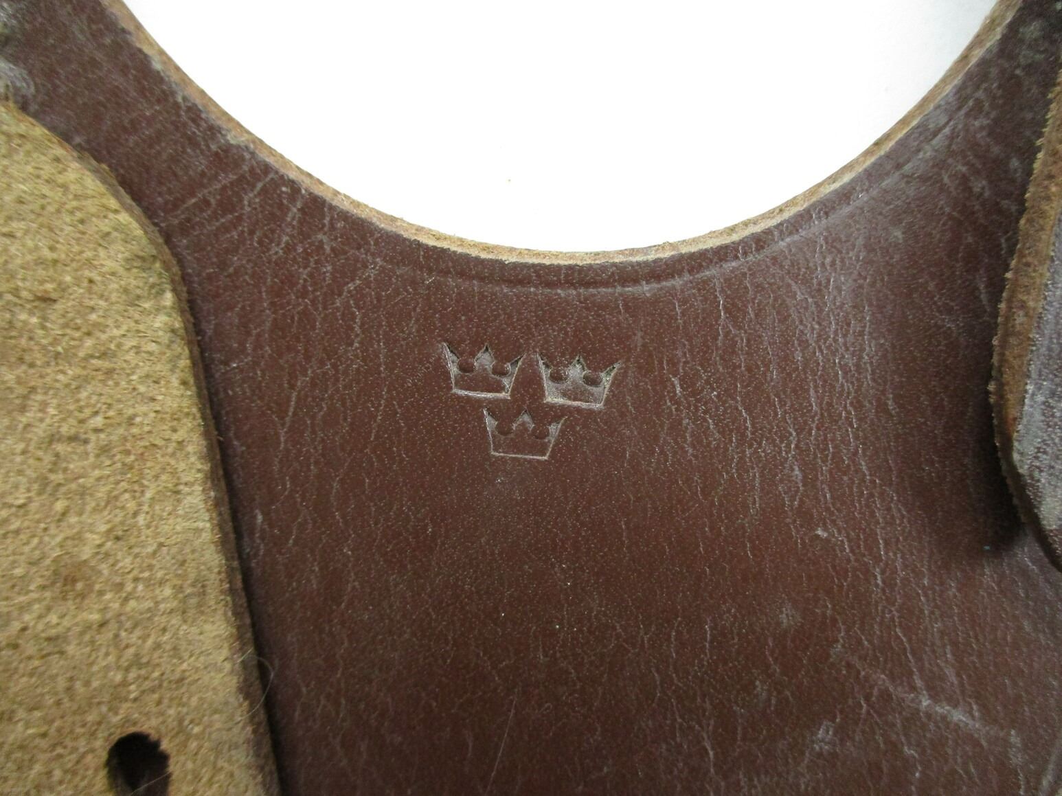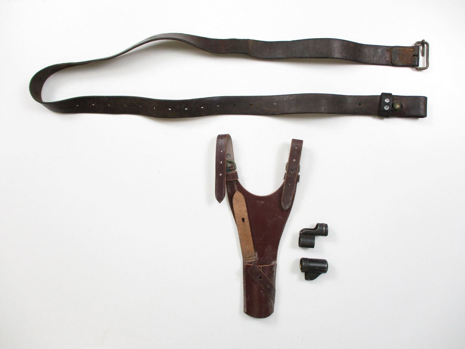 SWEDISH MAUSER ACCESSORIES LOT, LOT INCLUDES; (1) BROWN LEATHER BAYONET FROG, MARKED WITH THREE CROWNS, (1) BROWN LEATHER SLING, NO VISIBLE MARKINGS, OAL APPROX. 48", ADJUSTABLE & (2) DIFFERENT MUZZLE COVERS. SEE PHOTOS.