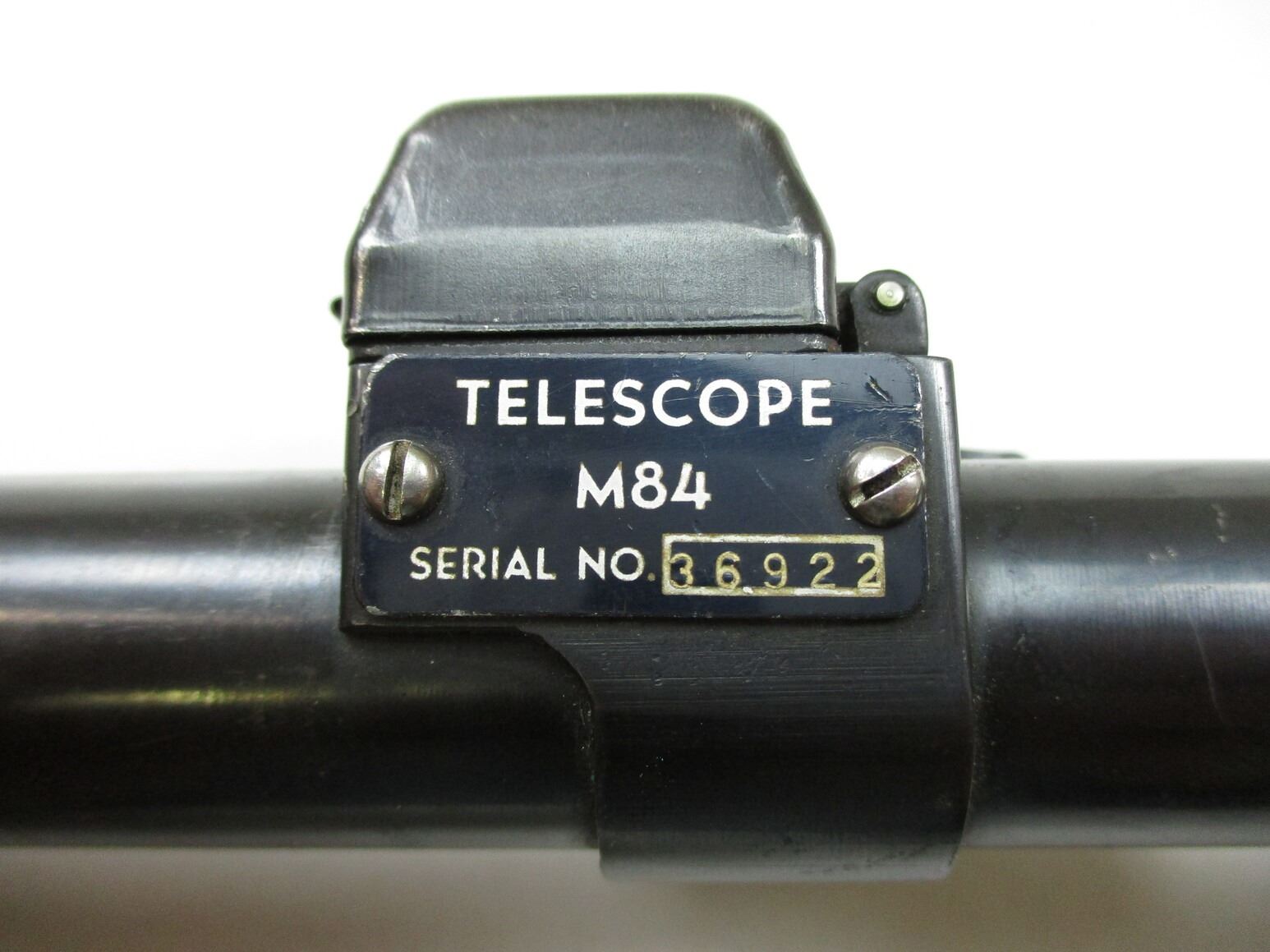 WWII U.S. M84 SNIPER SCOPE, FITS M1 GARAND RIFLES, CLEAR OPTICS WITH RETICLE, WITH EYE CUP, SLIDING SUN SHADE, ELEVATION & WINDAGE COVERS, MARKED: "TELESCOPE M84, SERIAL # 36922". LOT ALSO INCLUDES; NOS MRT CHEEK PAD & SPARE RUBBER EYE CUP. SEE PHOTOS.
