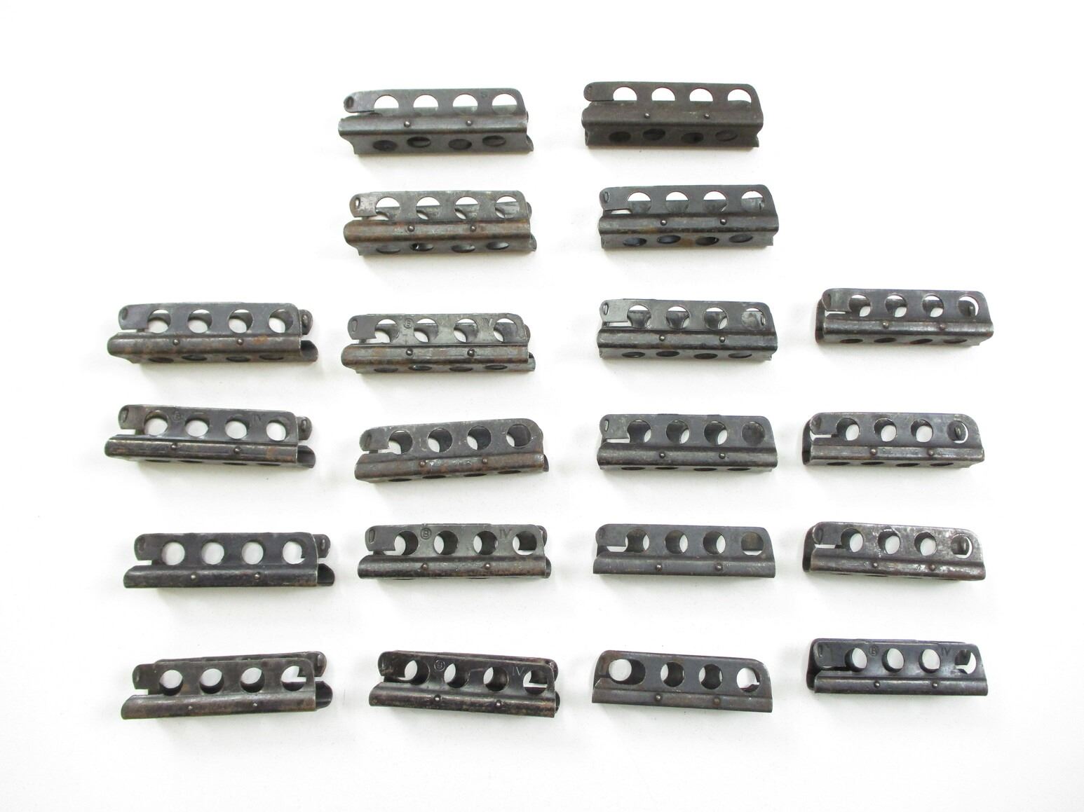 LEE ENFIELD STRIPPER CLIP LOT, (20) .303 BRITISH 5-RND STRIPPER CLIPS, BLUED STEEL, SOME MARKED: "BP", "IVS" & "BIV", ETC., SOME UN-MARKED. SEE PHOTOS.
