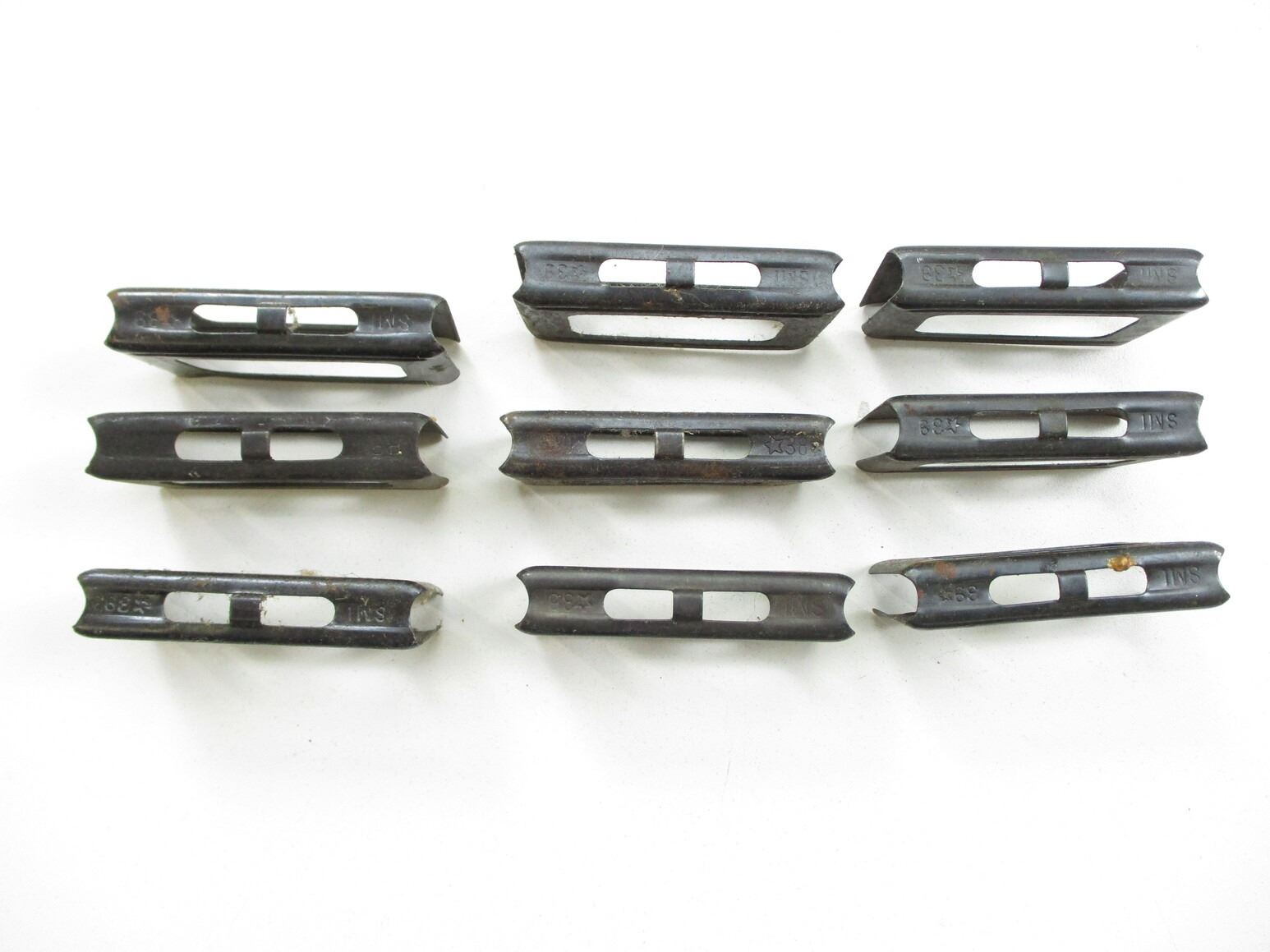 ITALIAN CARCANO STRIPPER CLIP LOT, (9) 6.5X52MM 6-RND STRIPPER CLIPS, BLUED STEEL, MARKED: "SMI" WITH VARIOUS NUMBERS, ORIGINAL. SEE PHOTOS.