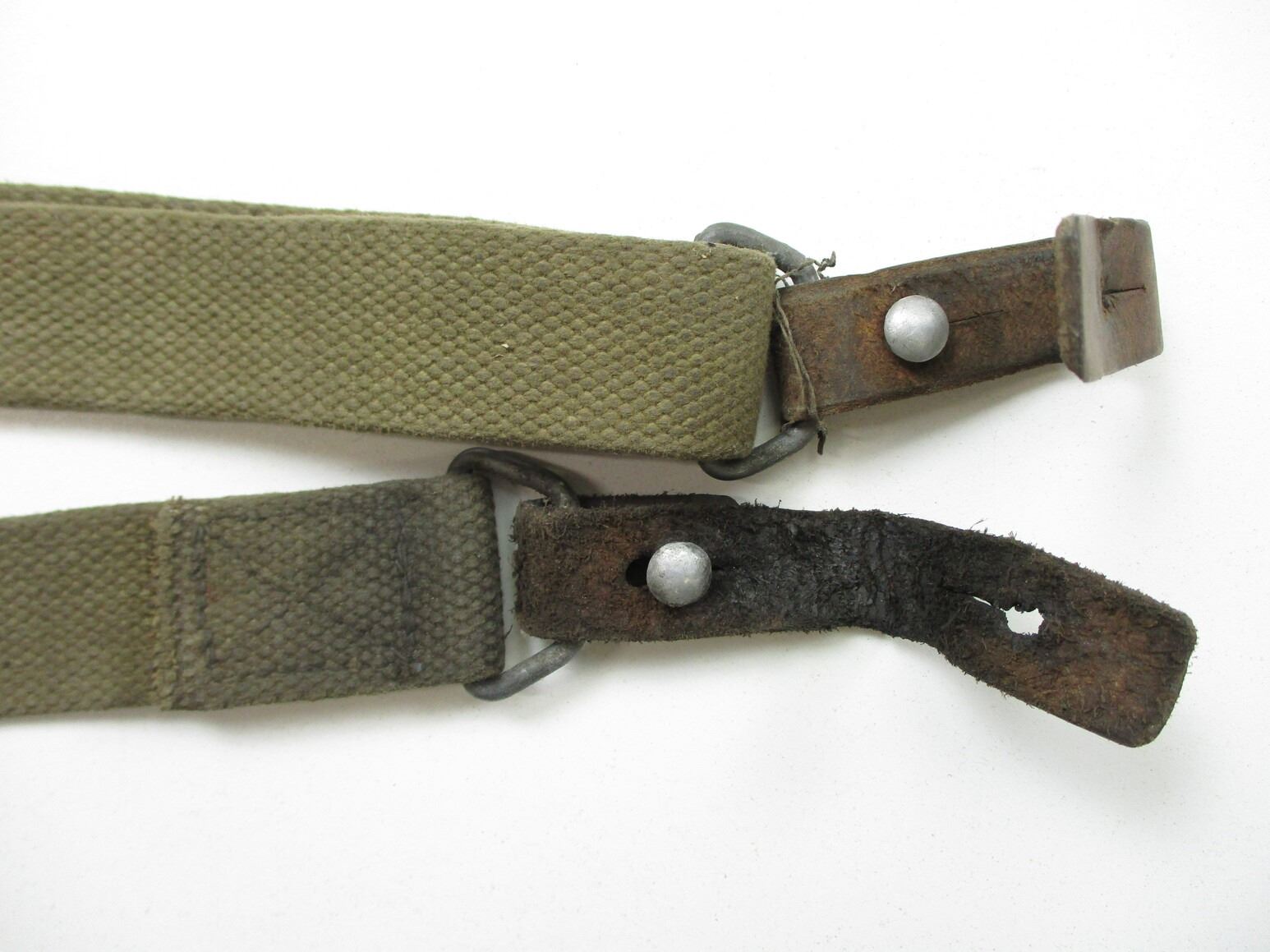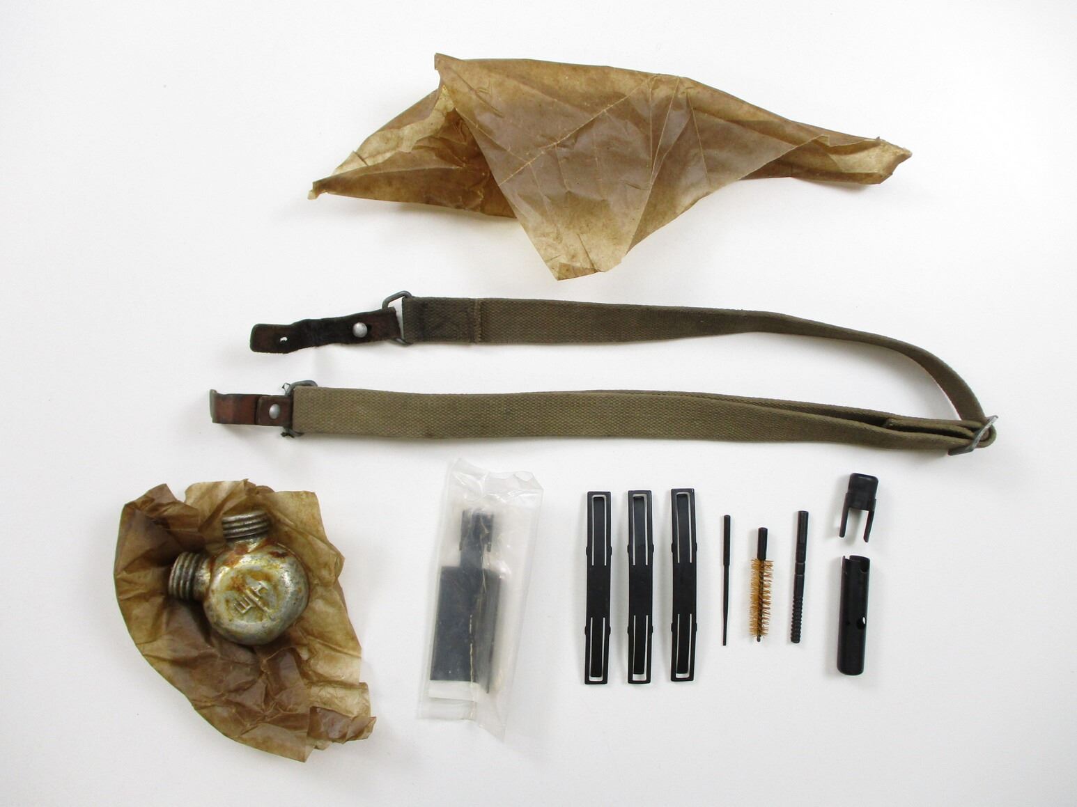 NORINCO SKS 56 ACCESSORIES LOT, LOT INCLUDES; (1) GREEN CANVAS SLINGS WITH LEATHER TABS, OAL APPROX. 47", ADJUSTABLE, (1) OILER, (1) CLEANING KIT, (3) 7.62X39MM STRIPPER CLIPS & (1) AIM SHELL DEFLECTOR. SEE PHOTOS.