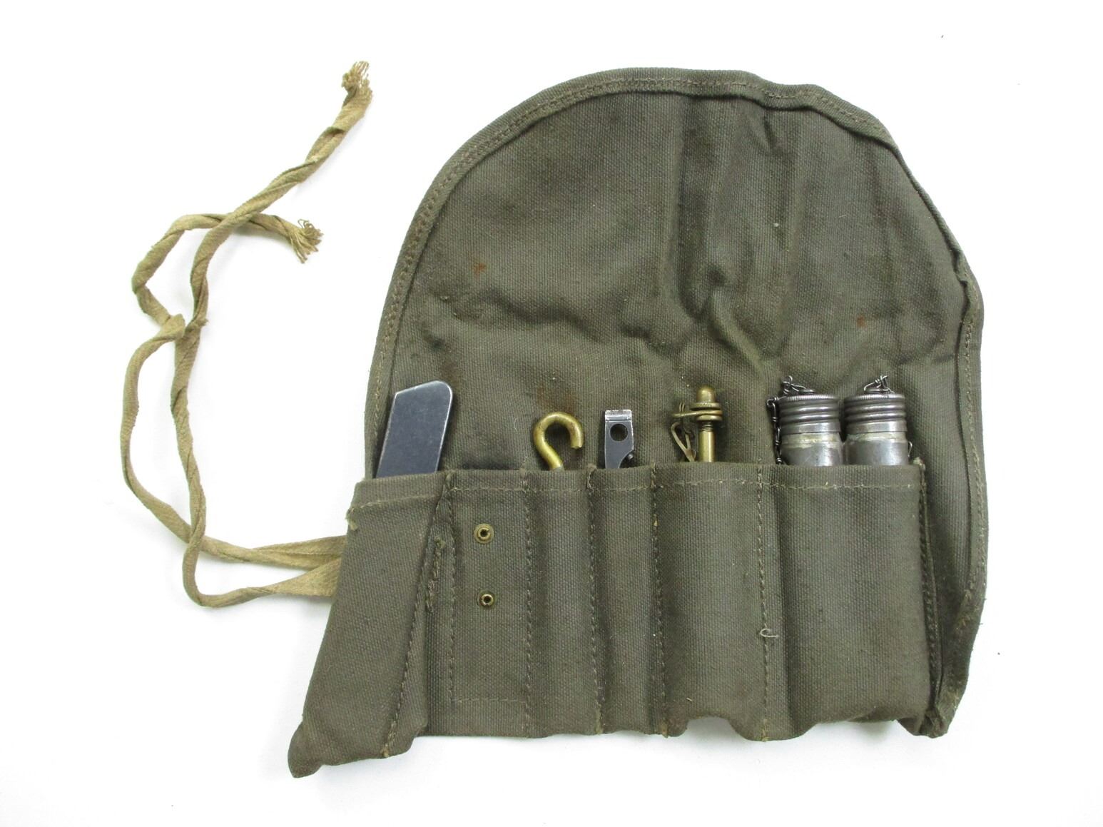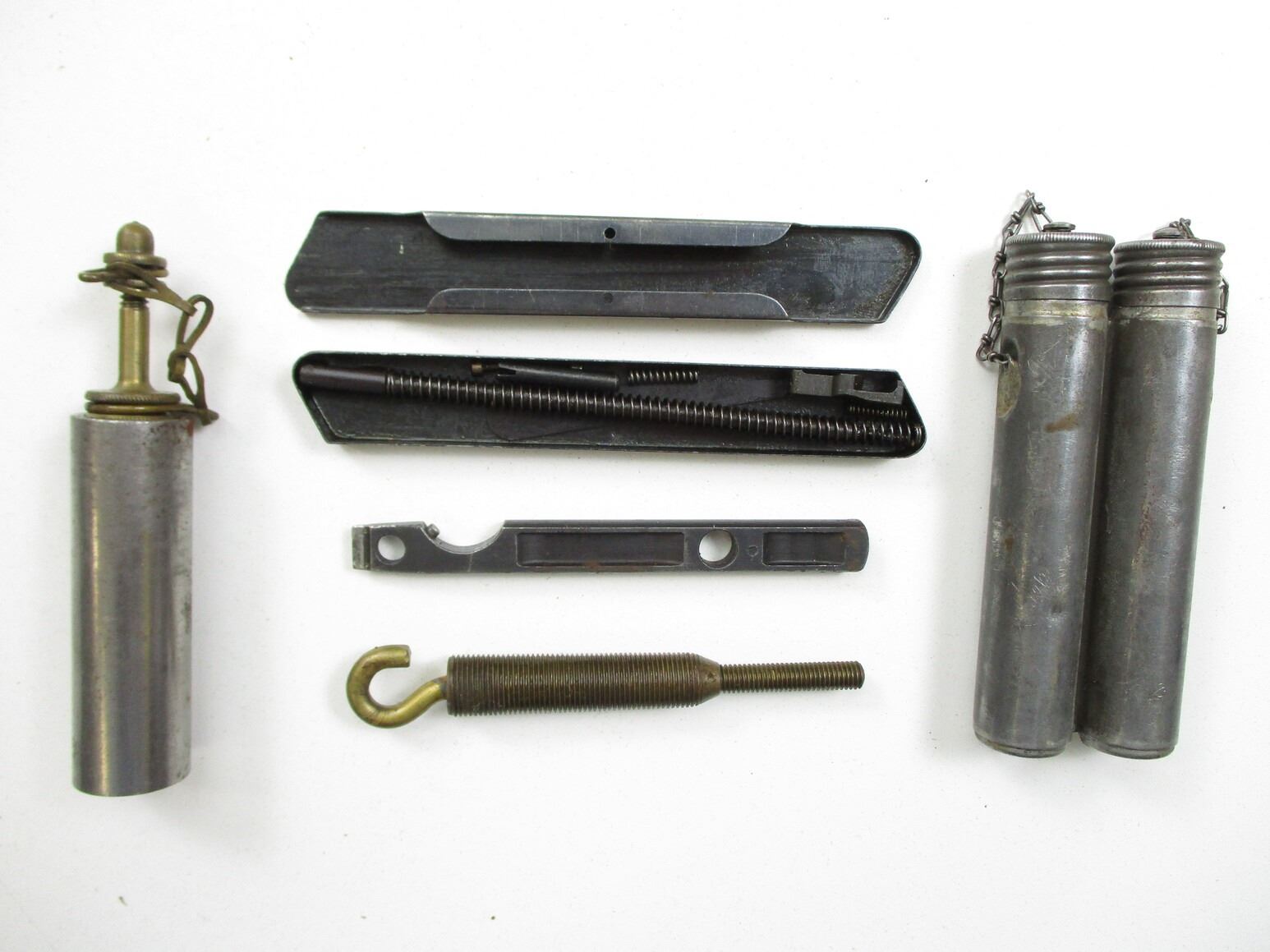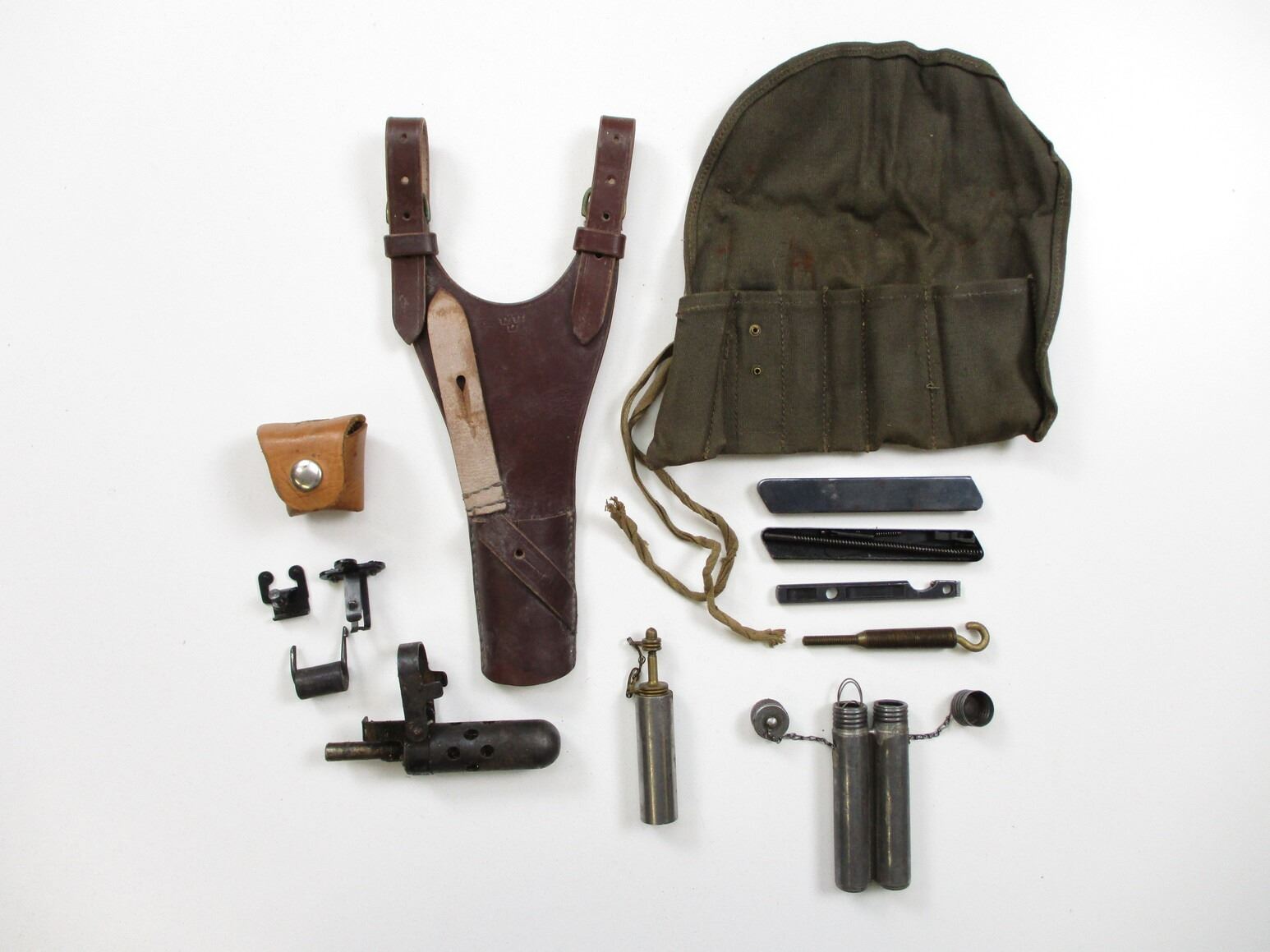 SWEDISH LJUNGMAN AG42B ACCESSORIES LOT, FITS 6.5X55MM SEMI-AUTOS, LOT INCLUDES; (1) BLANK FIRING ATTACHMENT, NIGHT SIGHTS WITH POUCH, (1) BROWN LEATHER BAYONET FROG, MARKED WITH THREE CROWNS, (1) CLEANING KIT WITH POUCH, OILERS, JAG, COMBO TOOL, FIRING PIN, EXTRACTOR & PARTS. SEE PHOTOS.