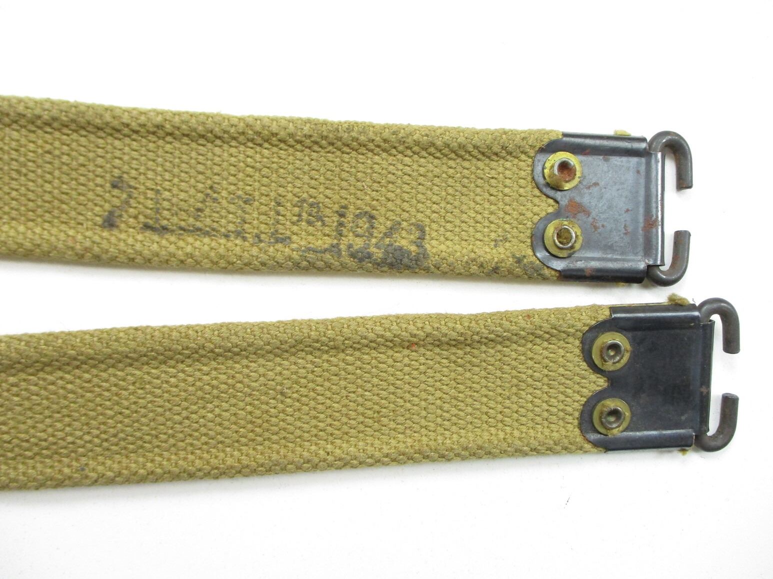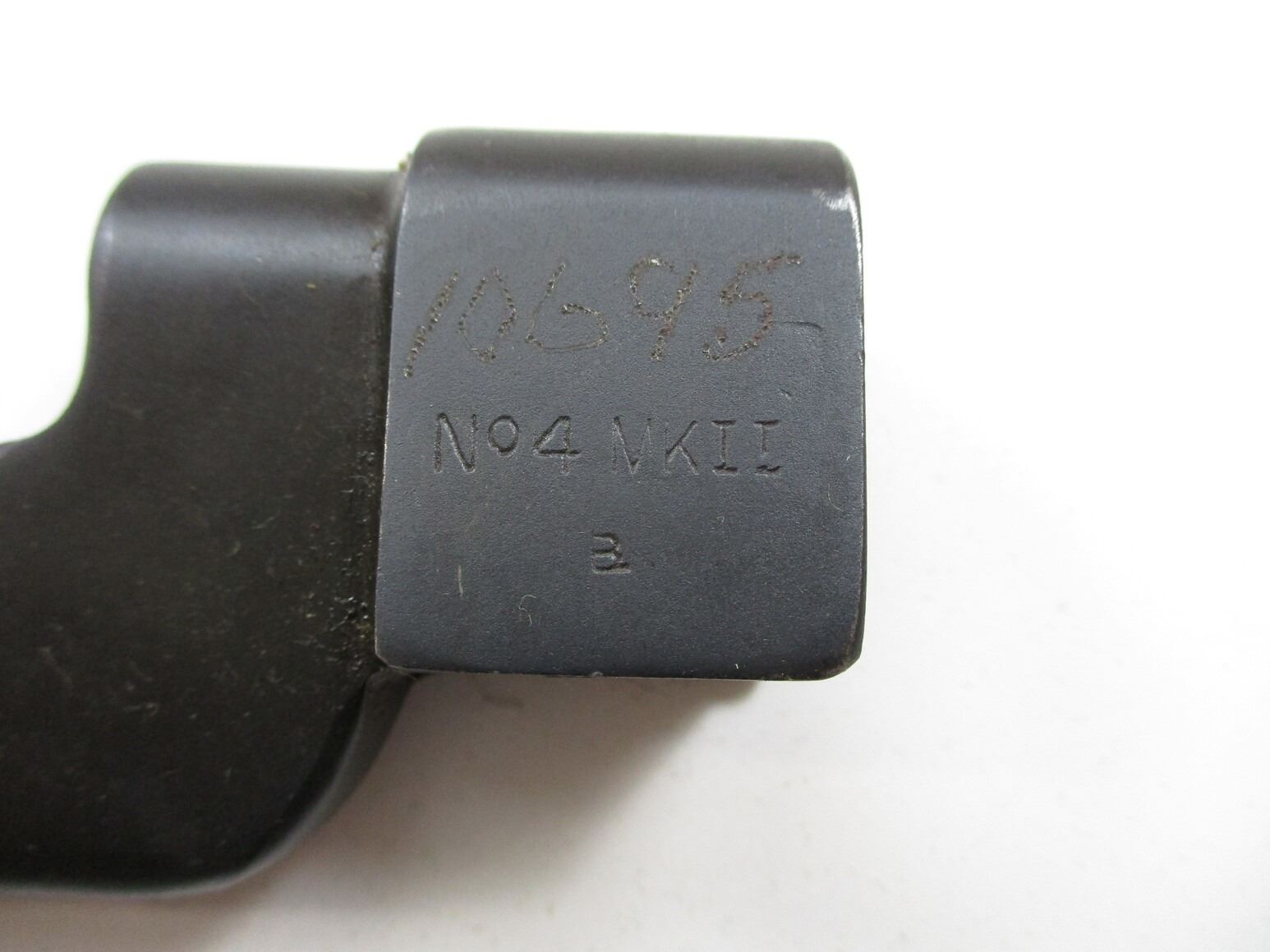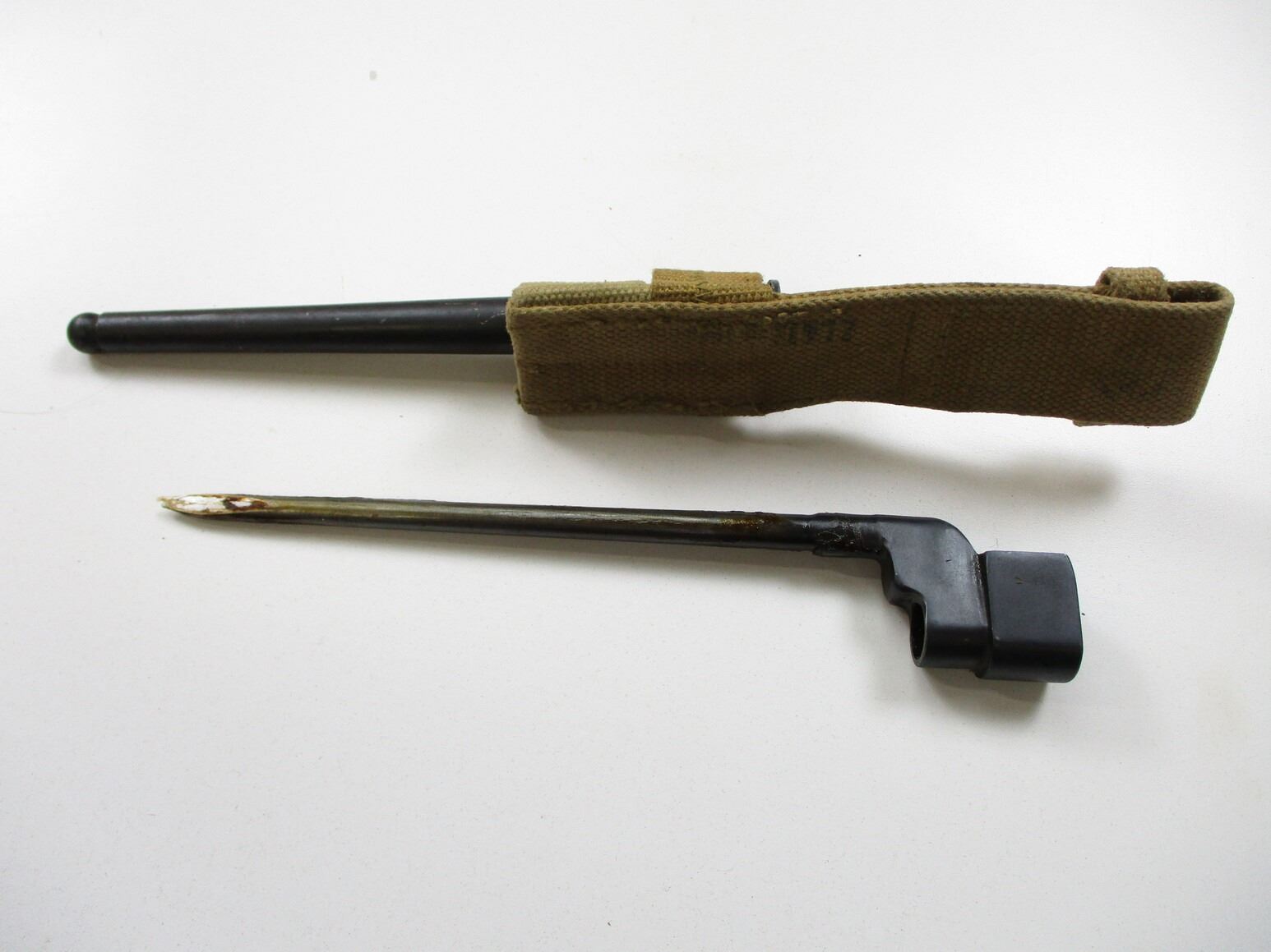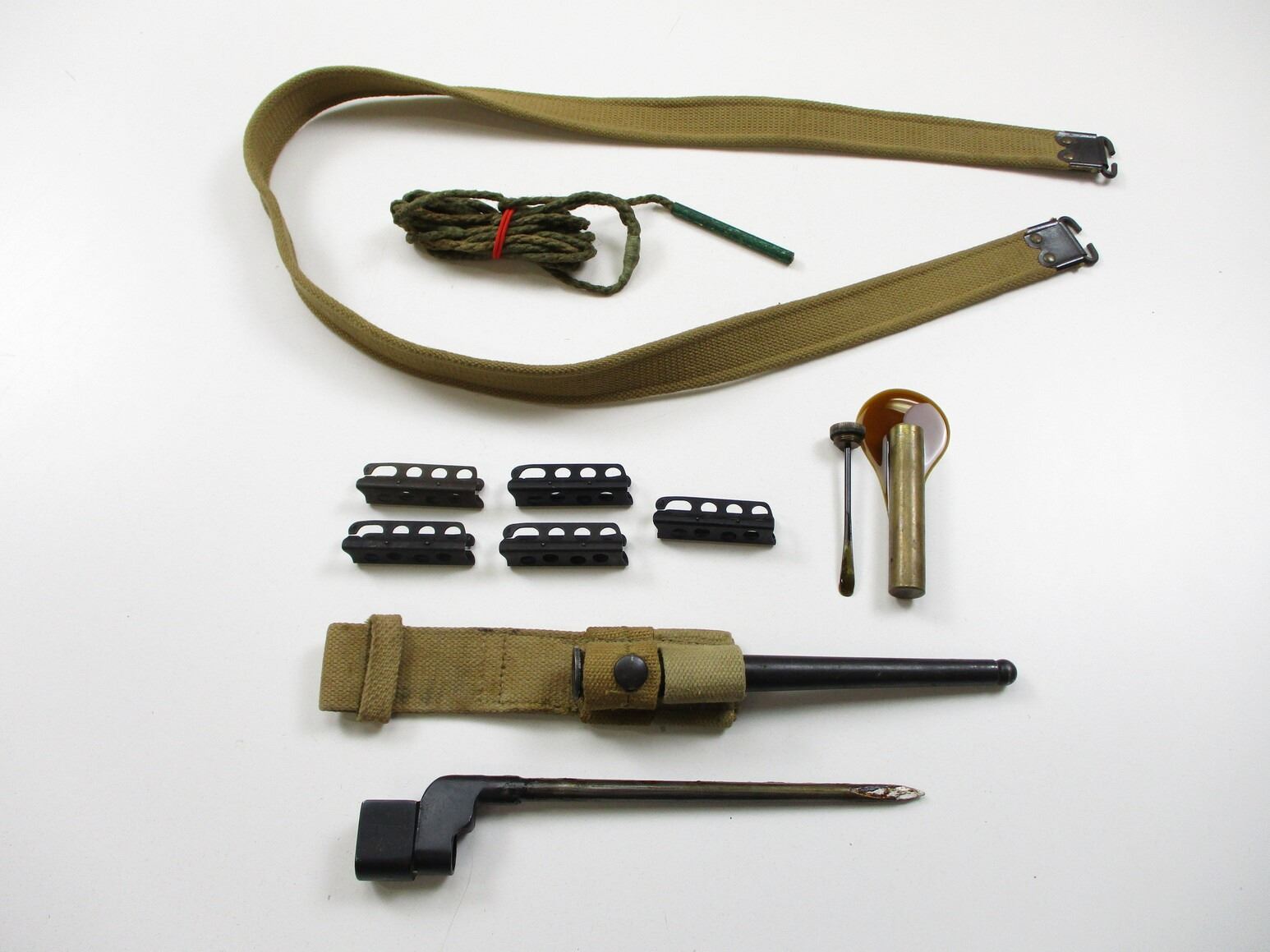 WWII, ETC. LEE ENFIELD ACCESSORIES LOT, FITS NO.4 MK I RIFLES, LOT INCLUDES; (1) NO. MK II SOCKET BAYONET, SOCKET MARKED: "NO 4 MKII, B", METAL SCABBARD, NO VISIBLE MARKINGS, P37 FROG MARKED: "Z.L.&T.LTD" & C-BROAD ARROW, (1) CANADIAN P37 SLING WITH BLUED STEEL FITTINGS, MARKED: "Z.L.&T.LTD. 1943" OAL, APPROX. 43", (5) .303 BRITISH STRIPPER CLIPS, (1) PULL-THRU & (1) BRITISH BRASS OILER, MARKED: "EFD" & BROAD ARROW. SEE PHOTOS.