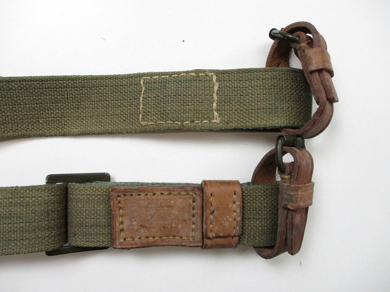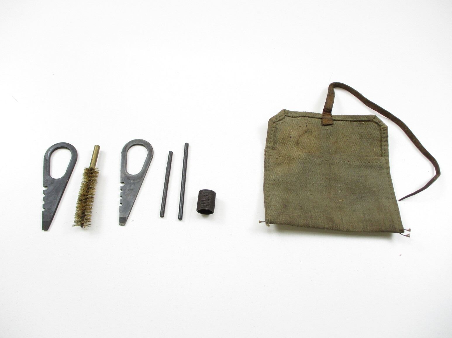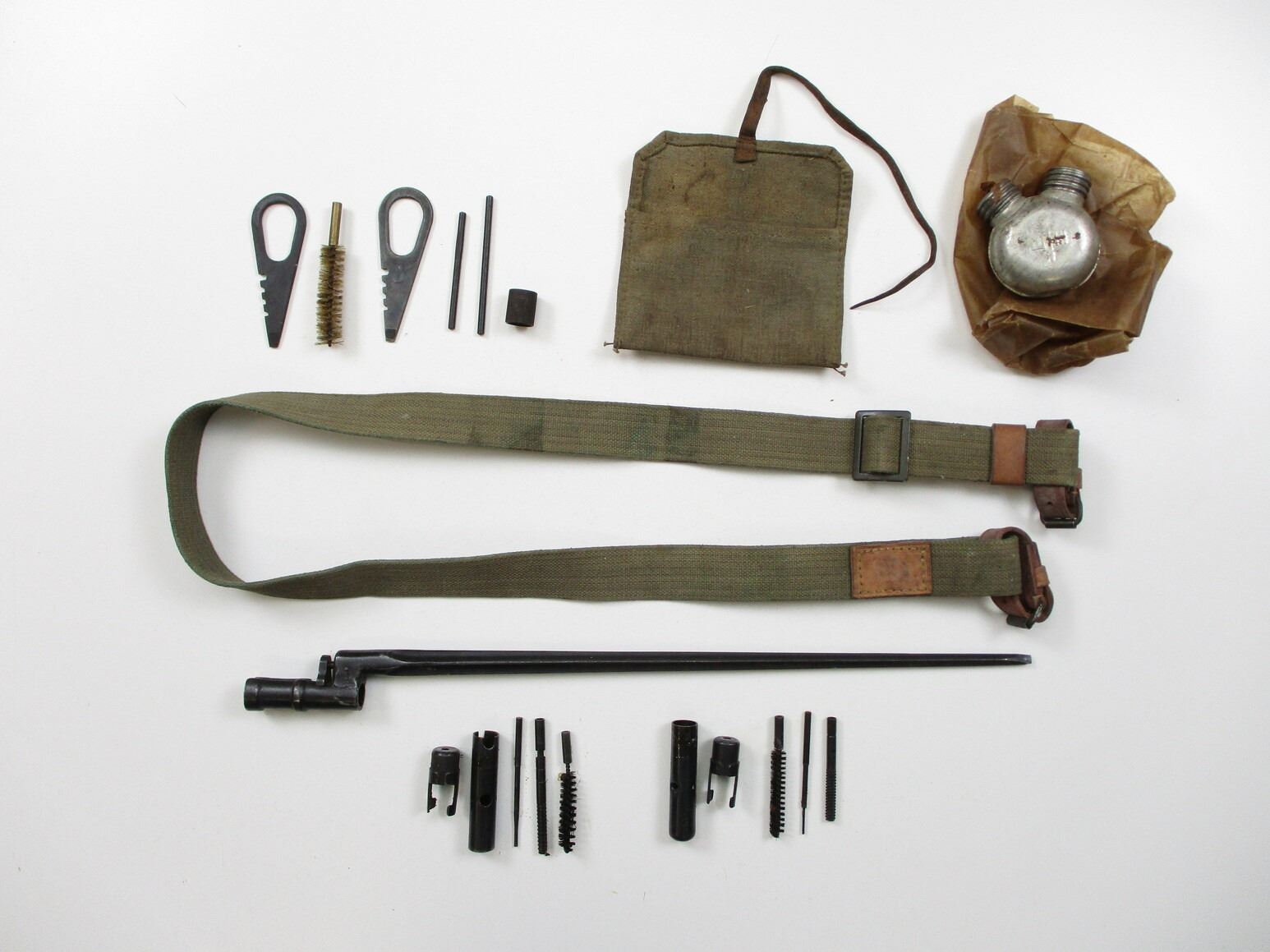 RUSSIAN MOSIN-NAGANT ACCESSORIES LOT, LOT INCLUDES; (1) SOCKET BAYONET, FITS 91/30 RIFLES, CRUCIFORM BLADE, MARKED: "416" & OTHER FAINT MARKINGS, BLADE APPROX. 17" & OAL APPROX. 19 5/8", (1) CANVAS SLING WITH LEATHER COLLARS, OAL APPROX. 48", ADJUSTABLE, (1) OILER, CLEANING KIT ACCESSORIES, ETC. SEE PHOTOS.