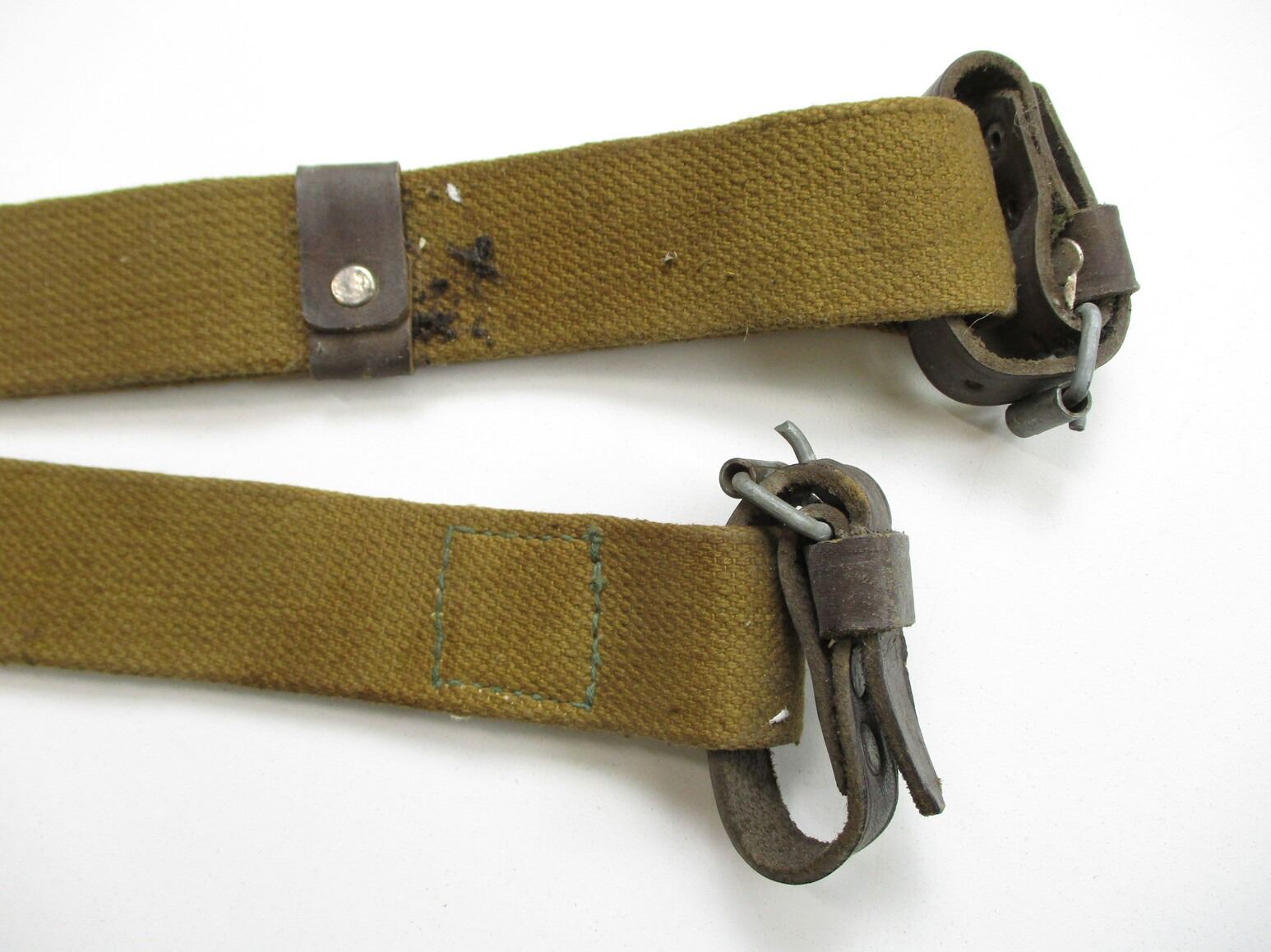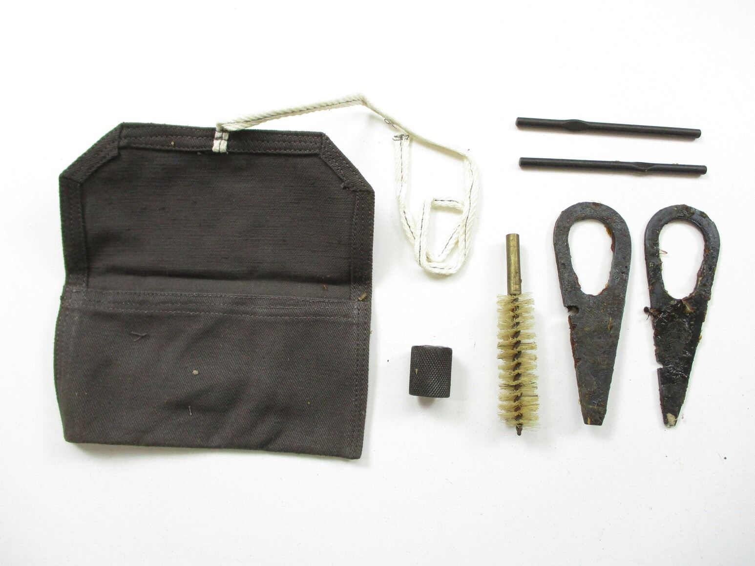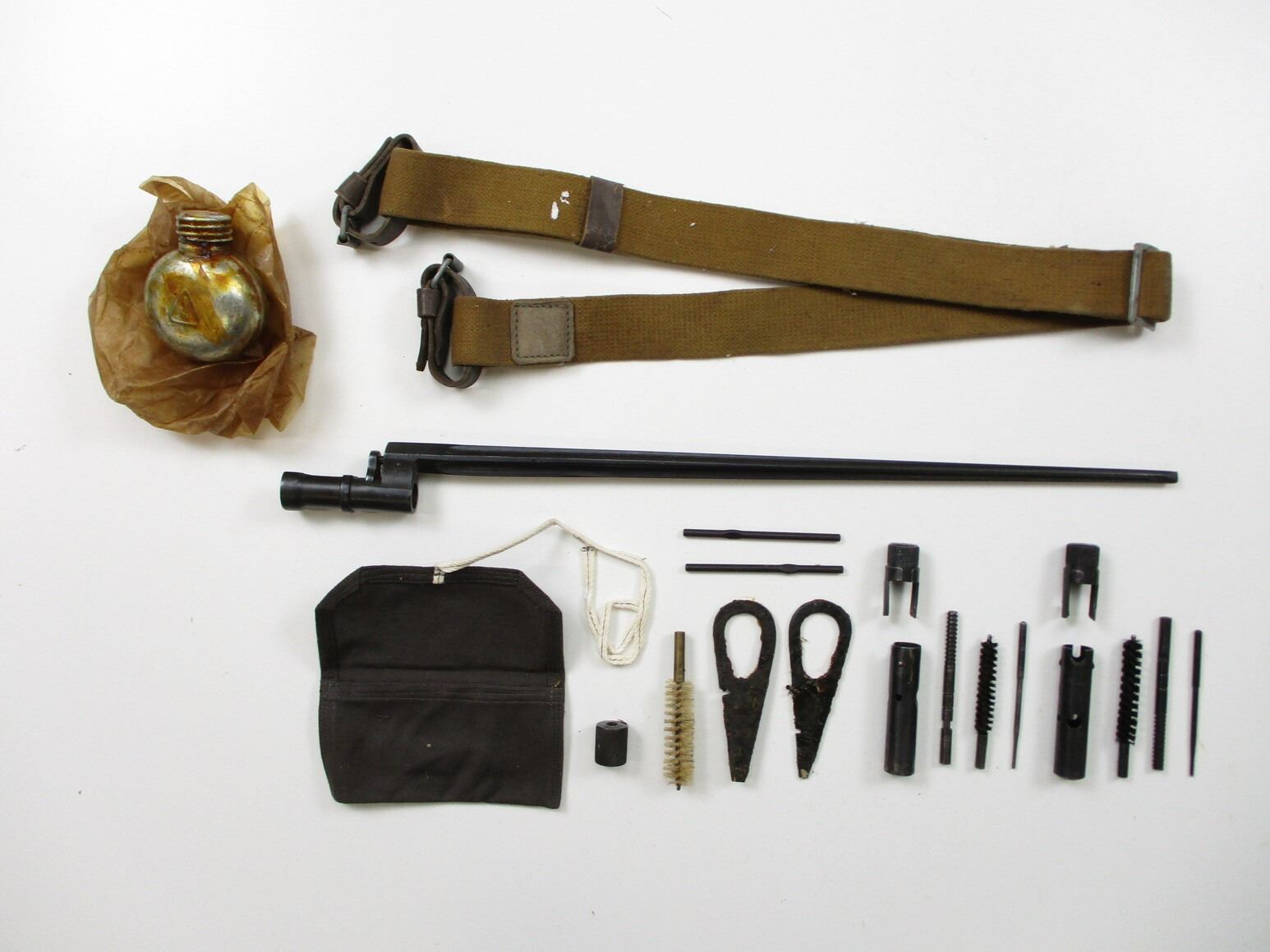 RUSSIAN MOSIN-NAGANT ACCESSORIES LOT, LOT INCLUDES; (1) SOCKET BAYONET, FITS 91/30 RIFLES, CRUCIFORM BLADE, MARKED: "CE1572" & "02", BLADE APPROX. 17" & OAL APPROX. 19 5/8", (1) CANVAS SLING WITH LEATHER COLLARS, OAL APPROX. 48", ADJUSTABLE, (1) OILER, CLEANING KIT ACCESSORIES, ETC. SEE PHOTOS.