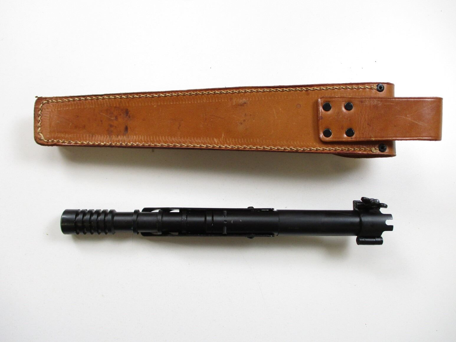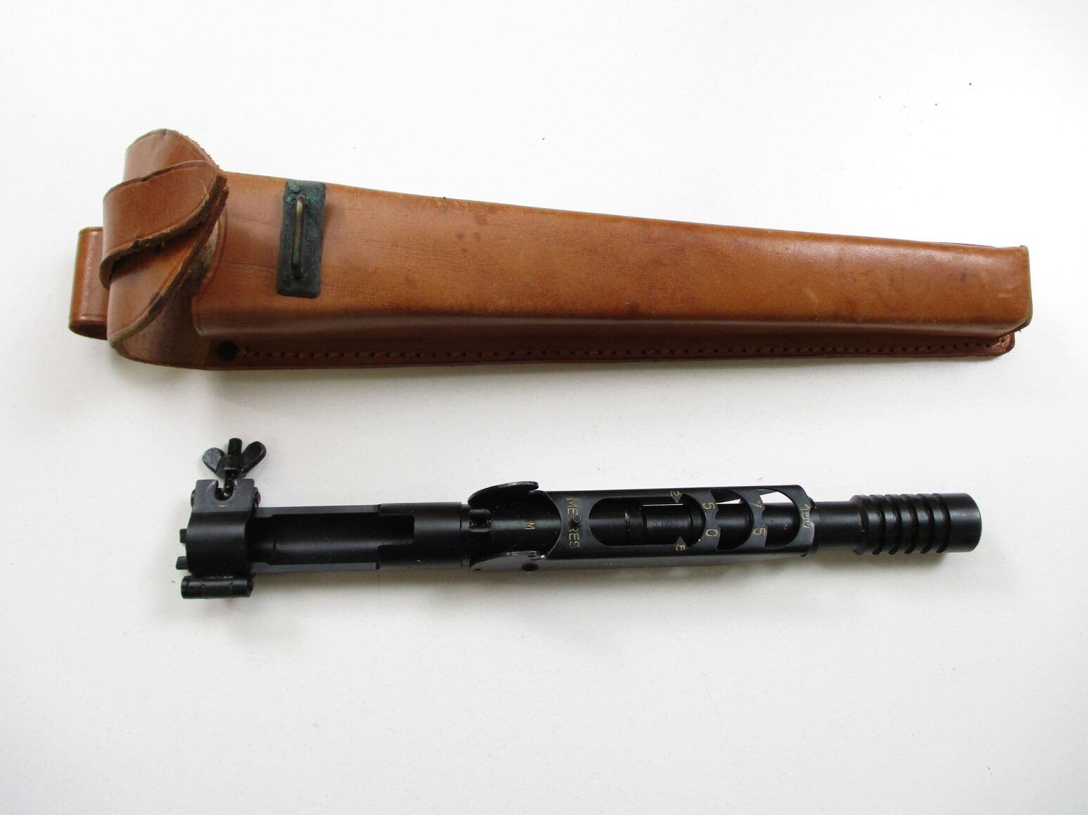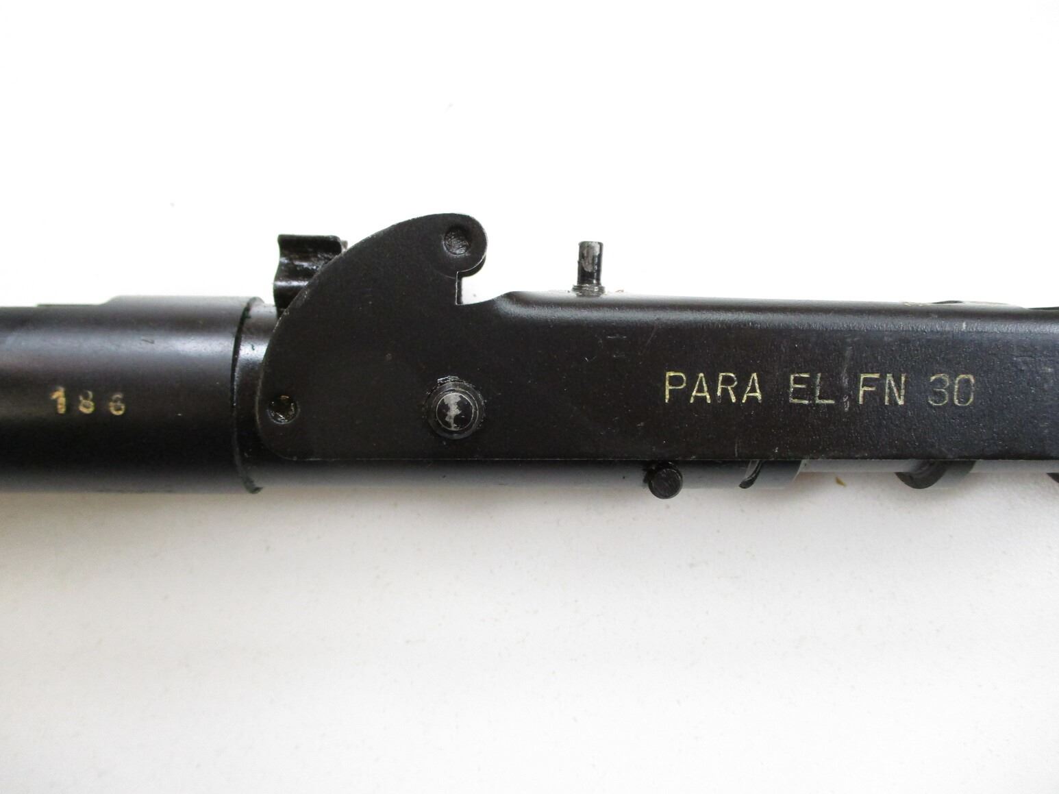 BELGIAN MAUSER GRENADE LAUNCHER, (1) FITS .30 CAL. MAUSER, WITH FOLDING SIGHT, LAUNCHER MARKED: "PARA EL FN 30", "186", "M" & MAKER'S MARK, BROWN LEATHER CASE, NO VISIBLE MARKINGS, SECURING LOOP IS COMING LOOSE. SEE PHOTOS.