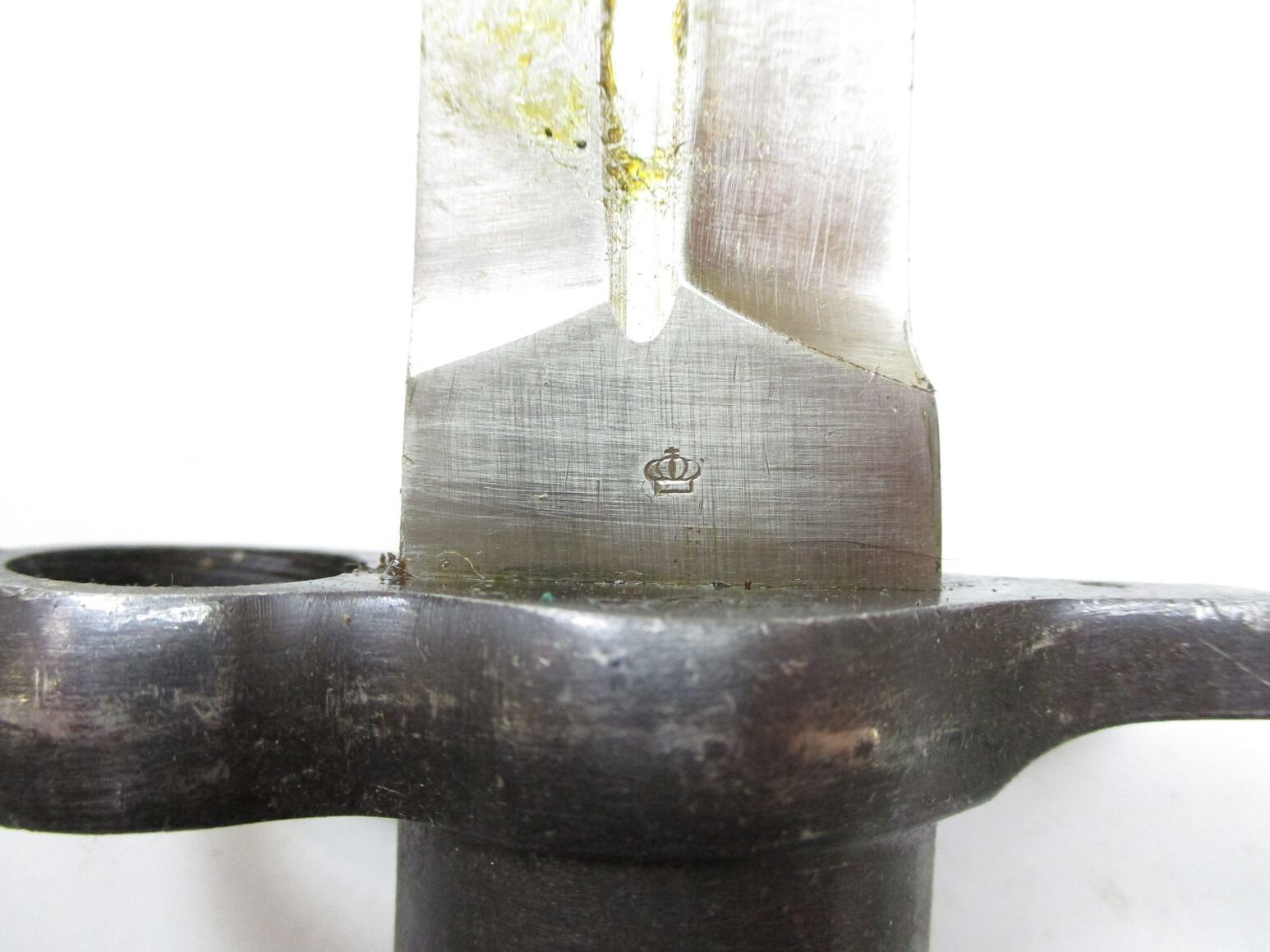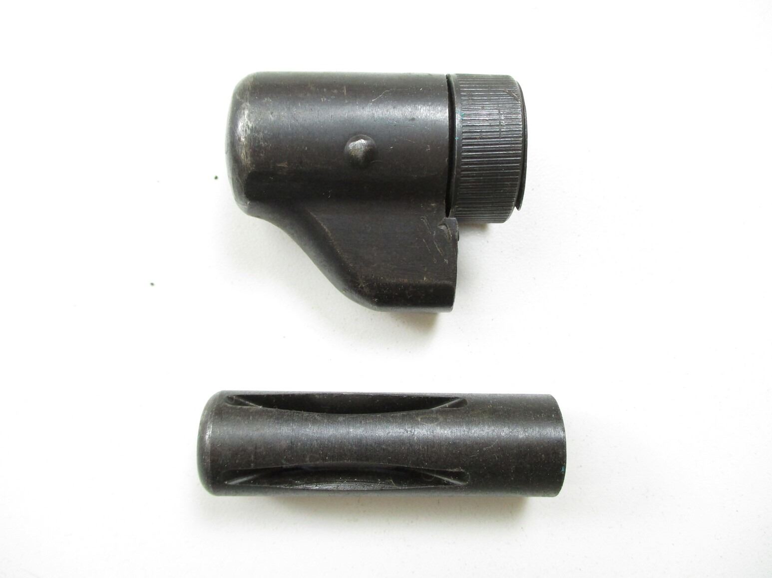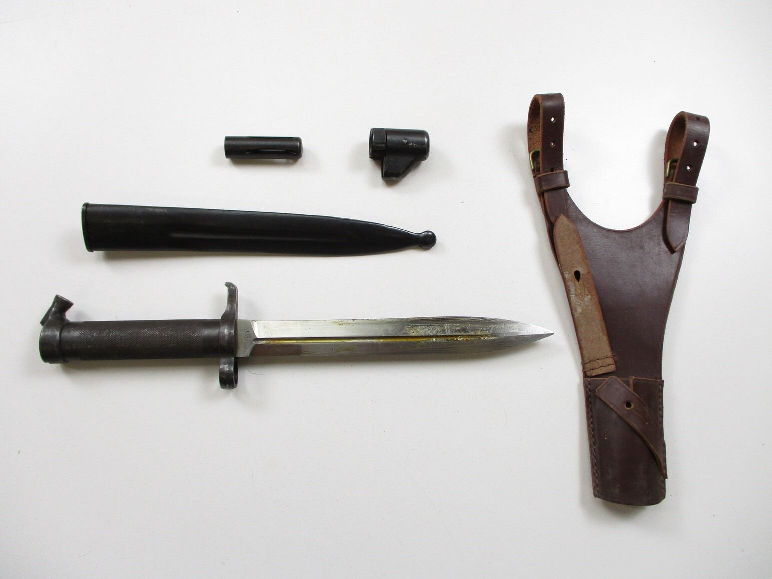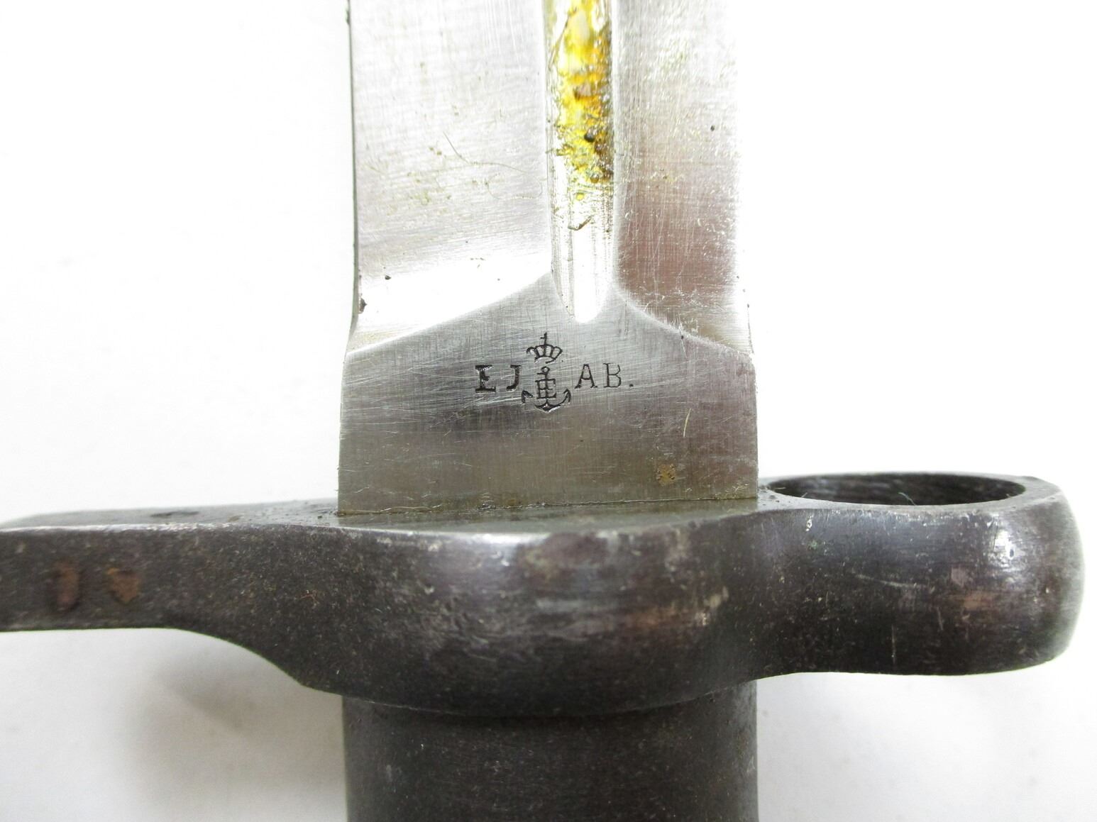 SWEDISH MAUSER ACCESSORIES LOT, FITS M1896 & M38 MODELS, LOT INCLUDES; (1) M1896 BAYONET, RICASSO MARKED: "EJ" ANCHOR "AB", OTHER-SIDE HAS CROWN, CROSS-PIECE MARKED: "EJ" ANCHOR "AB" & CROWN, METAL GRIP/METAL POMMEL, METAL SCABBARD MARKED: "E.A.B.", BLADE APPROX. 8.5" & OAL APPROX. 13.25", (1) BROWN LEATHER FROG, NO VISIBLE MARKINGS, (1) FRONT SIGHT COVER & (1) FLASH HIDER (ATTACHES TO THREADED MUZZLE MODELS). SEE PHOTOS.