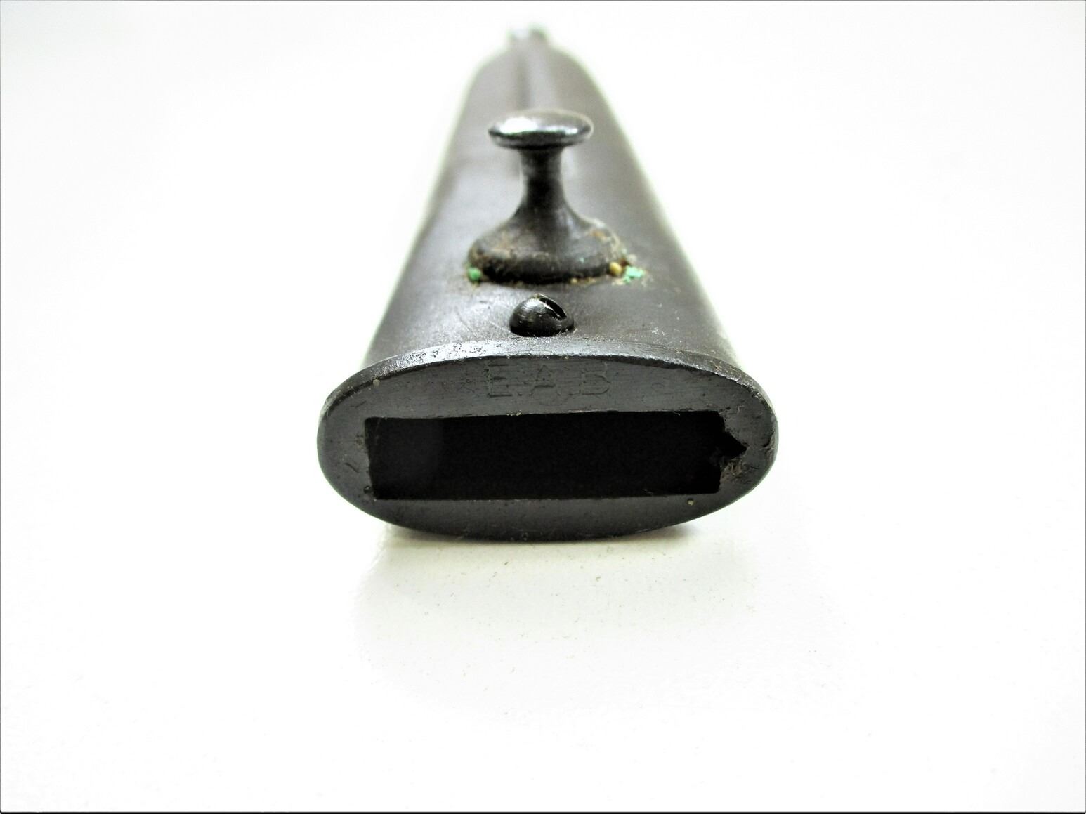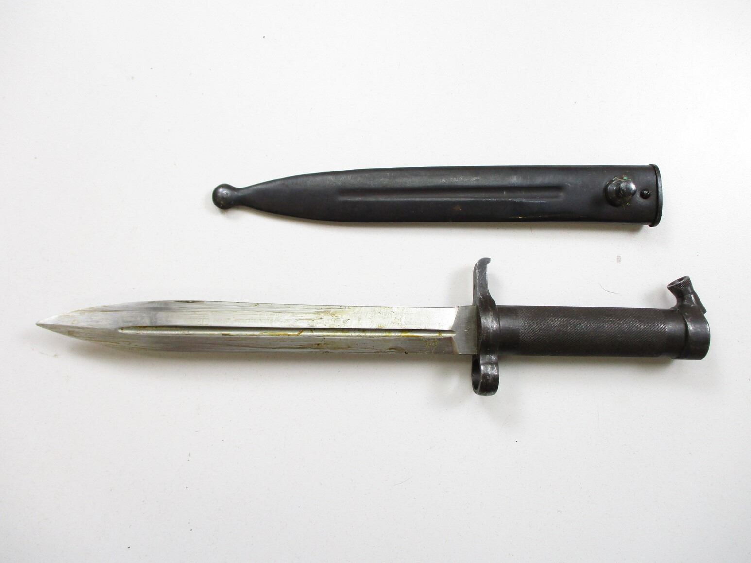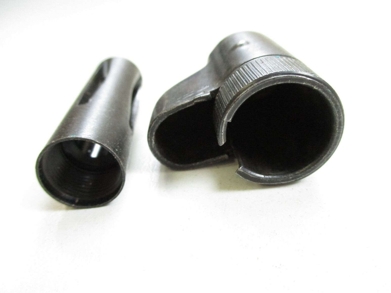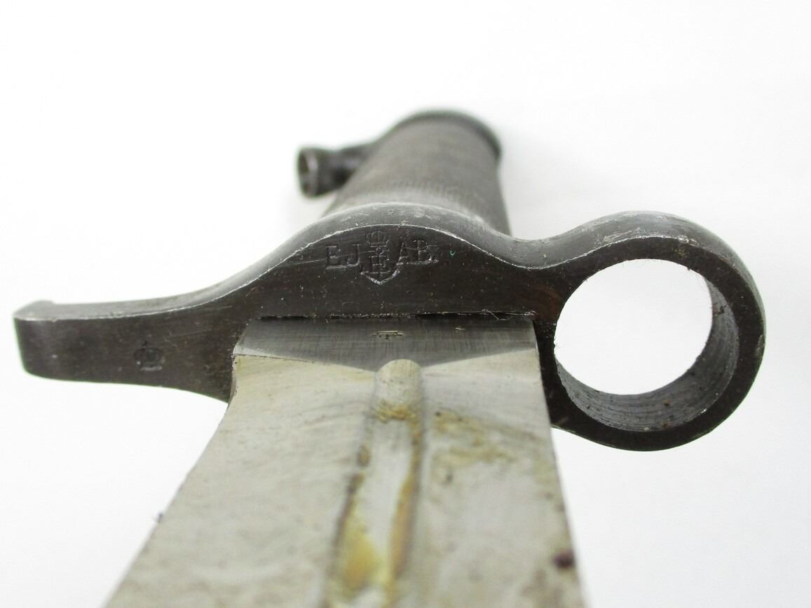 SWEDISH MAUSER ACCESSORIES LOT, FITS M1896 & M38 MODELS, LOT INCLUDES; (1) M1896 BAYONET, RICASSO MARKED: "EJ" ANCHOR "AB", OTHER-SIDE HAS CROWN, CROSS-PIECE MARKED: "EJ" ANCHOR "AB" & CROWN, METAL GRIP/METAL POMMEL, METAL SCABBARD MARKED: "E.A.B.", BLADE APPROX. 8.5" & OAL APPROX. 13.25", (1) BROWN LEATHER FROG, NO VISIBLE MARKINGS, (1) FRONT SIGHT COVER & (1) FLASH HIDER (ATTACHES TO THREADED MUZZLE MODELS). SEE PHOTOS.