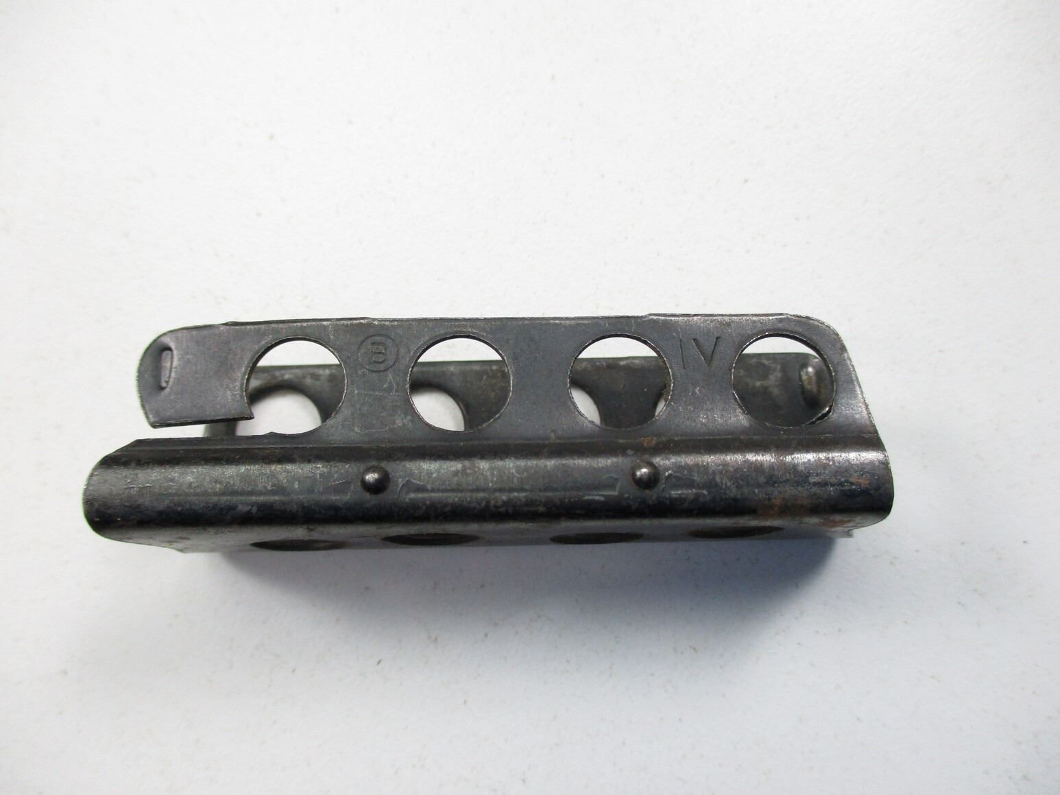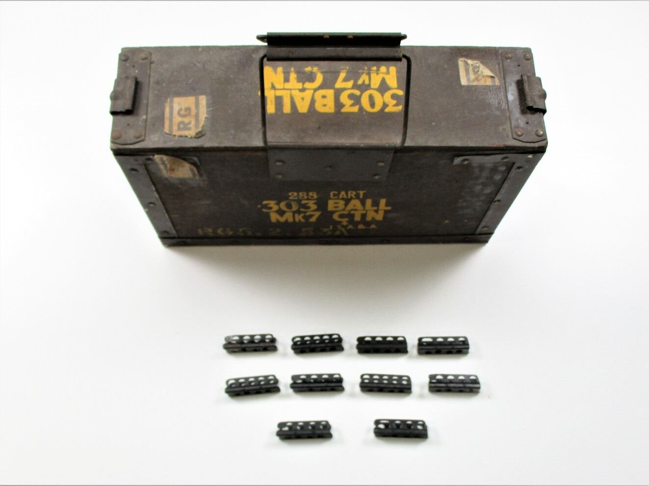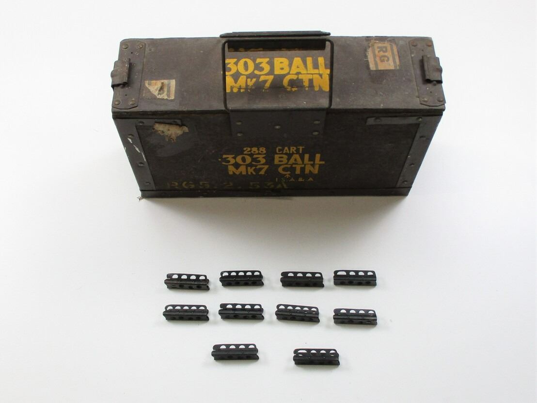 LEE ENFIELD STRIPPER CLIP AND .303 BRITISH AMMO CRATE LOT, (10) .303 BRITISH 5-RND STRIPPER CLIPS, BLUED STEEL, SOME MARKED, SOME UN-MARKED & (1) WOOD & METAL AMMO CRATE, VARIOUS MARKINGS, APPROX. 16 3/4" X 5" X 9 3/8". SEE PHOTOS.