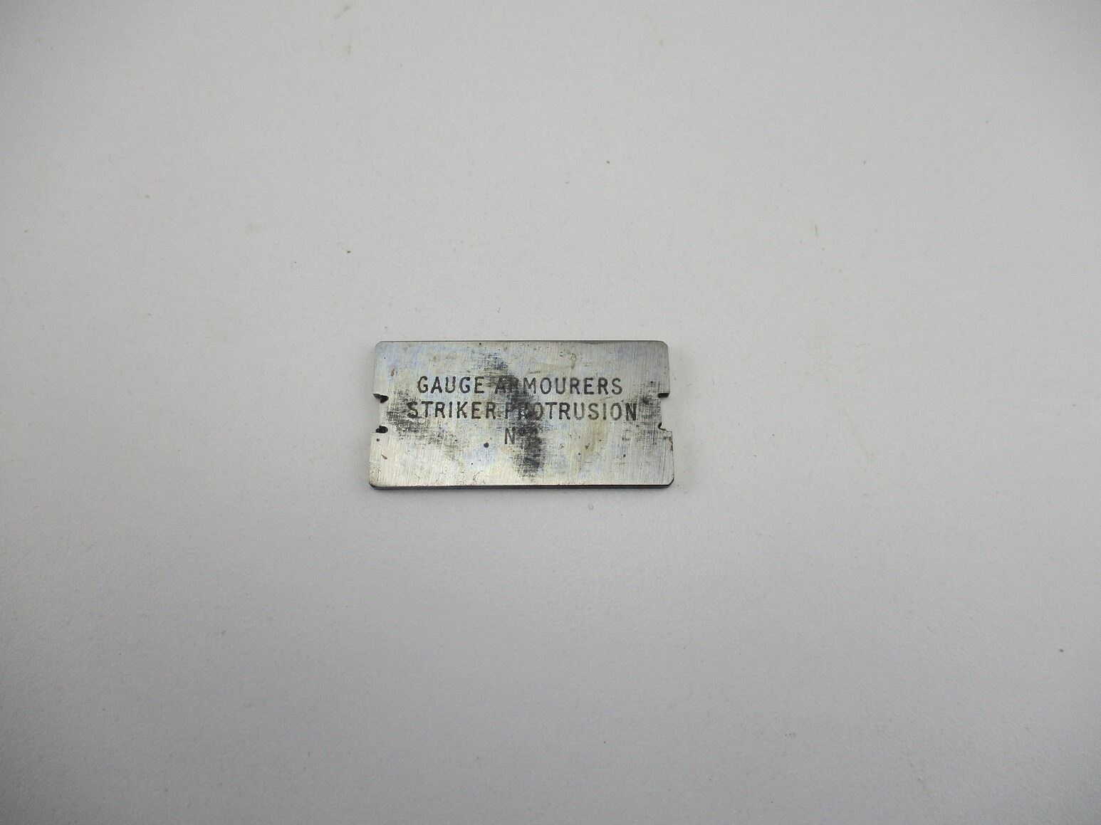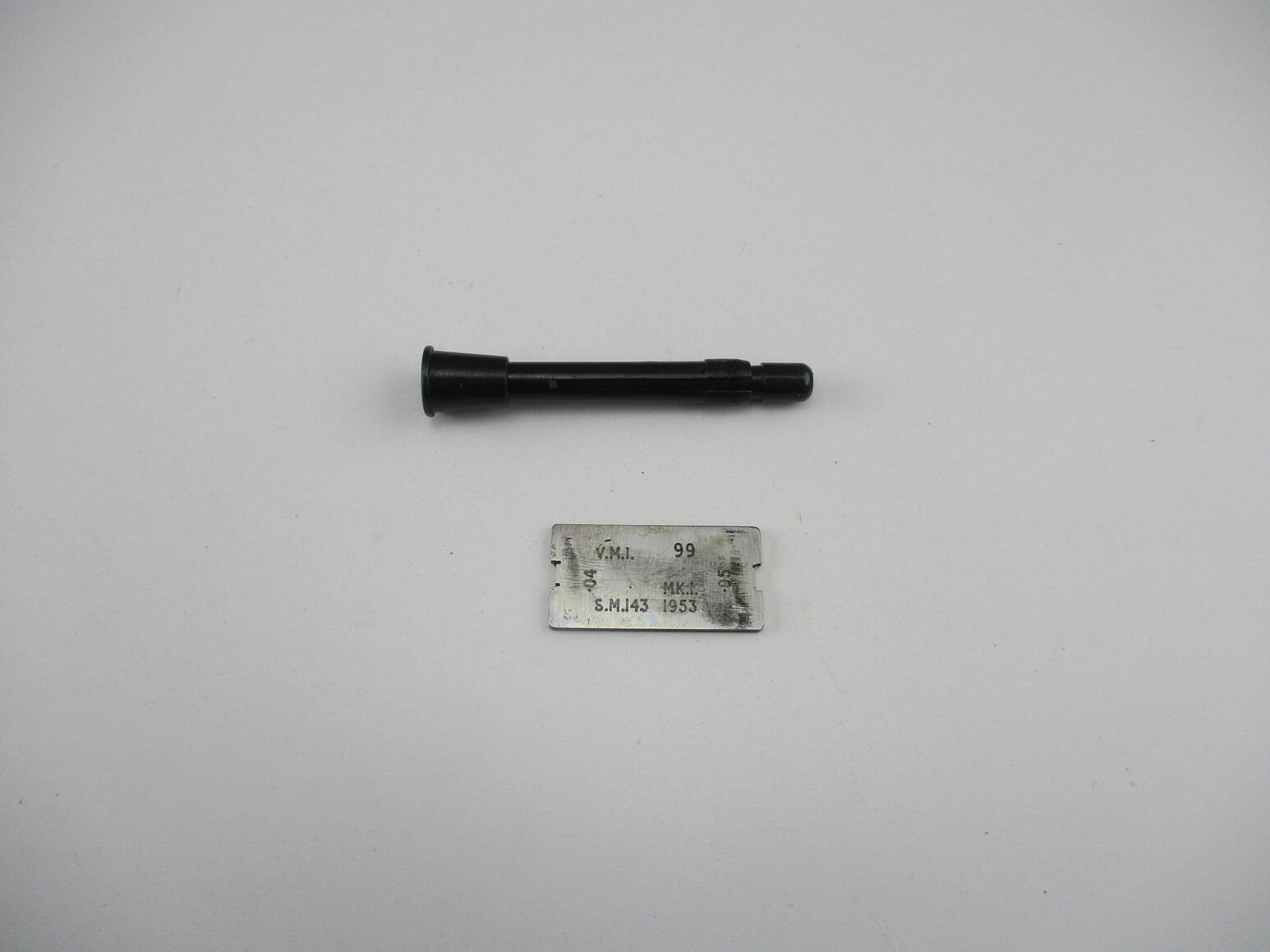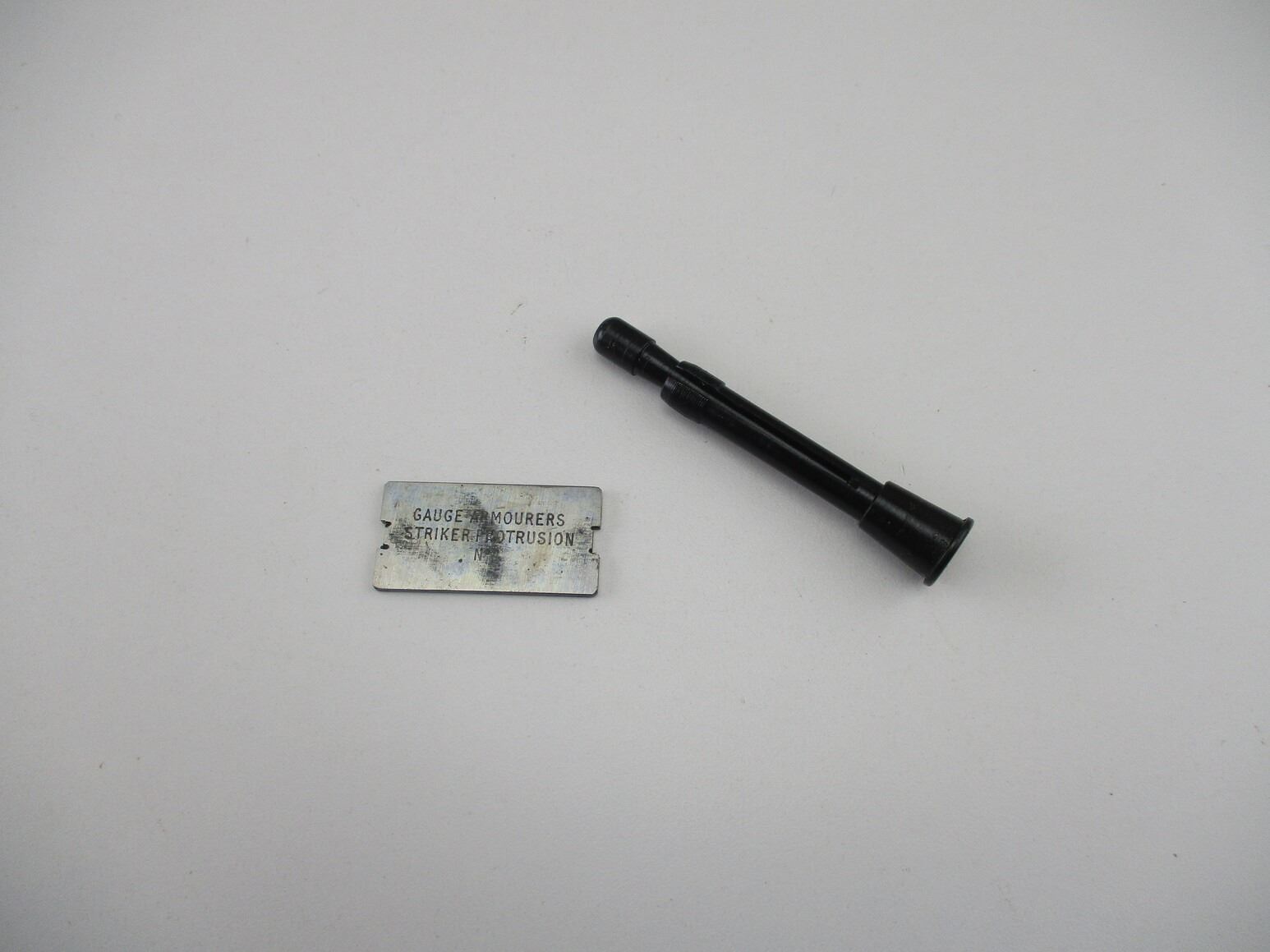 BRITISH / CANADIAN LEE ENFIELD GAUGE AND TOOL LOT, LOT INCLUDES; (1) FIRING PIN PROTRUSION GAUGE, MARKED: "VMI, 99, MK.I., S.M.143., 1953" & (1) .303 BRITISH RUPTURED CASE EXTRACTOR, BASE MARKED: "C.A.S.". SEE PHOTOS.