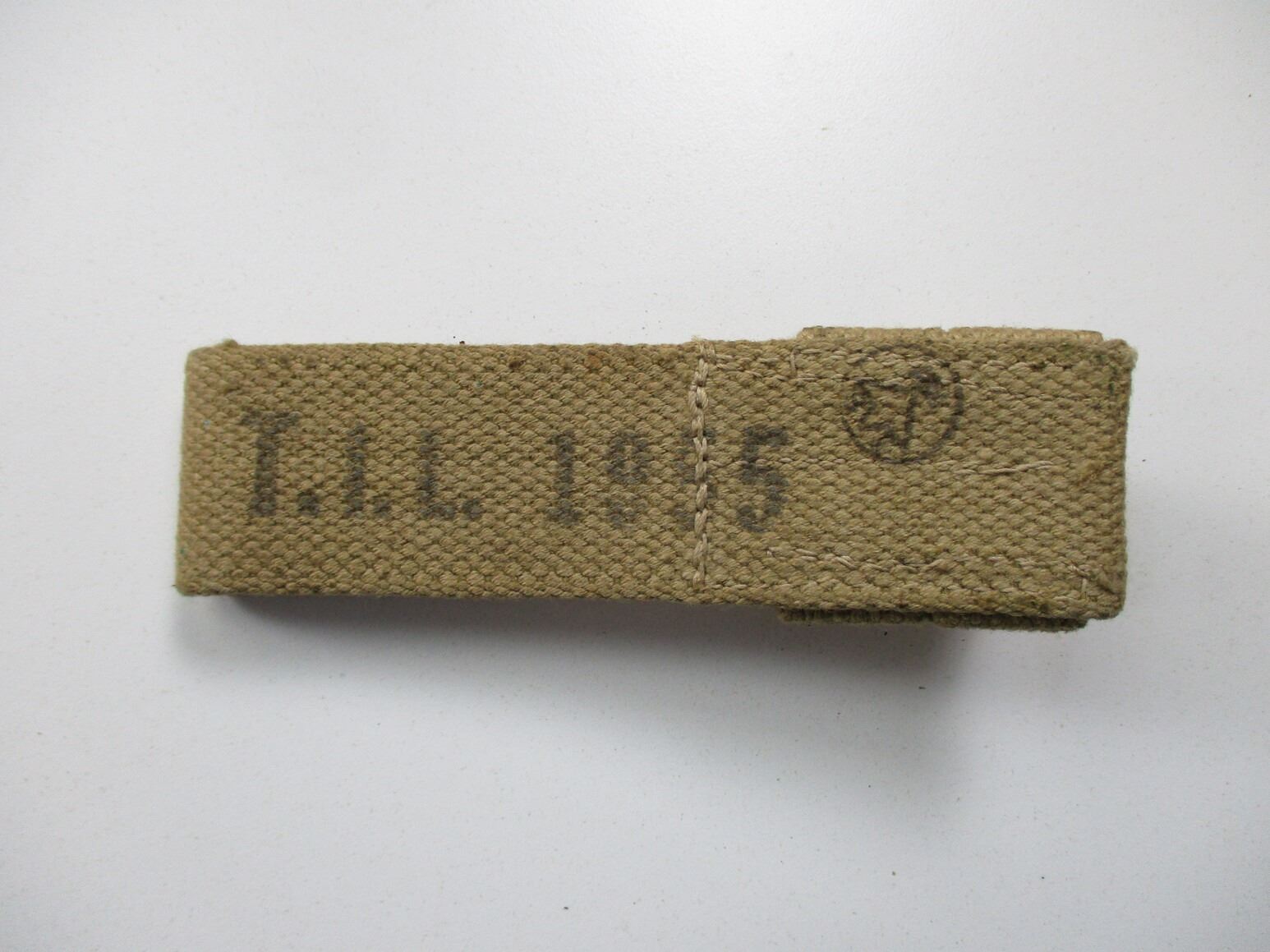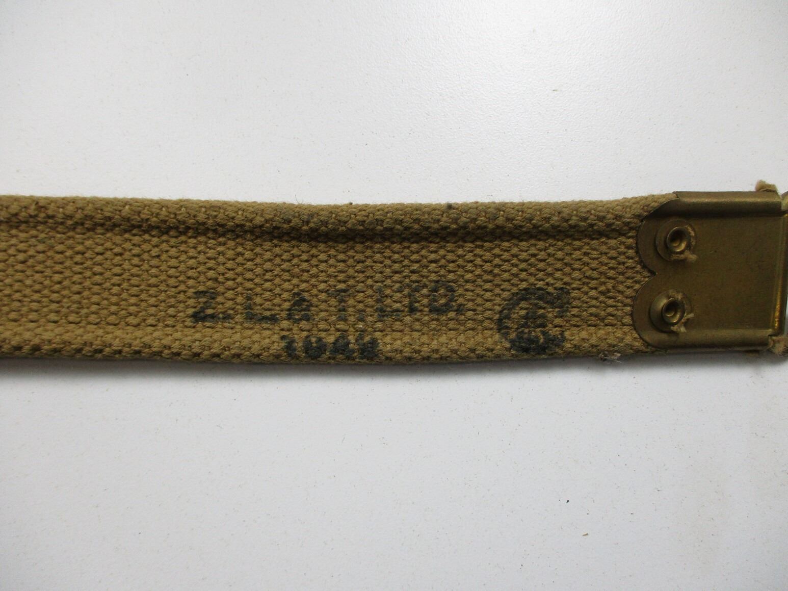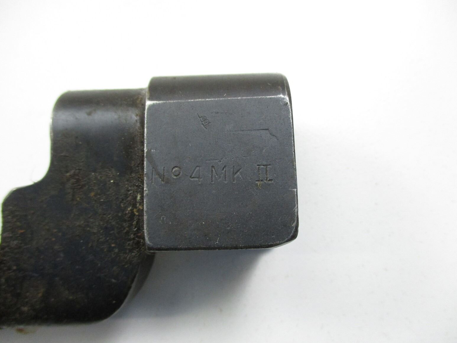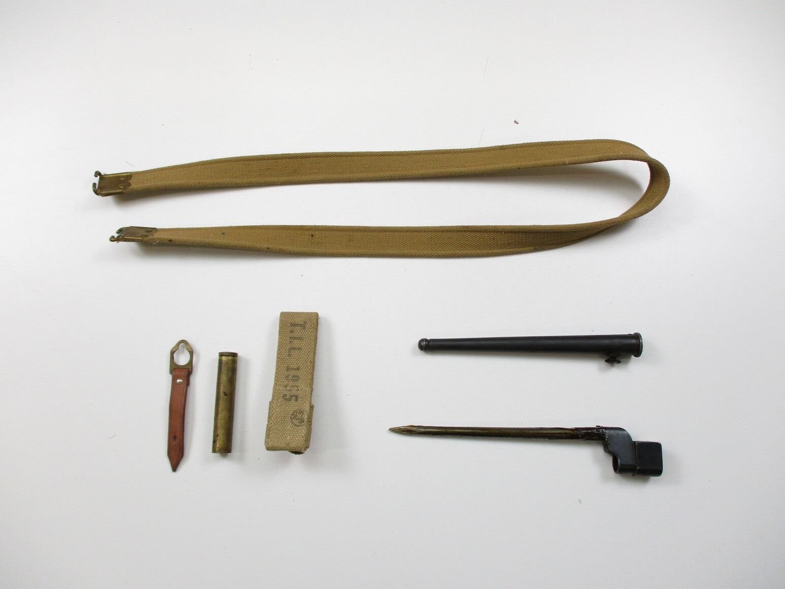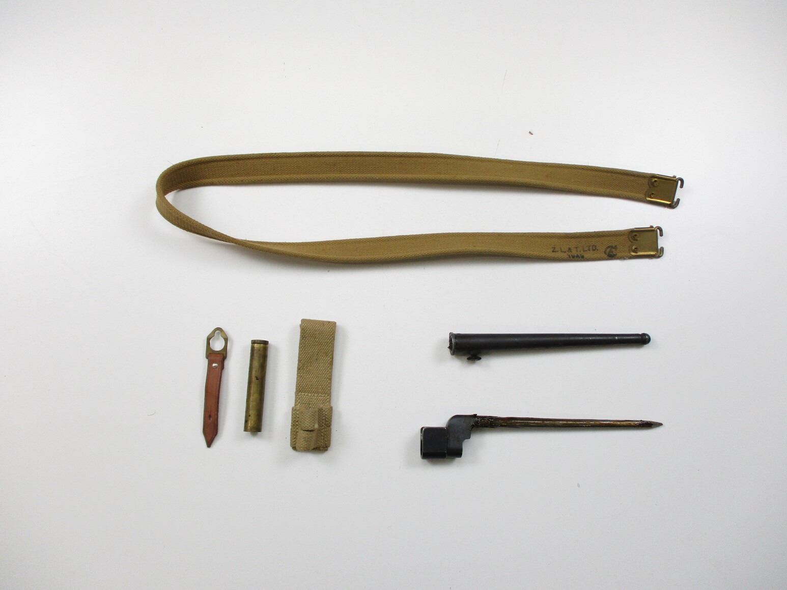 CANADIAN, ETC. LEE ENFIELD ACCESSORIES LOT, LOT INCLUDES; (1) NO.4 MKII SOCKET BAYONET, FITS LEE ENFIELD NO.4 MKII RIFLES, SOCKET MARKED: "NO 4 MKII", METAL SCABBARD, NO VISIBLE MARKINGS, BLADE APPROX. 8" & OAL APPROX. 9 7/8", (1) P37 WEB SLING MARKED: "Z.L.&T.LTD., 1942" & C-BROAD ARROW, OAL APPROX. 44", (1) CANVAS BAYONET FROG MARKED: "T.L.L. 1955", (1) SCABBARD RETAINER, NO VISIBLE MARKINGS & (1) AUSTRALIAN BRASS OILER, MARKED: "M?". SEE PHOTOS.