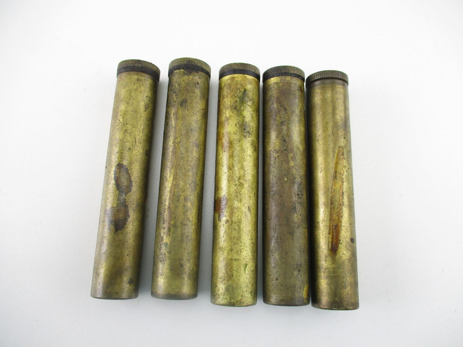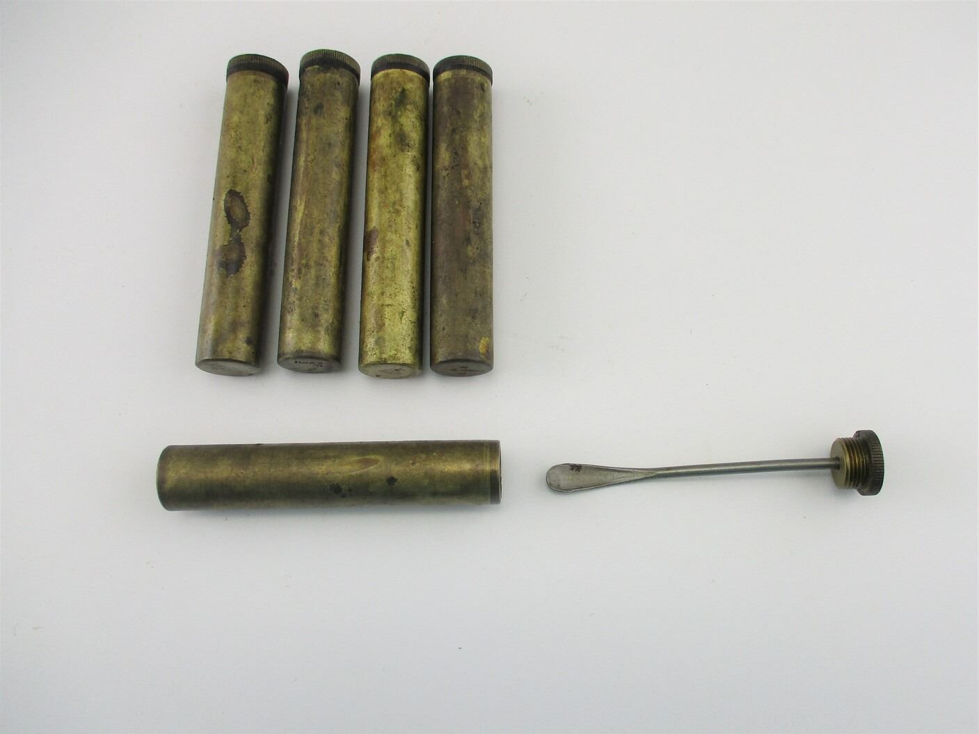 BRITISH MILITARY BRASS RIFLE OILER LOT, LOT INCLUDES; (5) BRASS OILERS, VARIOUS MARKINGS / MANUFACTURERS / BROAD ARROWS / ETC. SEE PHOTOS.