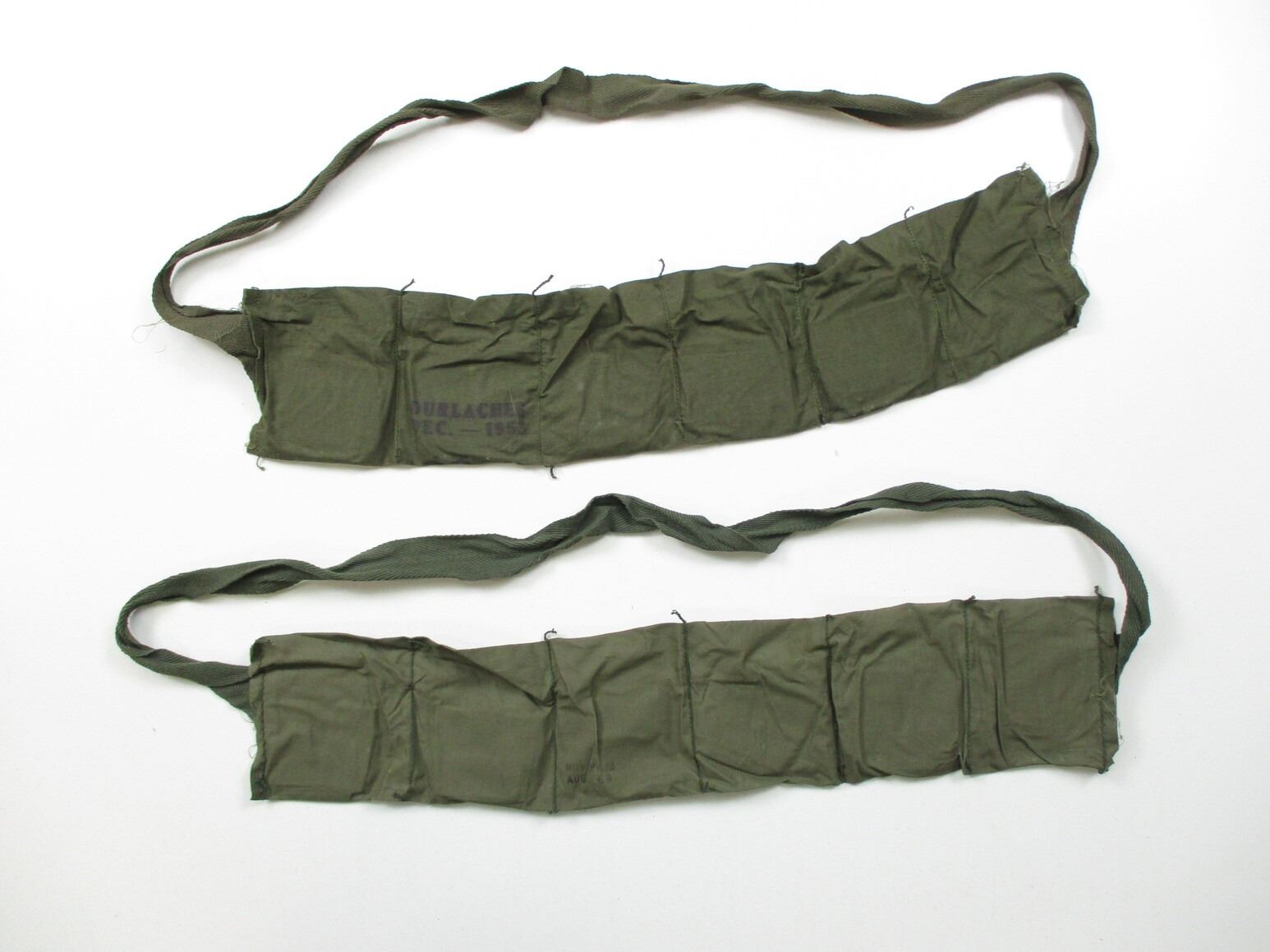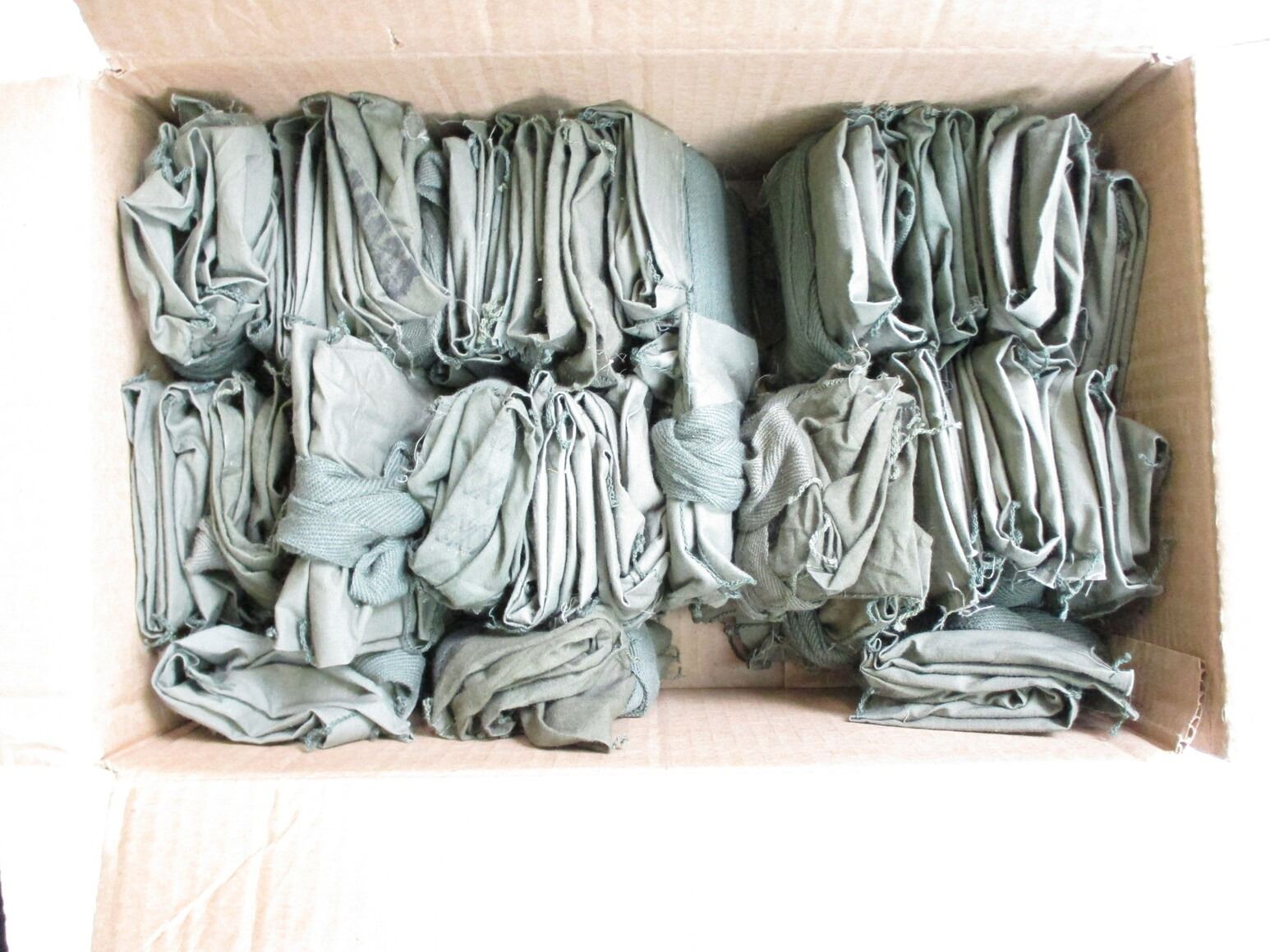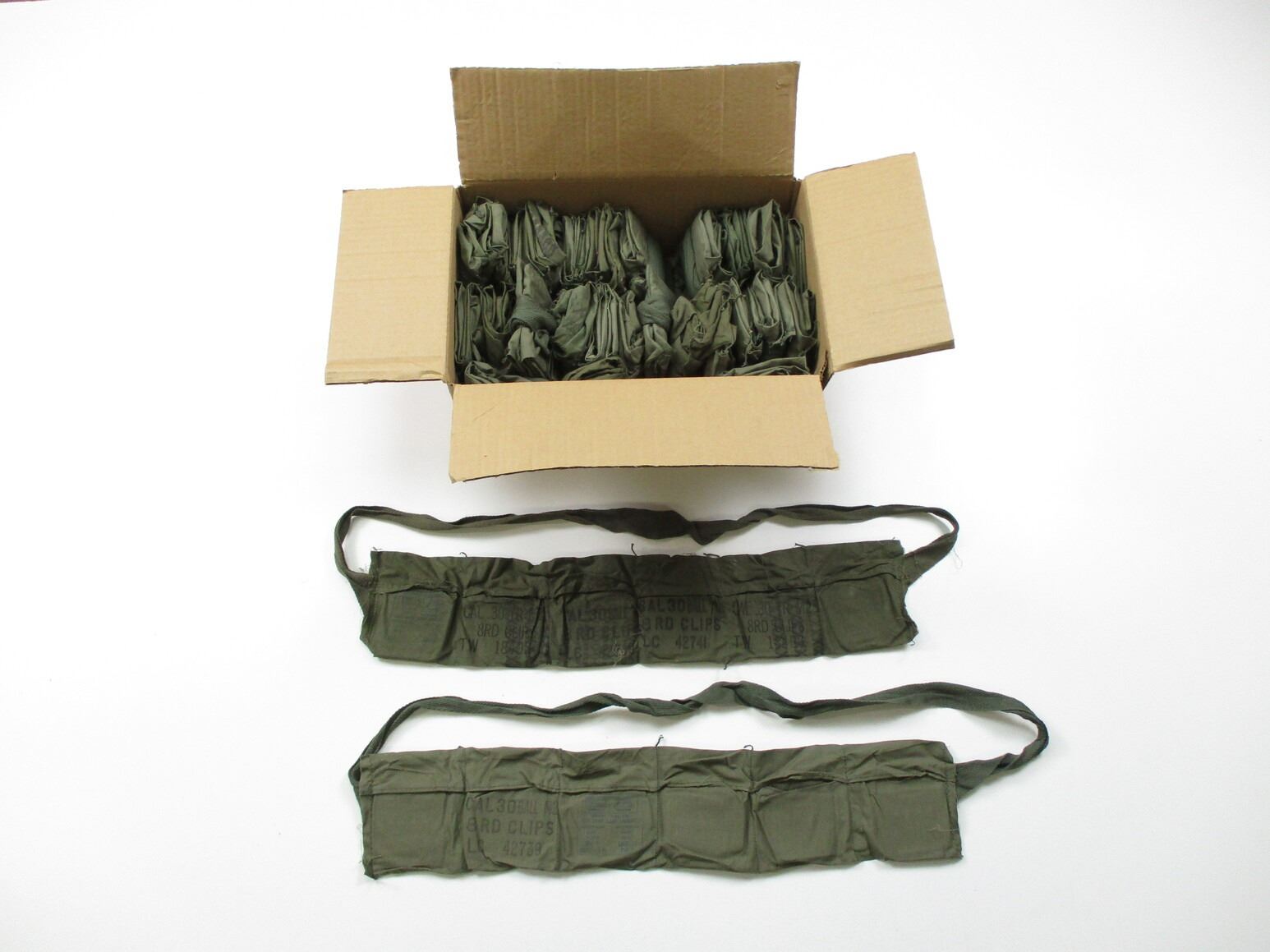 U.S. MILITARY M1 GARAND BANDOLIER LOT, APPROX. (30) BANDOLIERS, NO ENBLOCS, GREEN COTTON WITH CARDBOARD LINERS, VARIOUS MARKINGS / YEARS & LOT NUMBERS. SEE PHOTOS.
