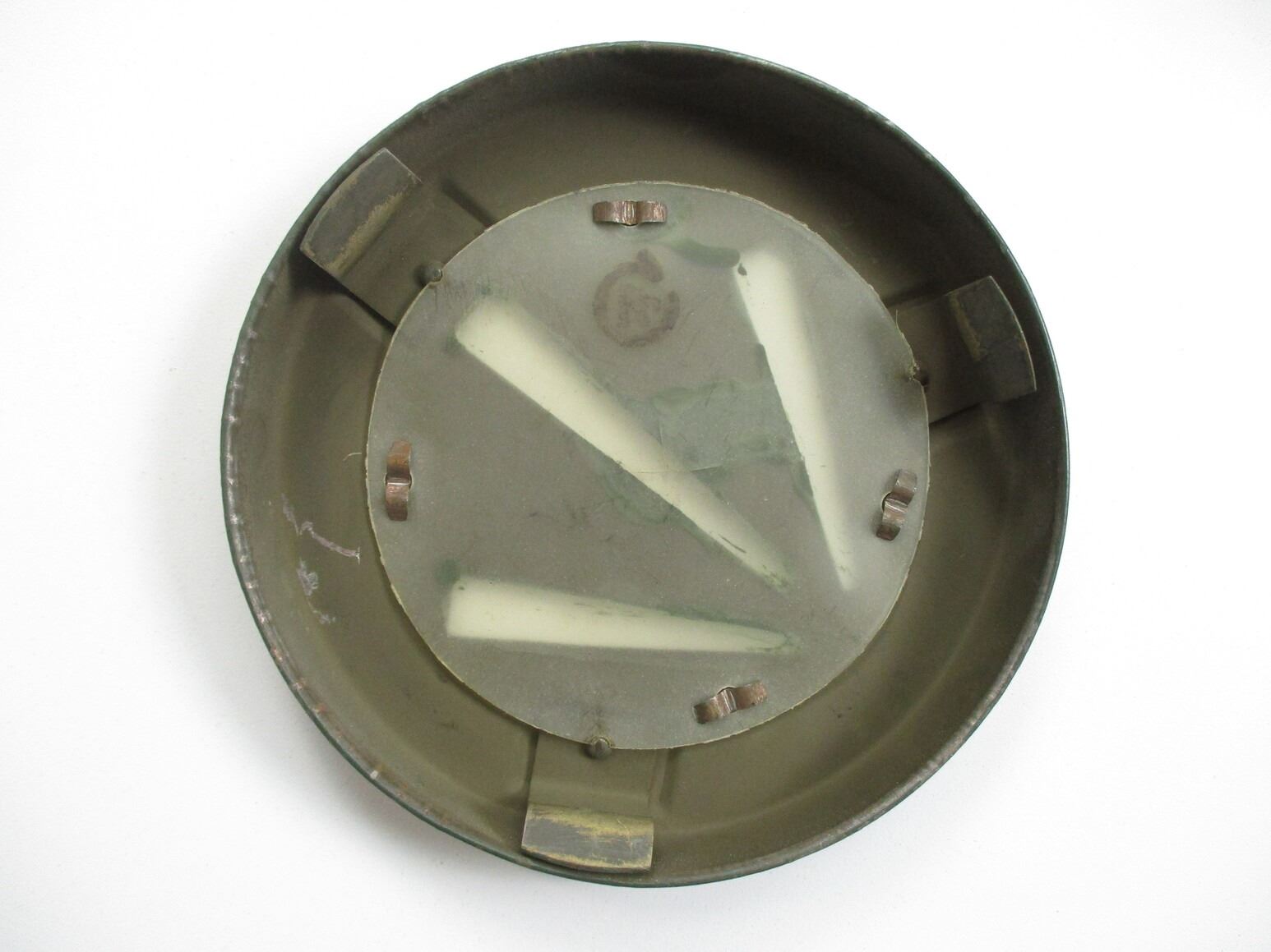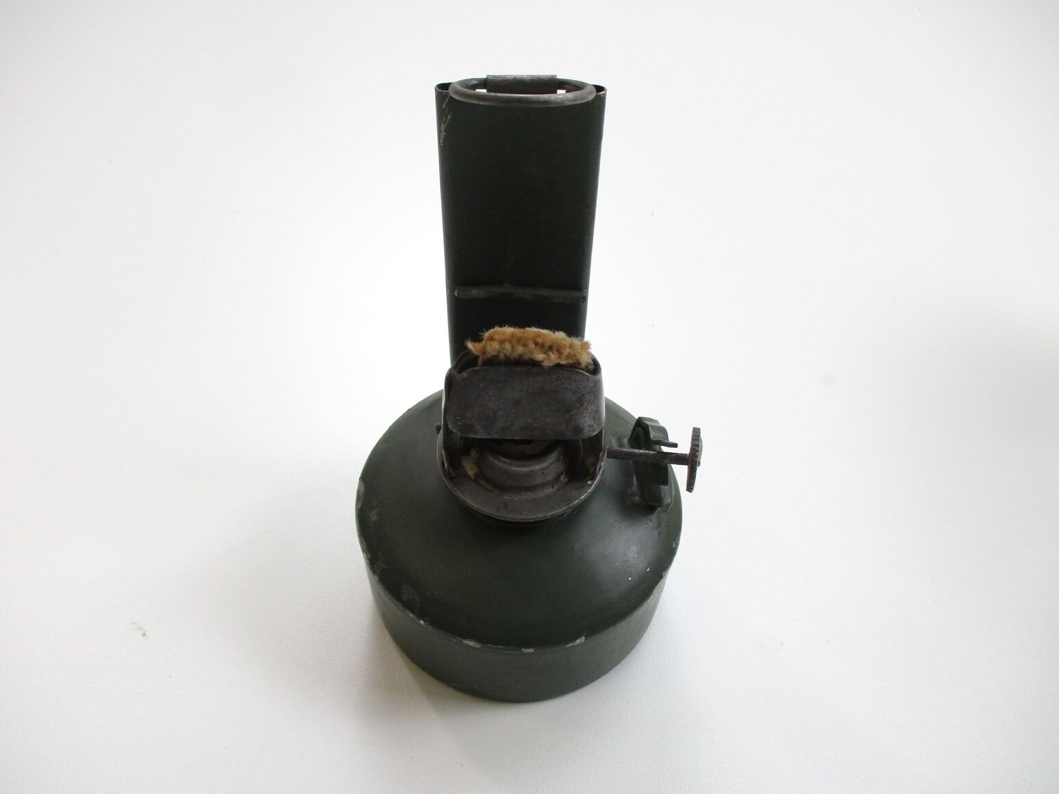 CANADIAN MILITARY RAILWAY SIGNAL LANTERN, (1) KEROSENE SIGNAL LAMP, RE-PAINTED GREEN WITH RED, BLUE & CLEAR LENSES, FRONT LENS COVER IS A BROAD ARROW, INSIDE HAS C-BROAD ARROW, NO OTHER VISIBLE MARKINGS, APPROX. 6" DIA. & 12.5" H. SEE PHOTOS. *NO GUARANTEE ON LENSES IF SHIPPING.*
