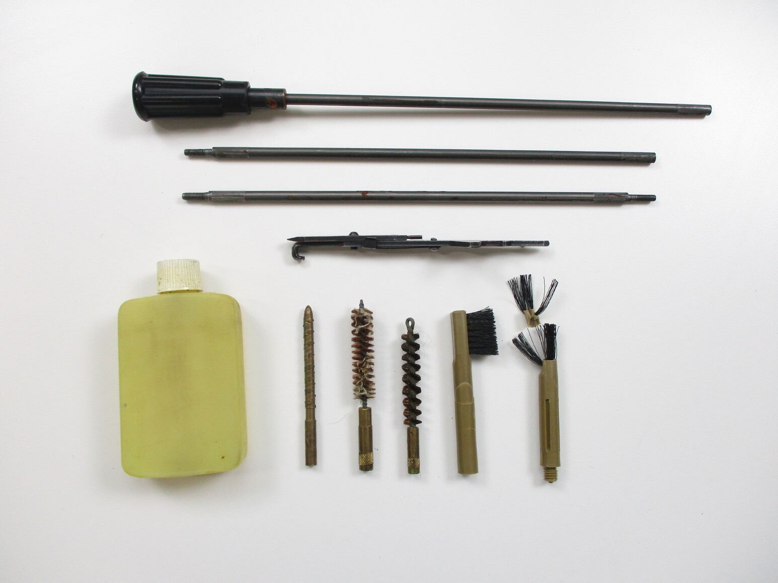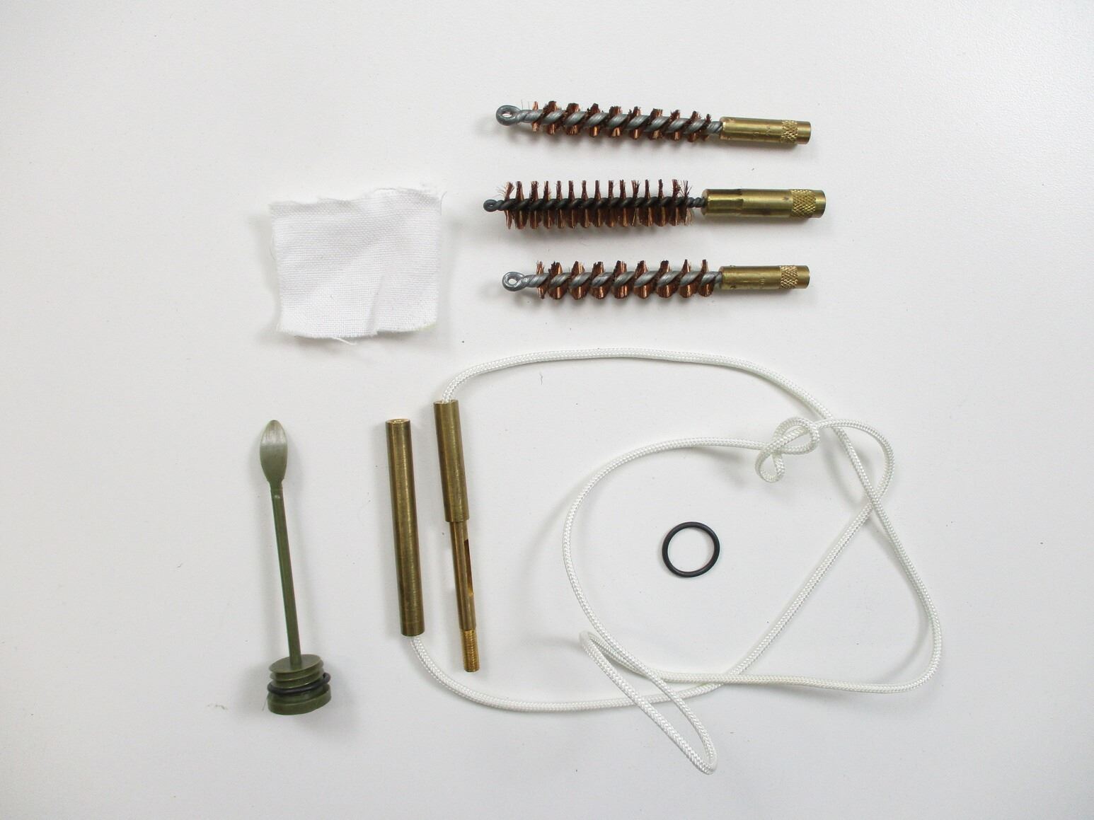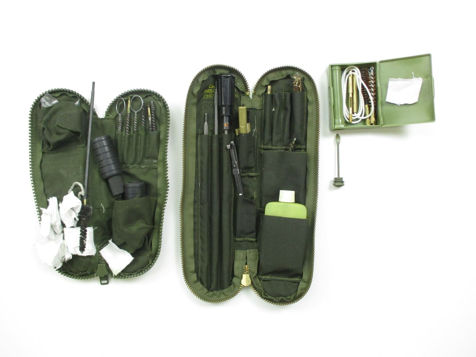 ASSORTED MILITARY CLEANING KIT LOT, LOT INCLUDES; (1) FN C1/C2 CLEANING KIT, GREEN CANVAS POUCH WITH RODS, BRUSHES, JAG, OILER, COMBO TOOL, ETC., NO VISIBLE MARKINGS, (1 CLEANING KIT, GREEN CANVAS, NO VISIBLE MARKINGS, THIS KIT IS NOT COMPLETE & (1) CLEANING KIT, GREEN PLASTIC WITH PULL-THRU & BRUSHES. SEE PHOTOS.