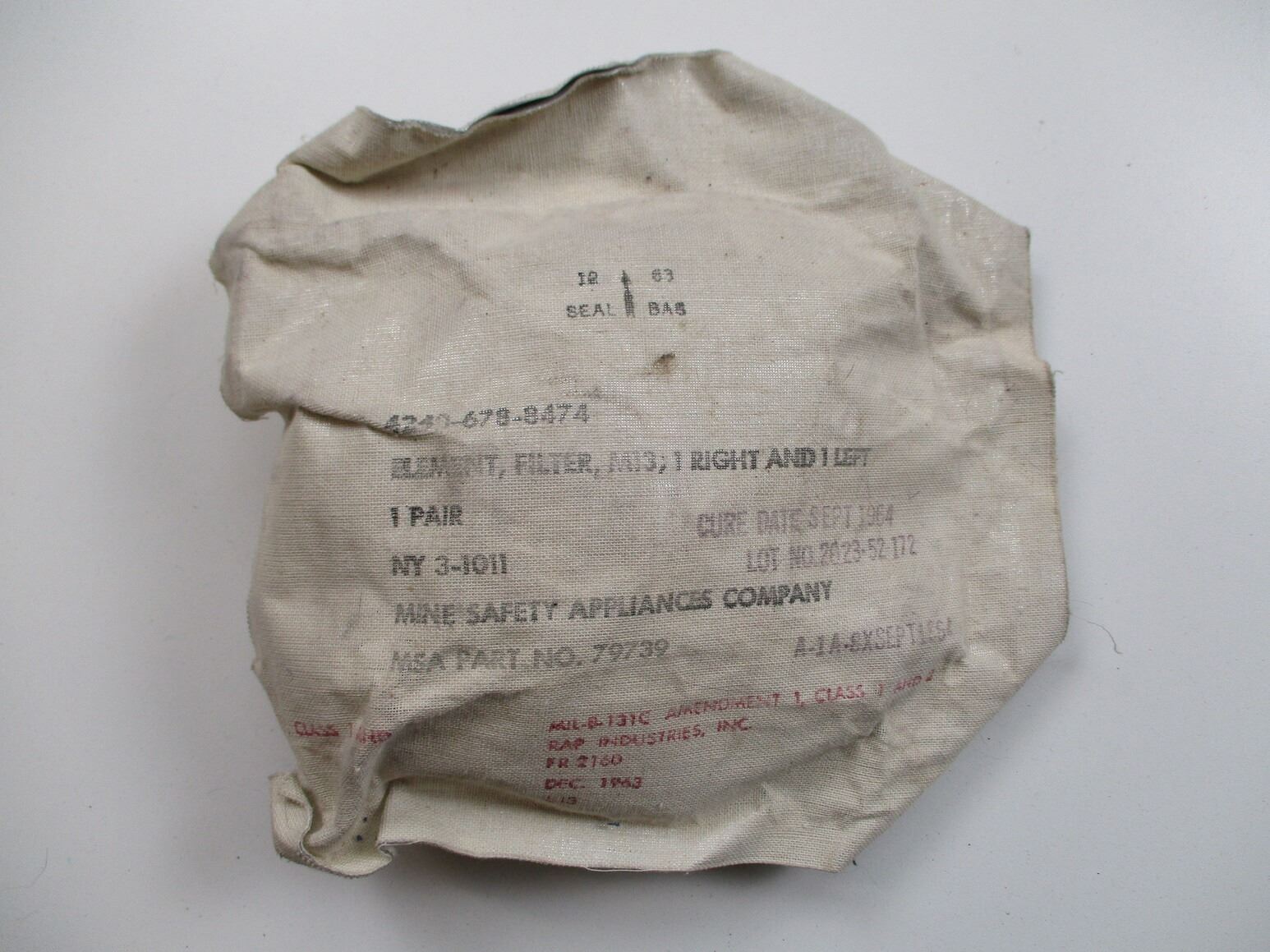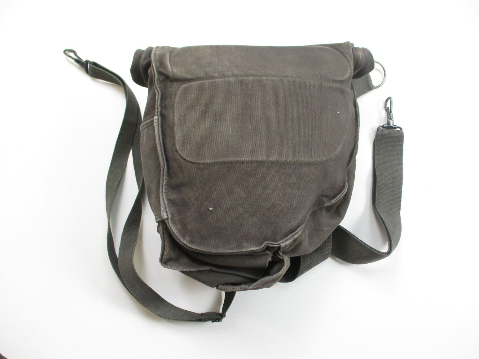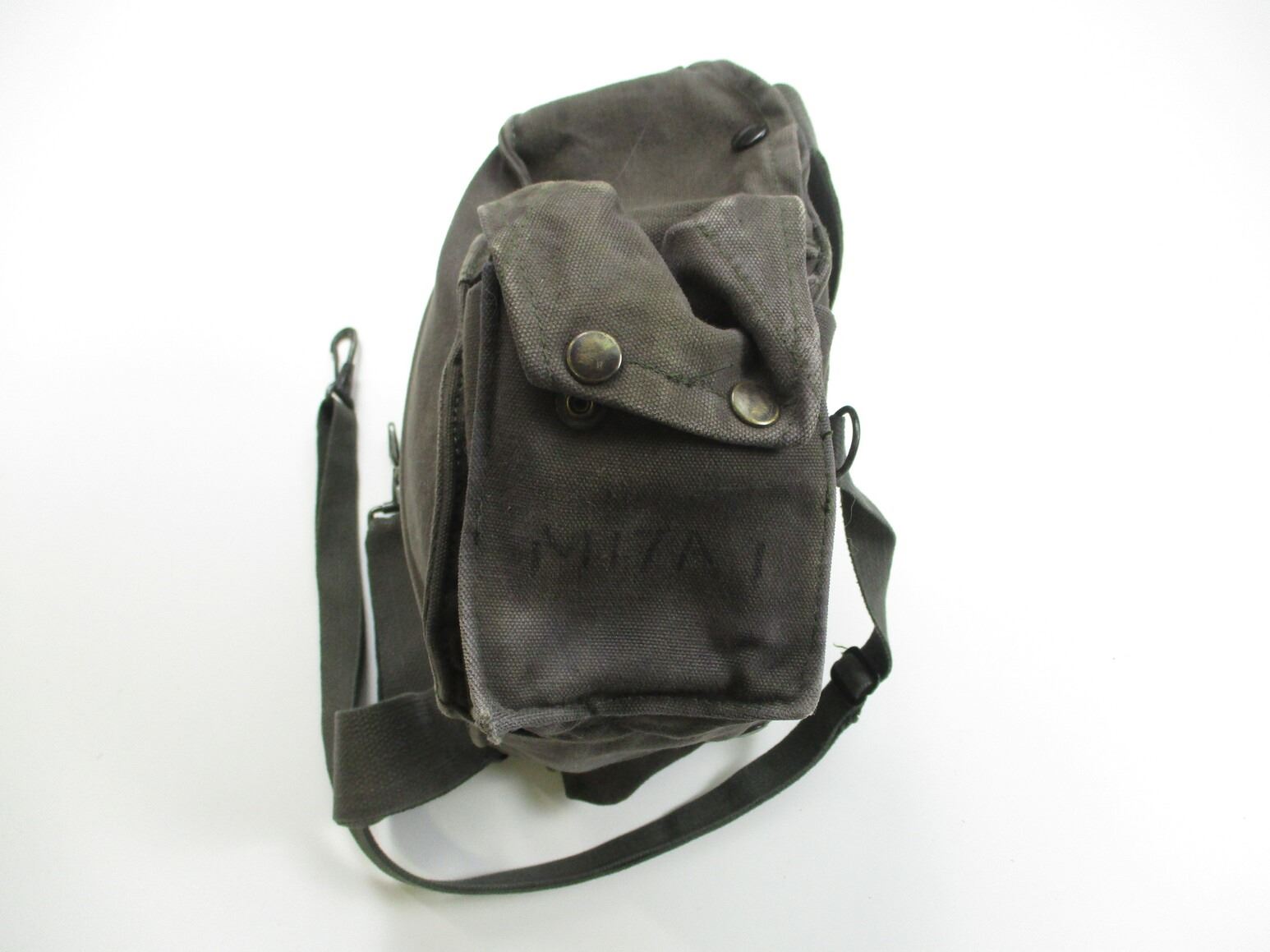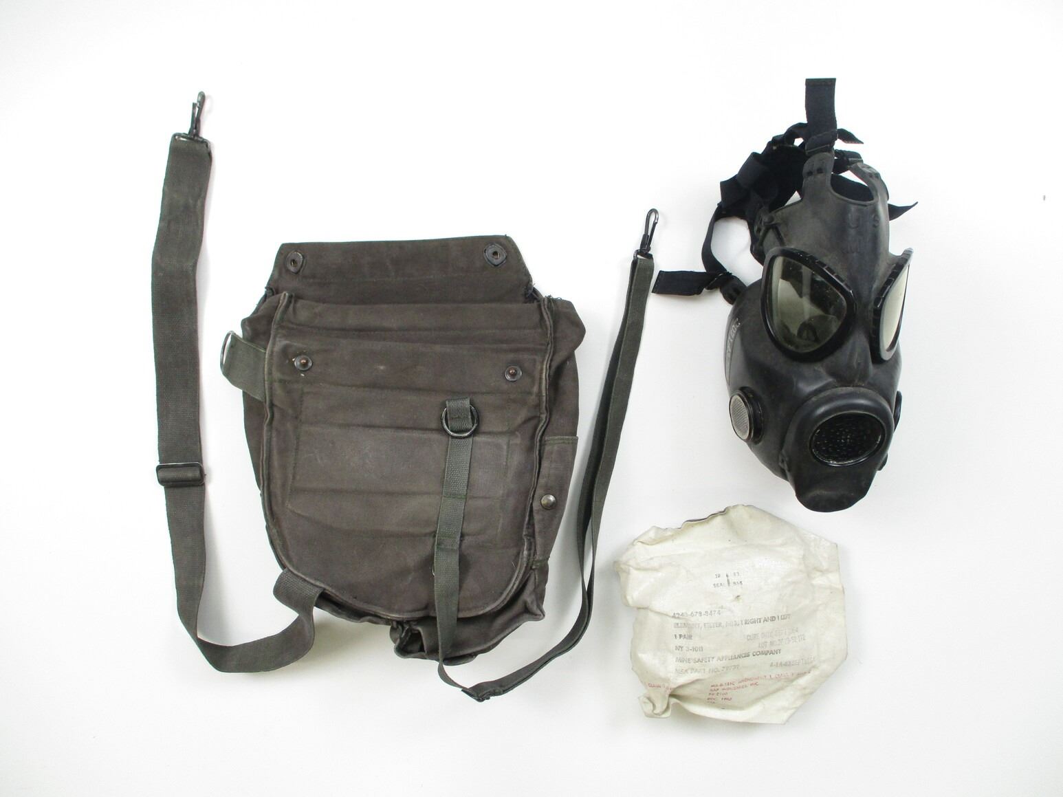 CANADIAN / U.S. MILITARY GAS MASK AND CARRY BAG LOT, LOT INCLUDES: (1) BLACK RUBBER GAS MASK WITH FILTER IN SEALED PACKAGING, MASK MARKED: "U S, M", "2021-43-2306" & MAKER'S PROOF, FILTER PACKAGE MARKED: "ELEMENT, FILTER, M13, 1 RIGHT AND 1 LEFT" ETC. & (1) GREY CANVAS CARRY BAG WITH SHOULDER STRAP, FAINT / UN-CLEAR MARKINGS. SEE PHOTOS.