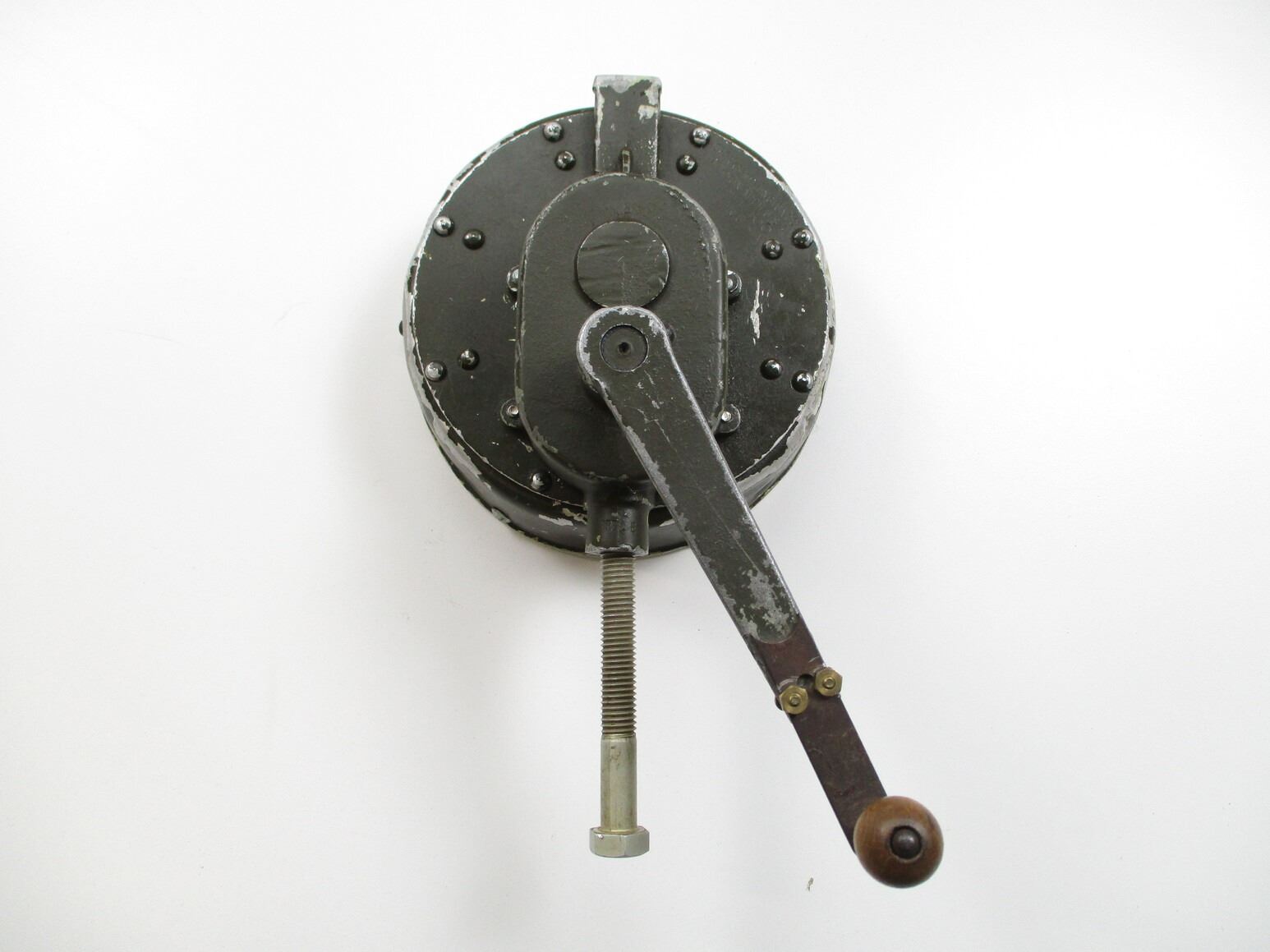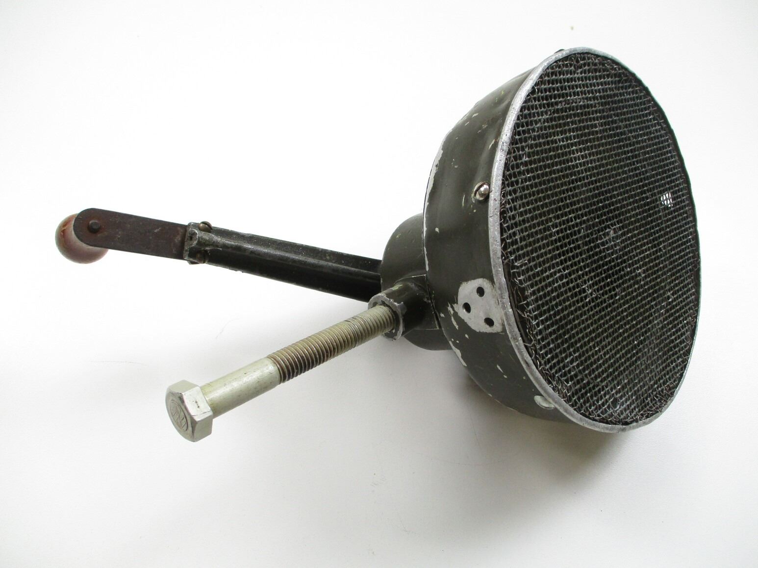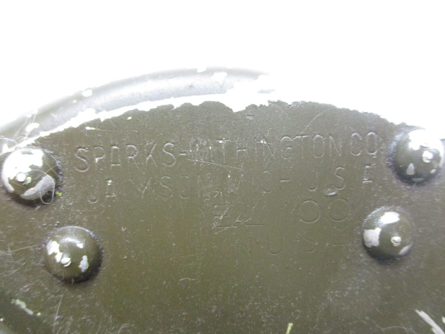 U.S. M100 AIR RAID SIREN, (1) SIREN WITH MODIFIED HANDLE, GREEN PAINT, MARKED: "SPARKES-WITHINGTON CO., JACKSON, MICH U.S.A., MODEL 100, MADE IN U.S.A.", SHOWS WEAR, WORKS. SEE PHOTOS.