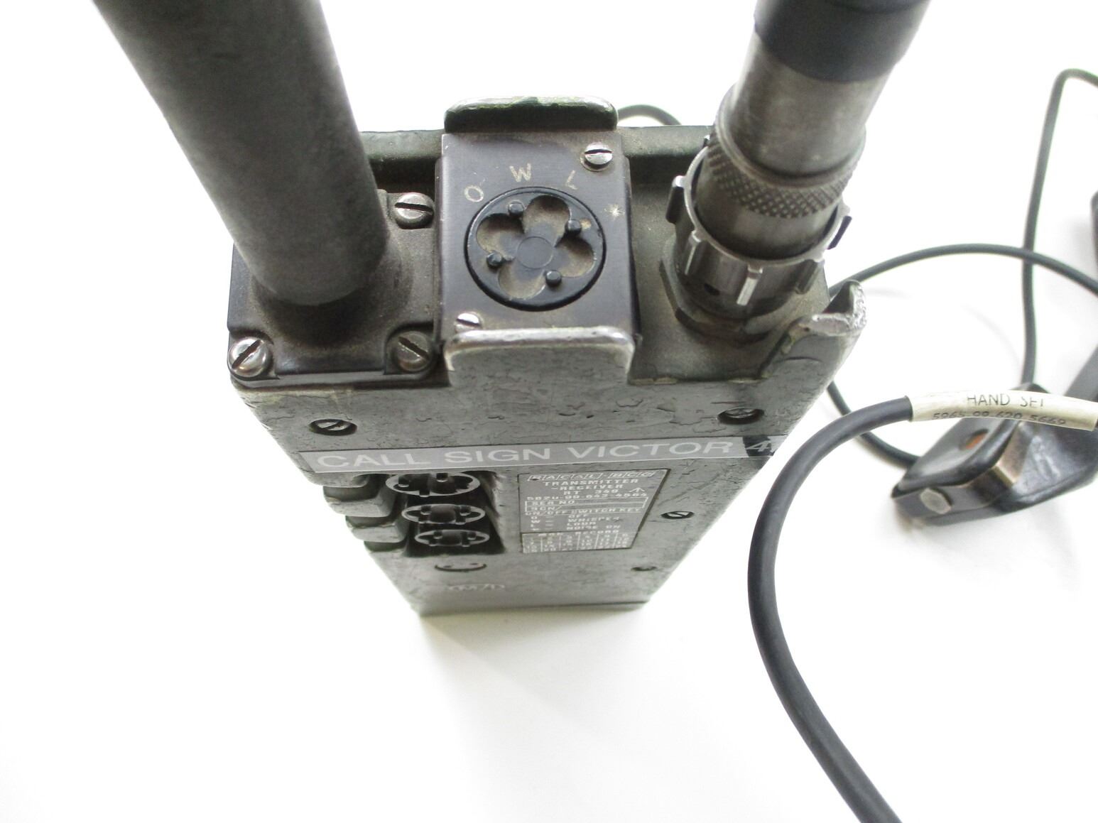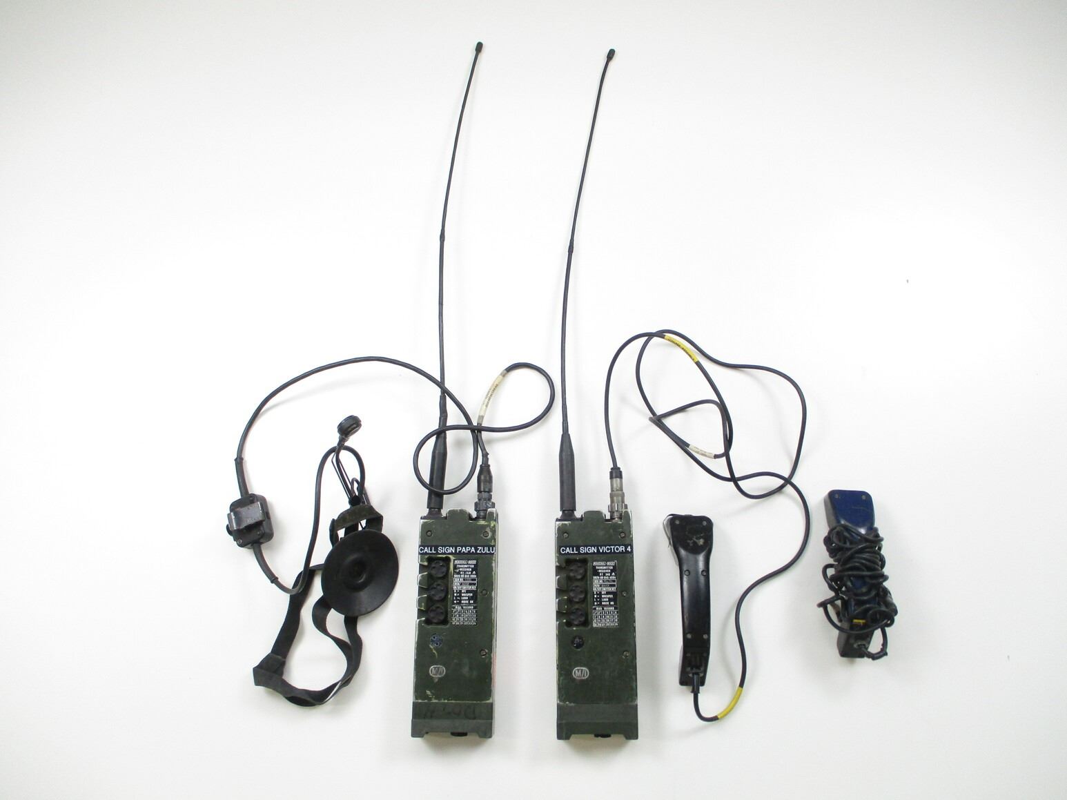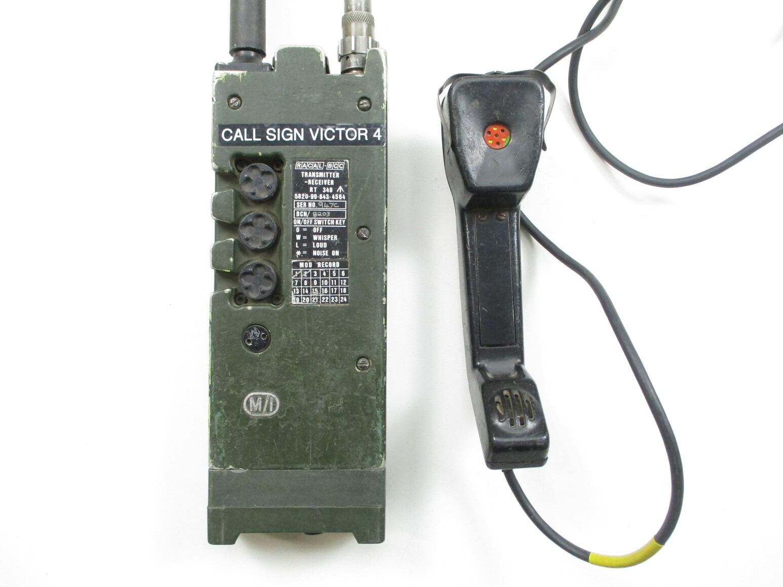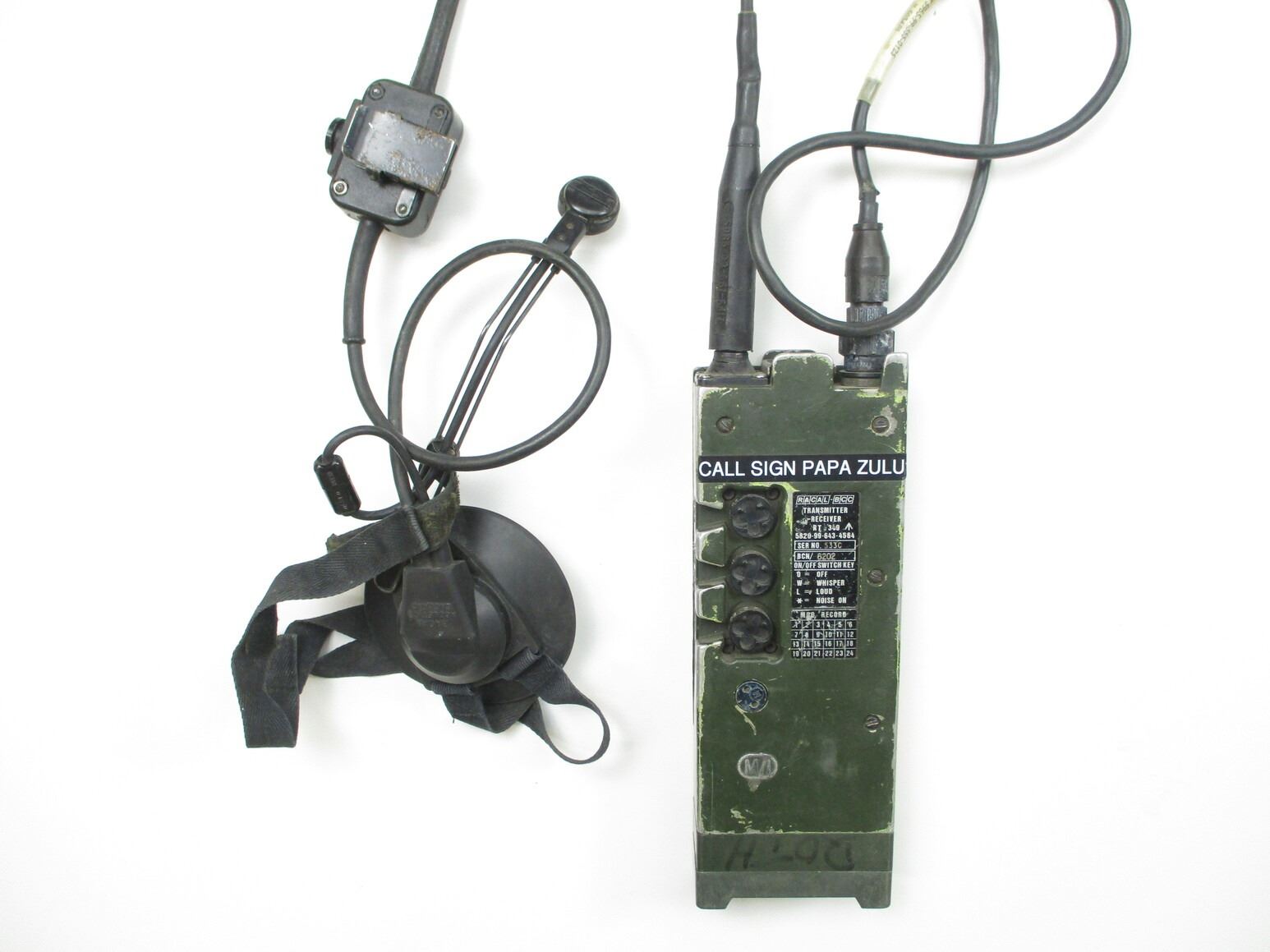 BRITISH MILITARY RADIO SET WITH HEADSET LOT, LOT INCLUDES; (2) GREEN RADIOS, MARKED: ""RACAL-BCC, TRANSMITTER RECEIVER, RT 349, 5820-99-643-4584, SERIAL NO. 533C, BCN: 8202 / SERIAL NO. 947C, BNC: 8203", ETC. WITH (1) HEADSET (EAR & MICROPHONE PIECE) & (2) TELEPHONE STYLE HAND-HELD HEADSETS, CONSIGNOR STATES: "WORKS", UN-TESTED. SEE PHOTOS.