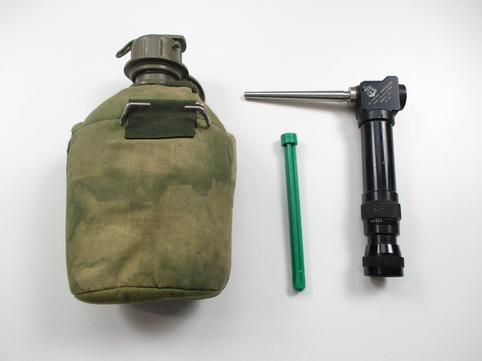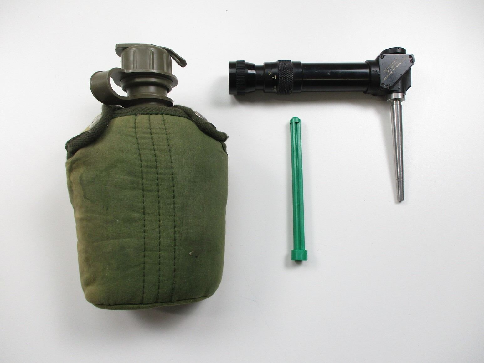 ASSORTED MILITARY, ETC. LOT, LOT INCLUDES; (1) PLASTIC CANTEEN WITH CASE, (1) U.S. NAVY BORE SCOPE, MARKED: "ULTRASONIC CORPORATION, PART NO. A122-500, SERIAL NO. AF-74" & "WOLLENSAK 5X BORESIGHT, CONTRACT NO. AF 33(600)9382", LOSE PART INSIDE & (1) PLASTIC SHOTGUN PLUG. SEE PHOTOS.