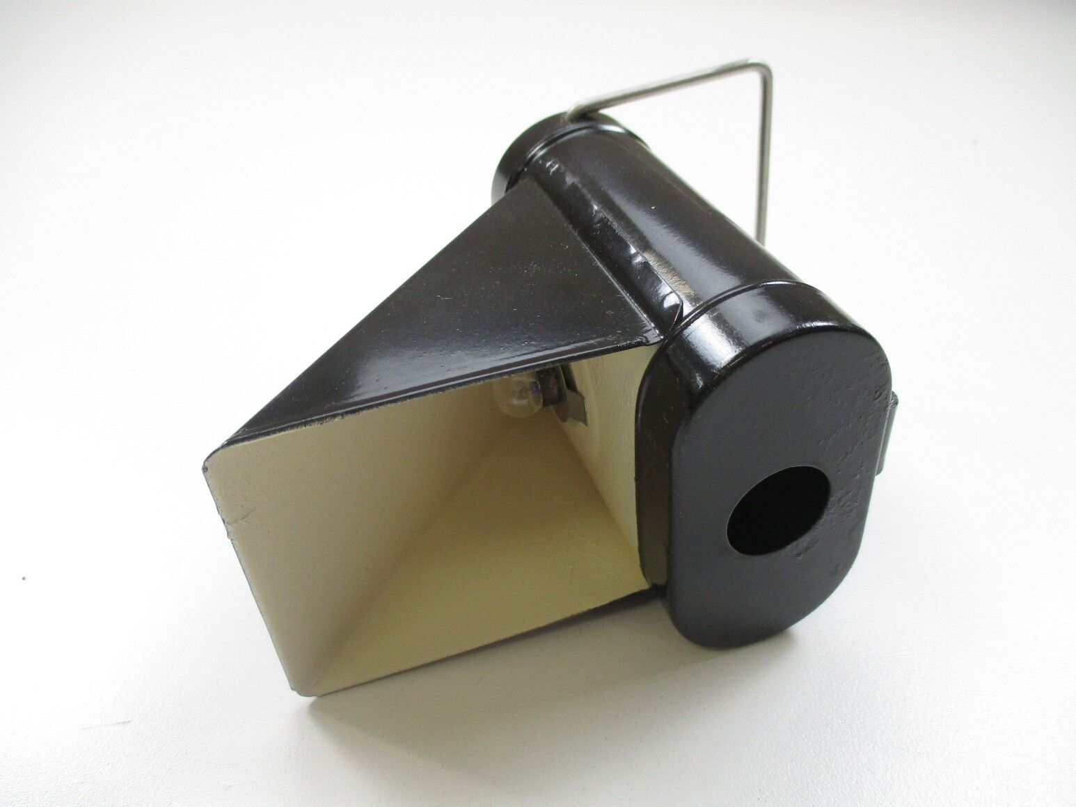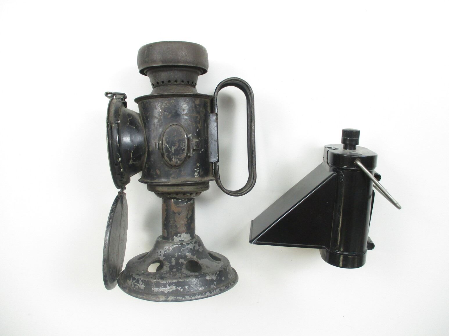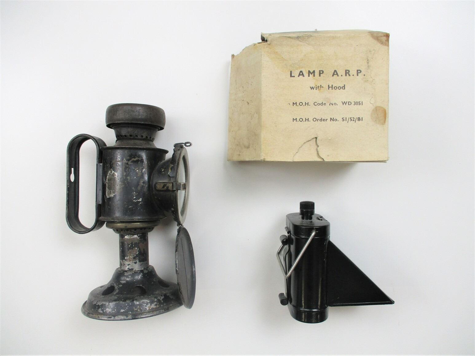 WWII BRITISH AIR RAID PRECAUTIONS LAMP LOT, LOT INCLUDES; (1) IN BOX, ELECTRIC LAMP, UNMARKED, BOX MARKED: "LAMP A.R.P. WITH HOOD, M.O.H. CODE NO. WD3051, M.O.H. ORDER NO. S1/52/B1", APPROX 4.5" X 5" & (1) OIL LAMP, CAN BE USED TO BREW TEA, MARKED: "MADE BY T.E. BLANDON & SON LTD, 1941" & BROAD ARROW, APPROX. 5" DIA. & OAL APPROX. 8".