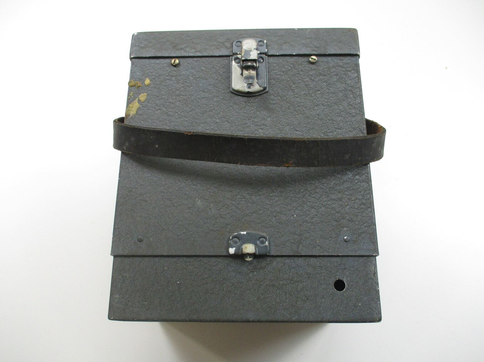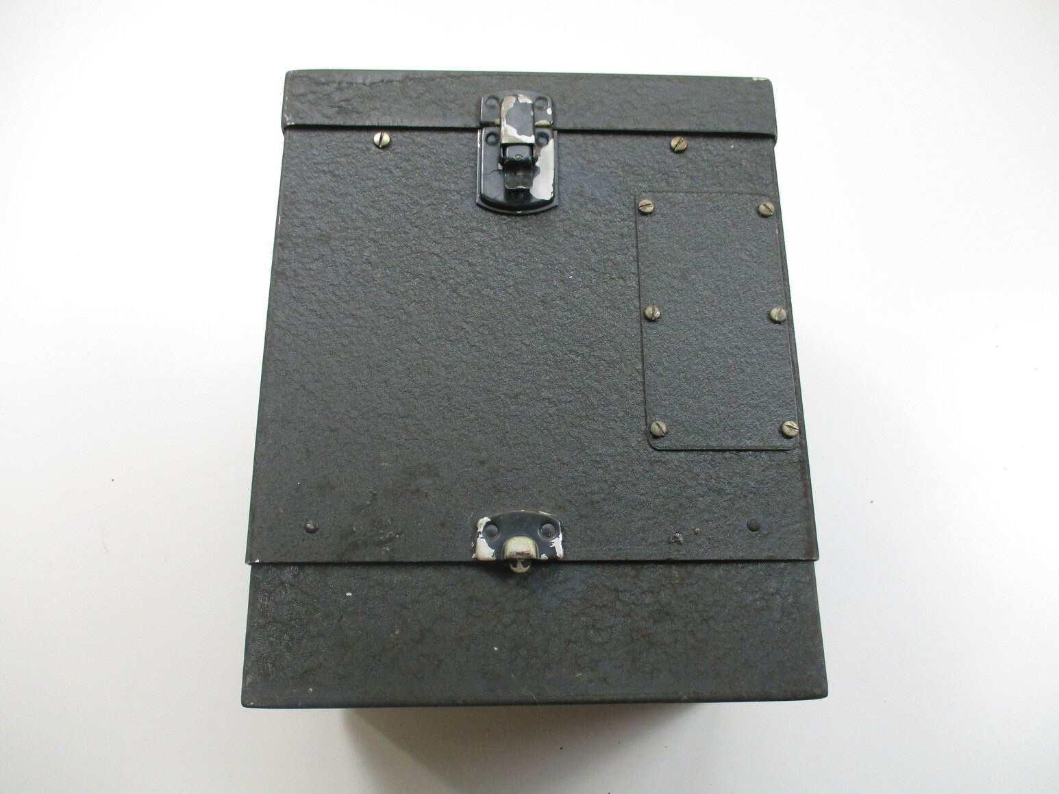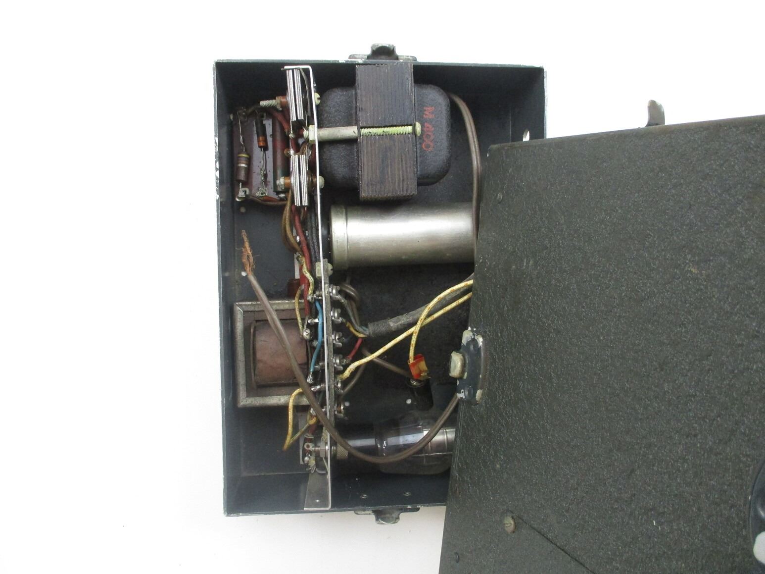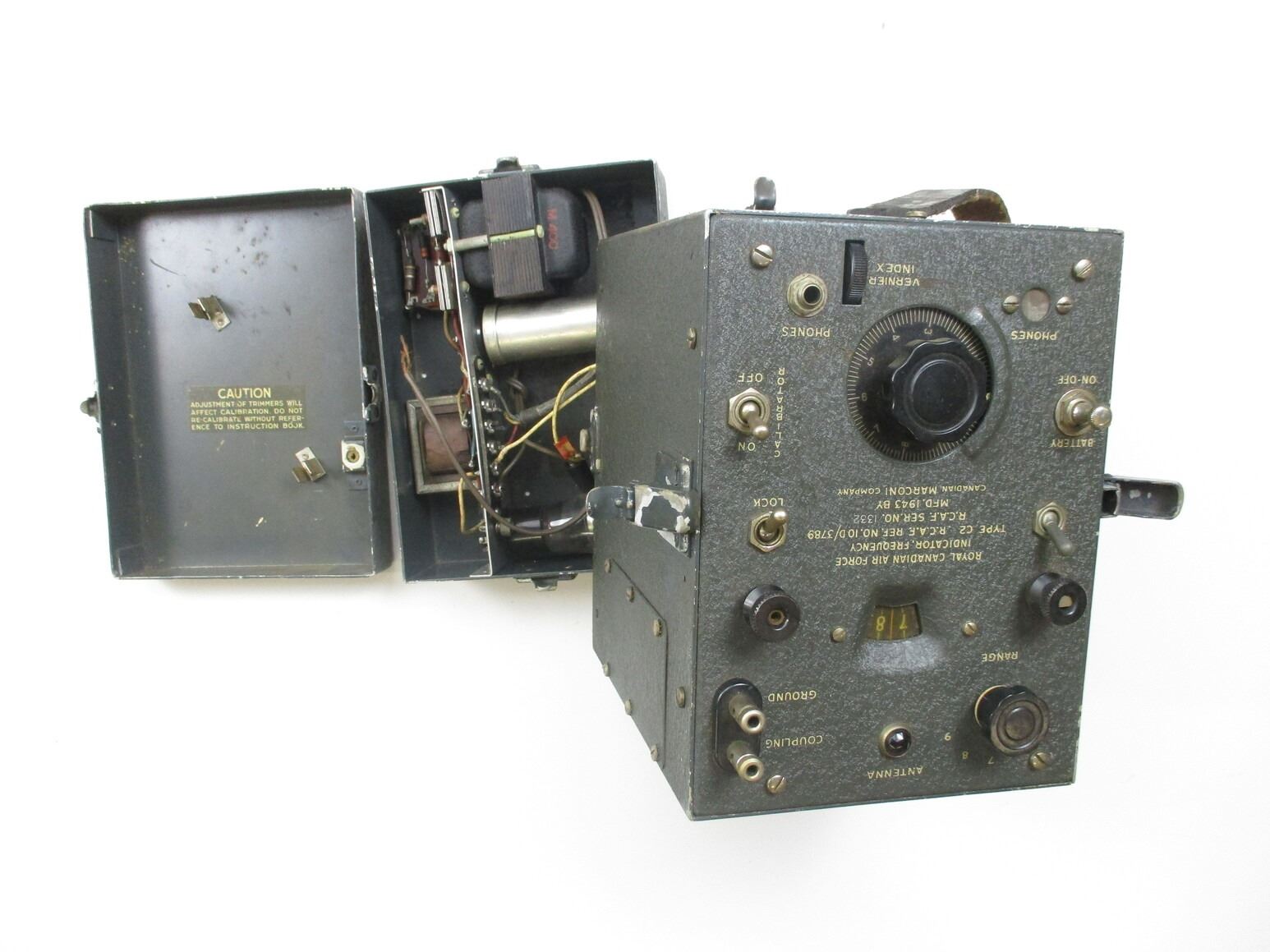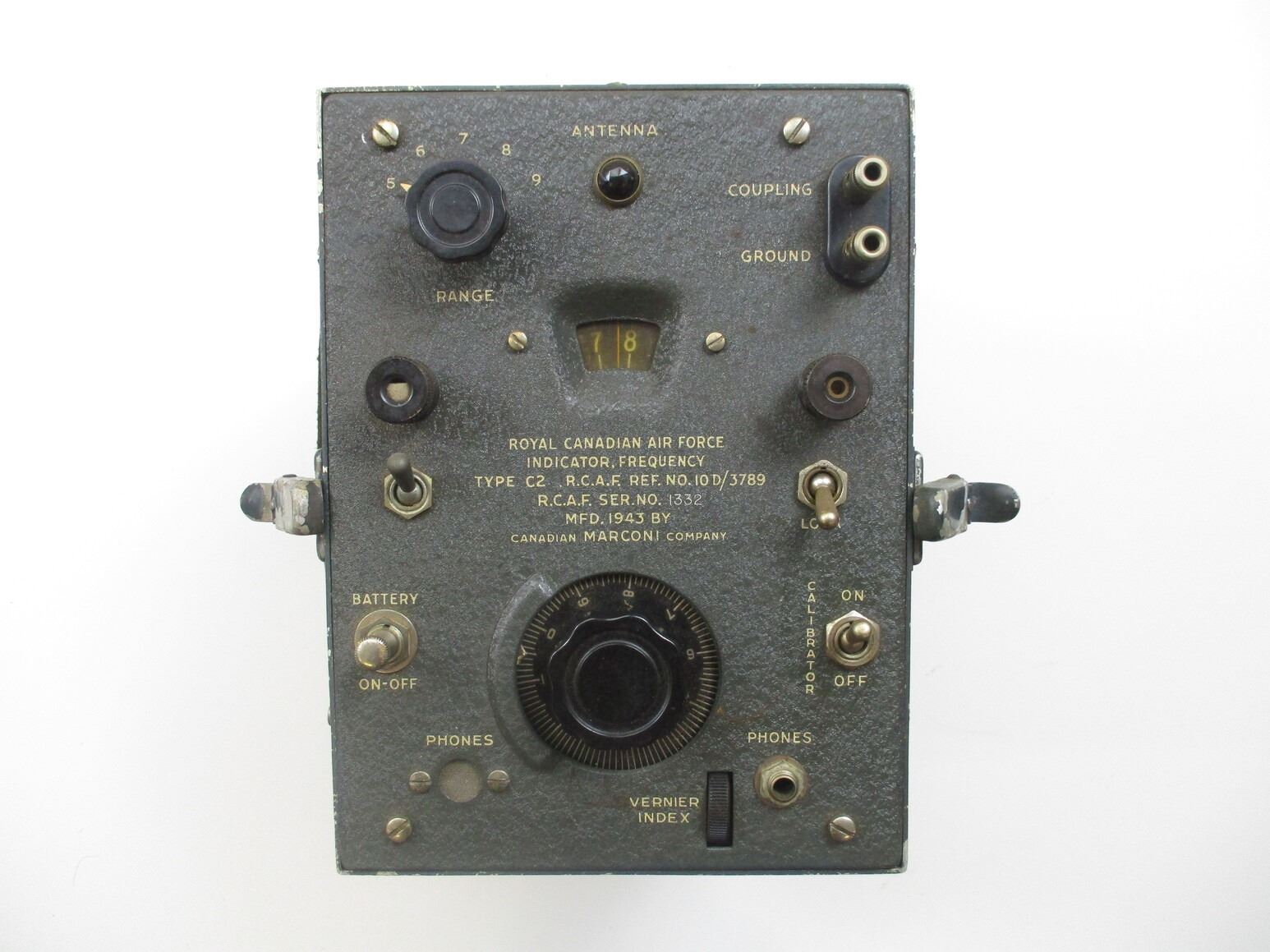 WWII RCAF INDICATOR FREQUENCY TYPE C2, (1) USED IN AIRCRAFT, MOBILE STATION(S) OR FIXED GROUND UNDER WIDE RANGES OF ATMOSPHERIC CONDITIONS, TYPE C2 IS A DIRECT READING HETERODYNE TYPE FREQUENCY MEASURING INSTRUMENT, GREEN PAINTED METAL WITH LEATHER CARRY HANDLE, MARKED: "ROYAL CANADIAN AIR FORCE, INDICATOR, FREQUENCY, TYPE C2, R.C.A.F. REF NO. IOD/3789, R.C.A.F. SER. NO. 1332, MFD. 1943 BY CANADIAN MARCONI COMPANY", APPROX. 9.5" X 7" X 11.75". SEE PHOTOS.