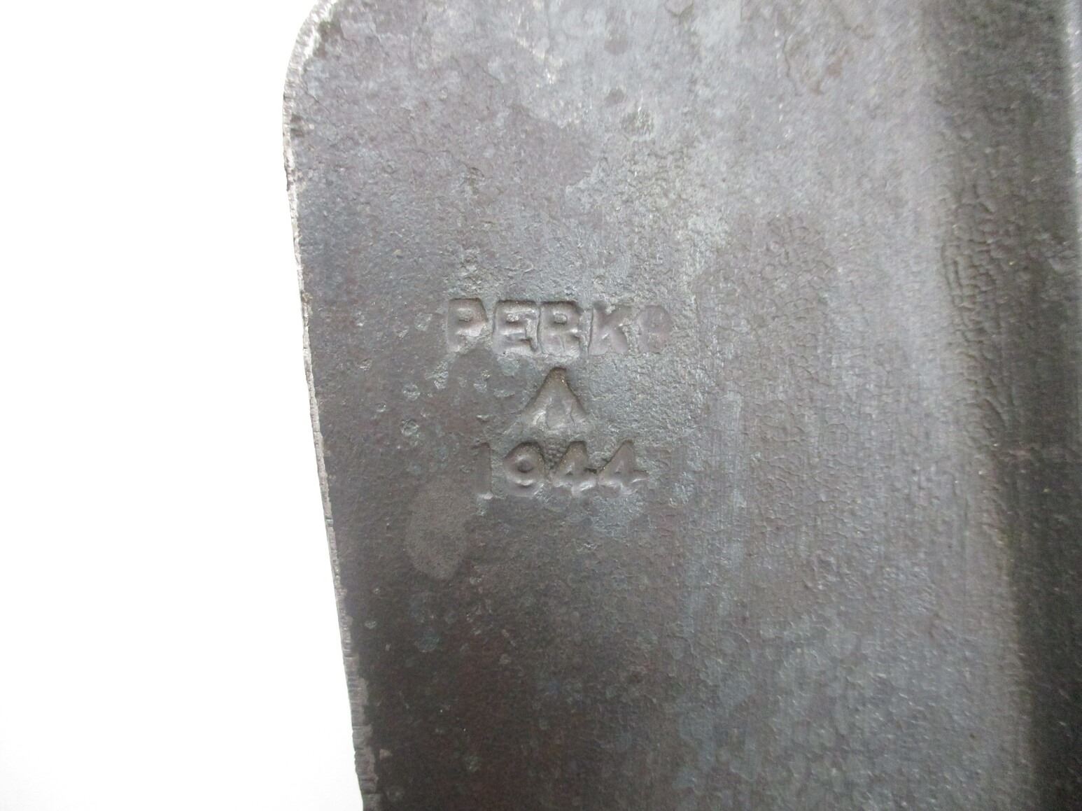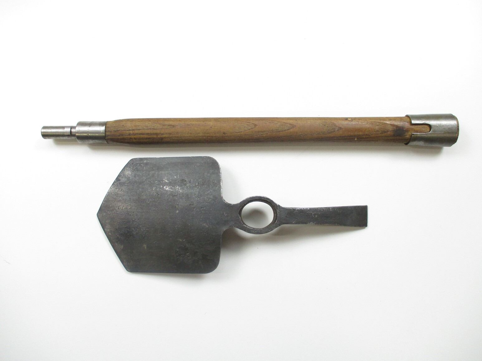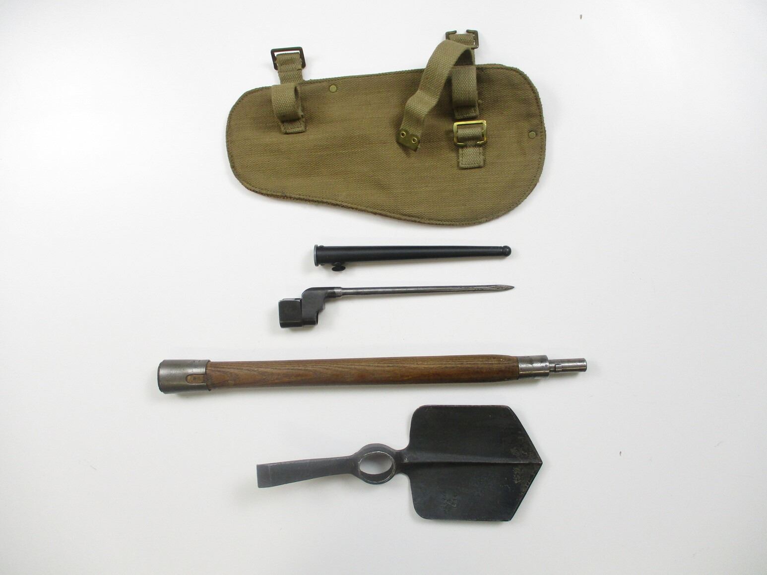WWII BRITISH ENTRENCHING TOOL SET, LOT INCLUDES; (1) TOOL MARKED: "PERKS, 1944" & BROAD ARROW (1) HELVE, WOOD WITH BAYONET LUGS, (1) P37 CASE MARKED: "PSA 1943" & OTHER VARIOUS INK MARKINGS & (1) NO.4 MKII SOCKET BAYONET, FITS END OF HELVE & LEE ENFIELD NO.4 MKII RIFLES, SOCKET MARKED: "G" CROWN "R" OVER "NO 4 MKII" OVER "S M" & "N67", METAL SCABBARD, NO VISIBLE MARKINGS, BLADE APPROX. 8" & OAL APPROX. 9 7/8". SEE PHOTOS.