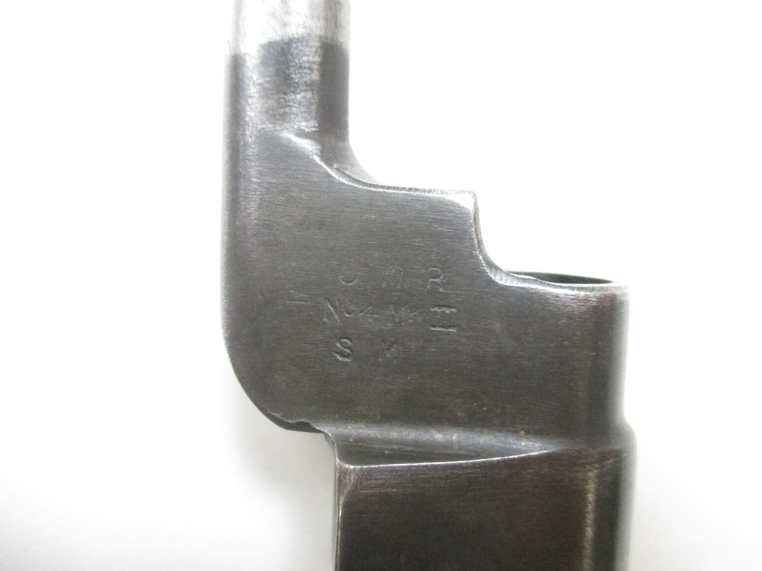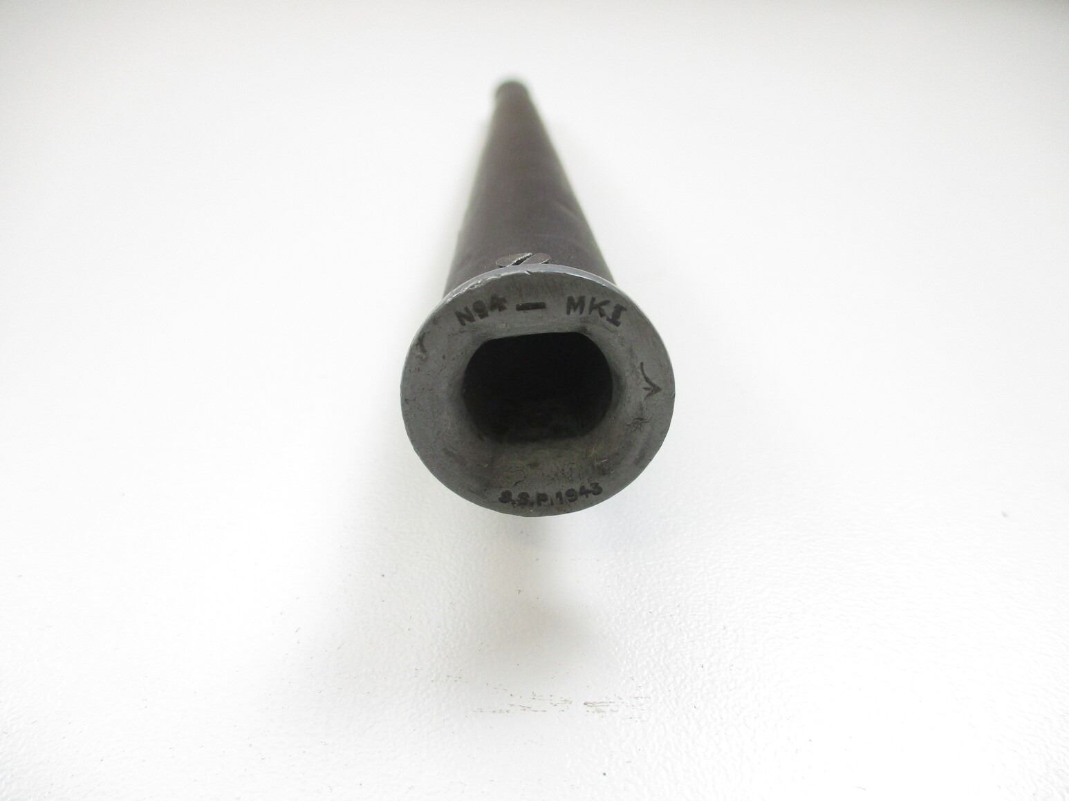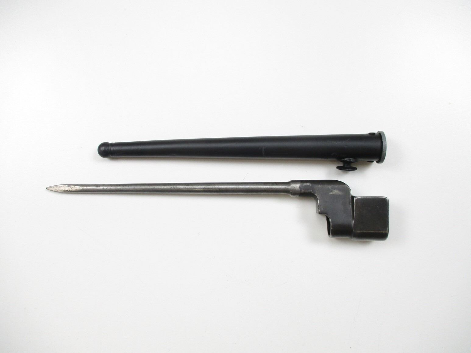 WWII BRITISH ENTRENCHING TOOL SET, LOT INCLUDES; (1) TOOL MARKED: "PERKS, 1944" & BROAD ARROW (1) HELVE, WOOD WITH BAYONET LUGS, (1) P37 CASE MARKED: "PSA 1943" & OTHER VARIOUS INK MARKINGS & (1) NO.4 MKII SOCKET BAYONET, FITS END OF HELVE & LEE ENFIELD NO.4 MKII RIFLES, SOCKET MARKED: "G" CROWN "R" OVER "NO 4 MKII" OVER "S M" & "N67", METAL SCABBARD, NO VISIBLE MARKINGS, BLADE APPROX. 8" & OAL APPROX. 9 7/8". SEE PHOTOS.
