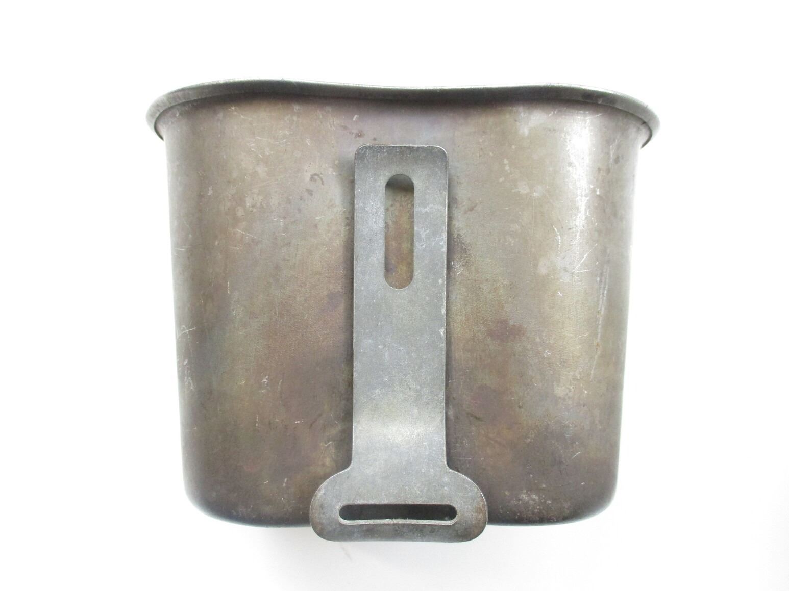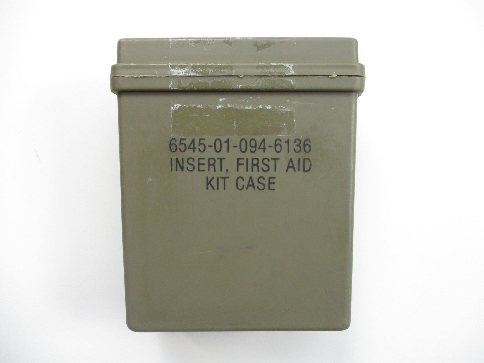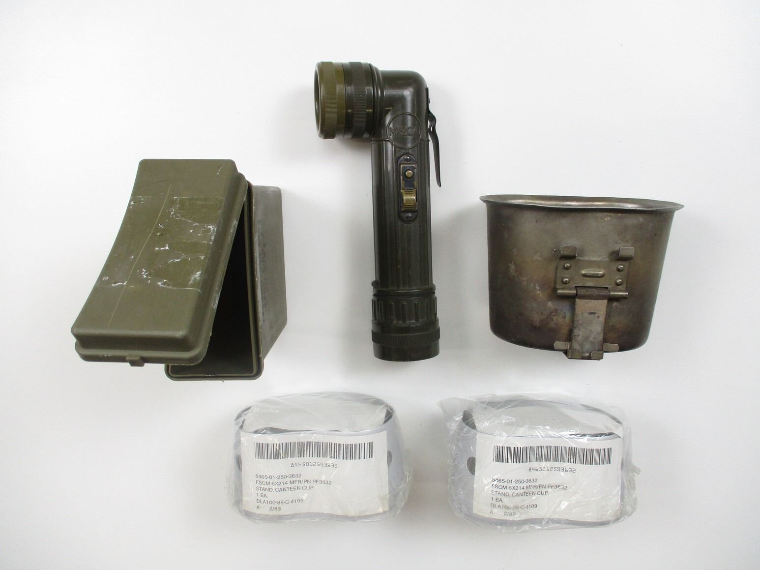 ASSORTED MILITARY ACCESSORIES LOT, LOT INCLUDES; (1) CANTEEN CUP WITH HANDLE, MARKED: "VOLLRATH, 1962", (2) NSN, STAND CANTEEN CUP, NOS, (1) GREEN PLASTIC FIRST AID KIT CASE (EMPTY) & (1) ANGLE-HEAD MILITARY FLASHLIGHT, UN-TESTED. SEE PHOTOS.