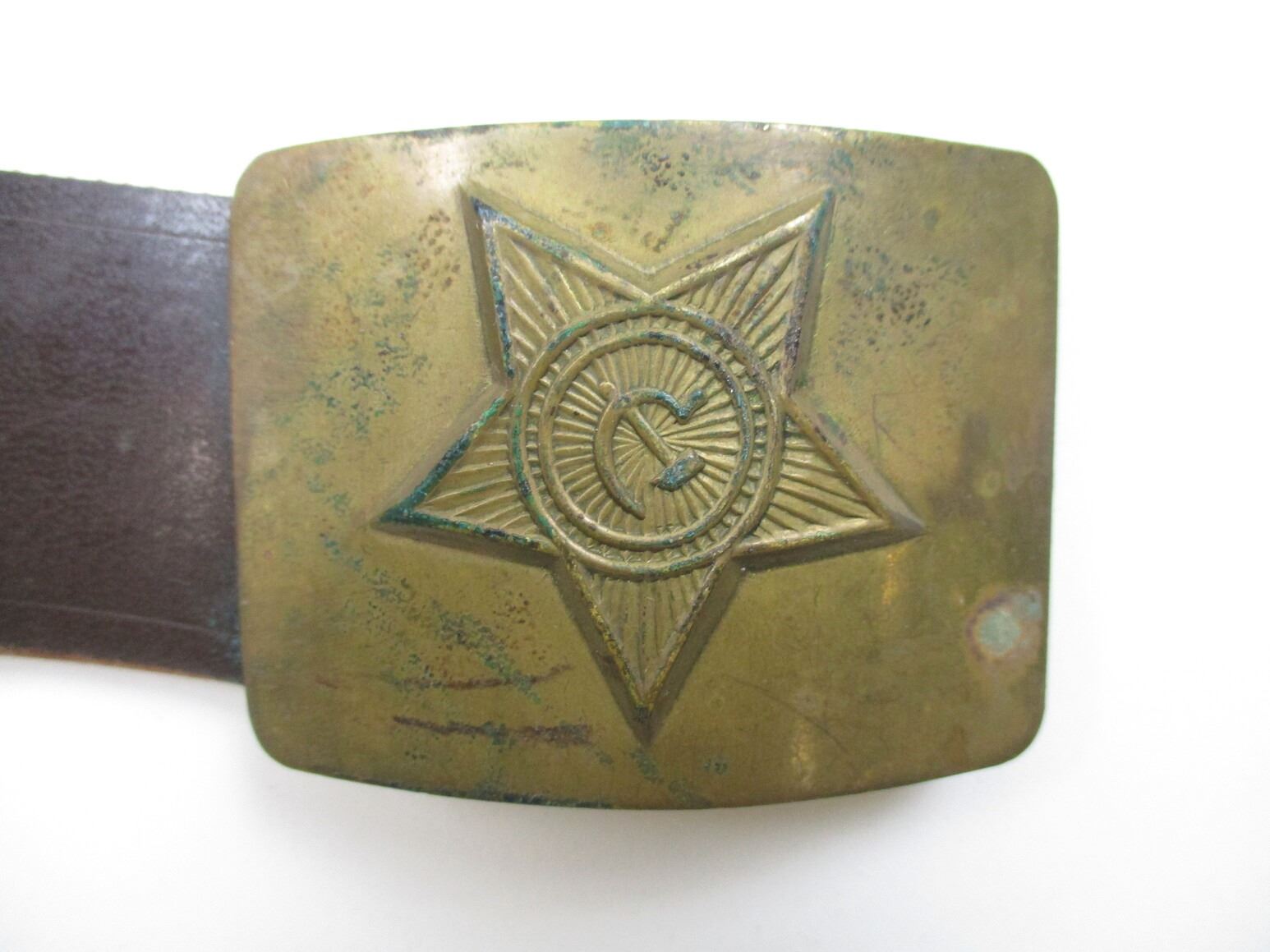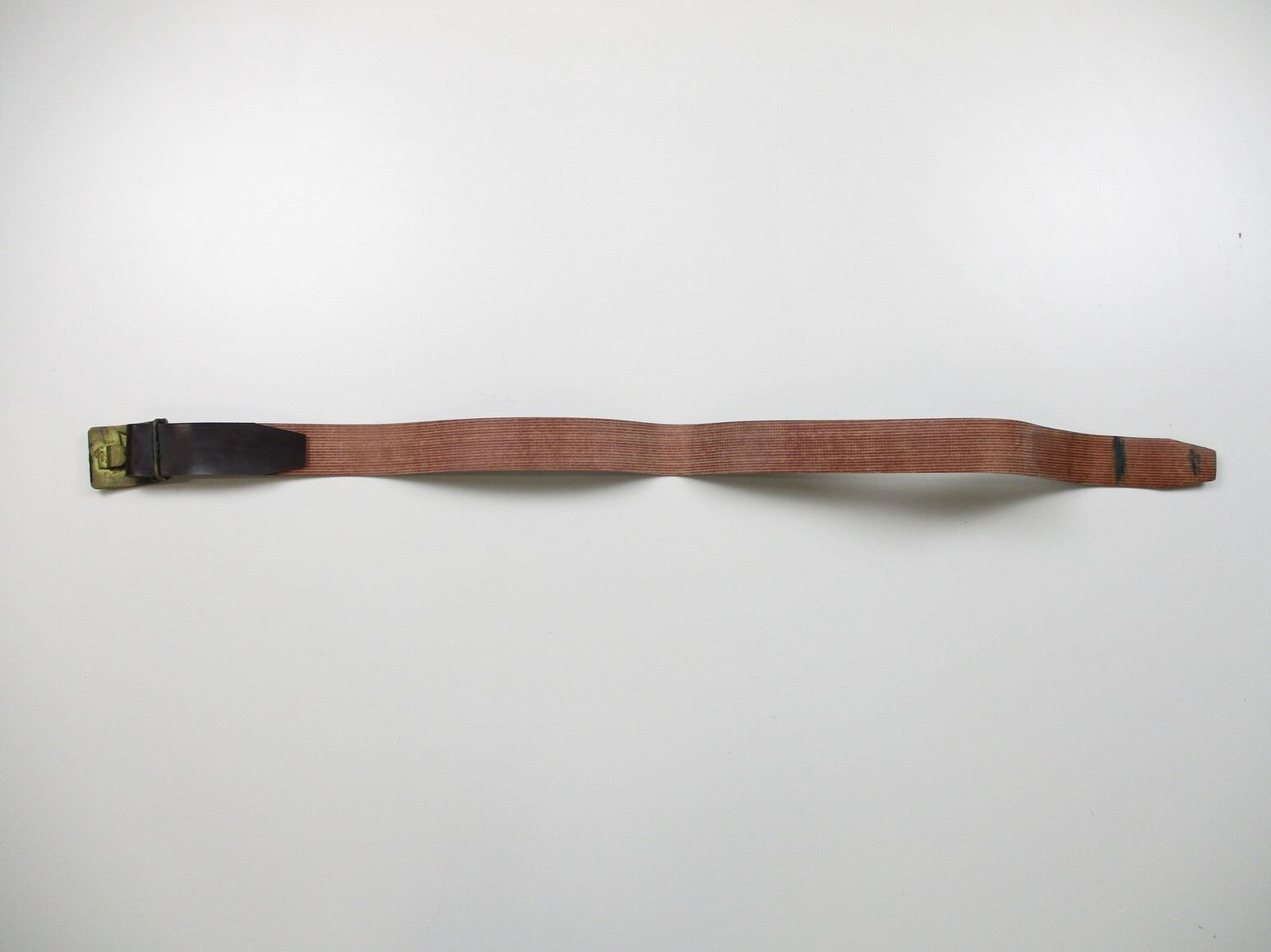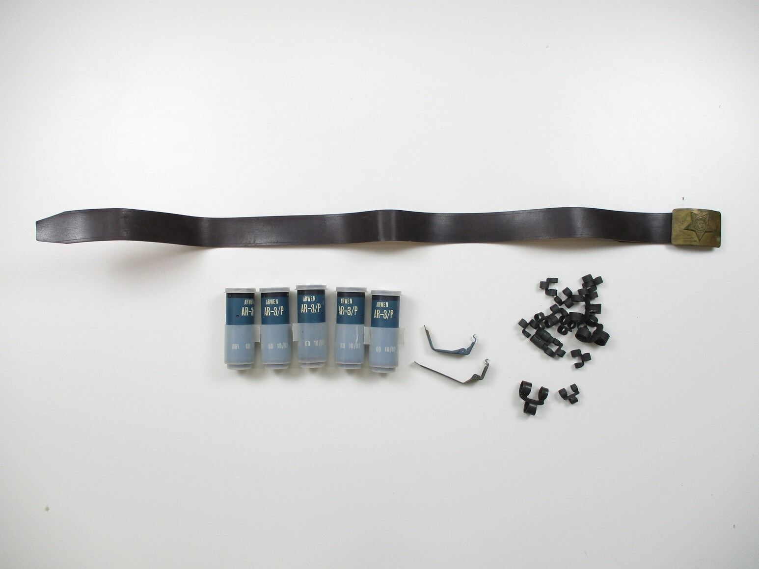 ASSORTED MILITARY ACCESSORIES LOT, LOT INCLUDES; (1) BROWN BELT WITH COMBLOC BELT BUCKLE, NO VISIBLE MARKINGS, OAL APPROX. 42", ADJUSTABLE, (2) GRENADE SPOONS, (14) .30 CAL. LINKS, (3) 50 M2 LINKS & (5) 37MM RIOT CASINGS, MARKED: "ARWEN AR-3/P, 001 GD 10/82", APPROX. 2" DIA. & OAL APPROX. 5 5/8". SEE PHOTOS.
