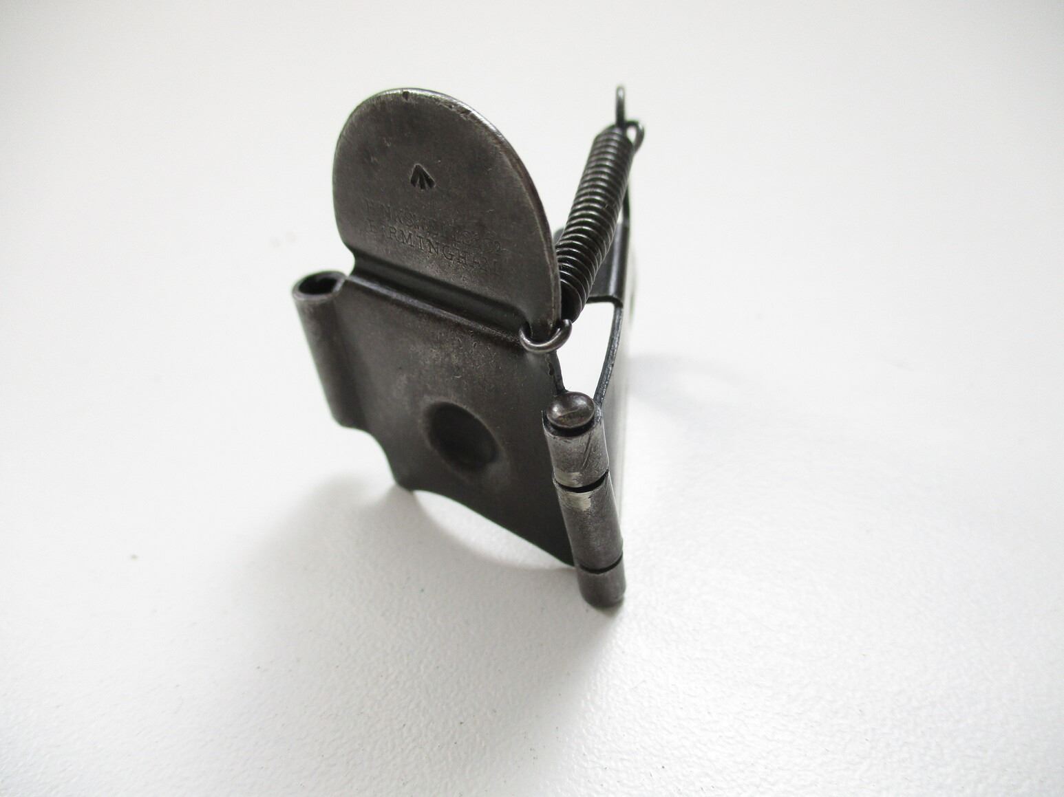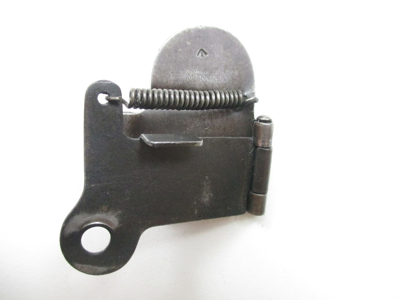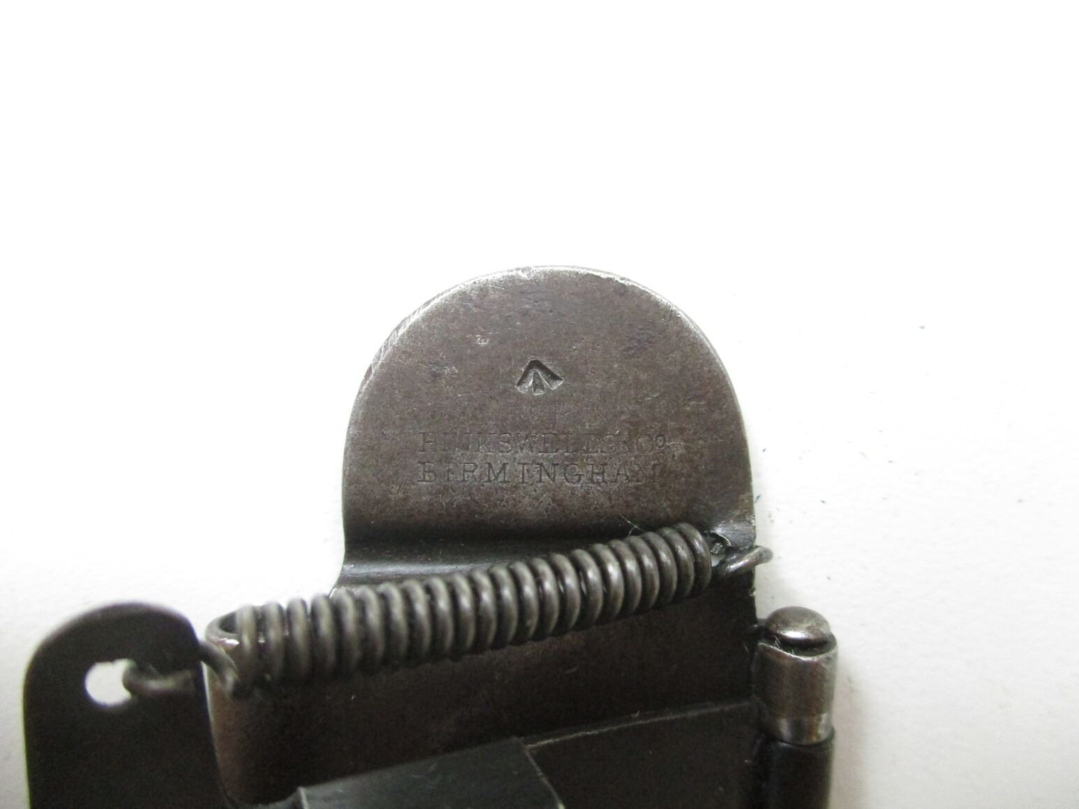 WWI BRITISH / CANADIAN FLANDERS FLAP, (1) MUZZLE PROTECTOR NO.3 MK I, FITS LEE ENFIELD / SMLE RIFLES, BLUED METAL WITH TENSION SPRING, MARKED: "HINKSWELLS & CO., BIRMINGHAM", FLAP FITS ONTO LOT #2198. SEE PHOTOS.
