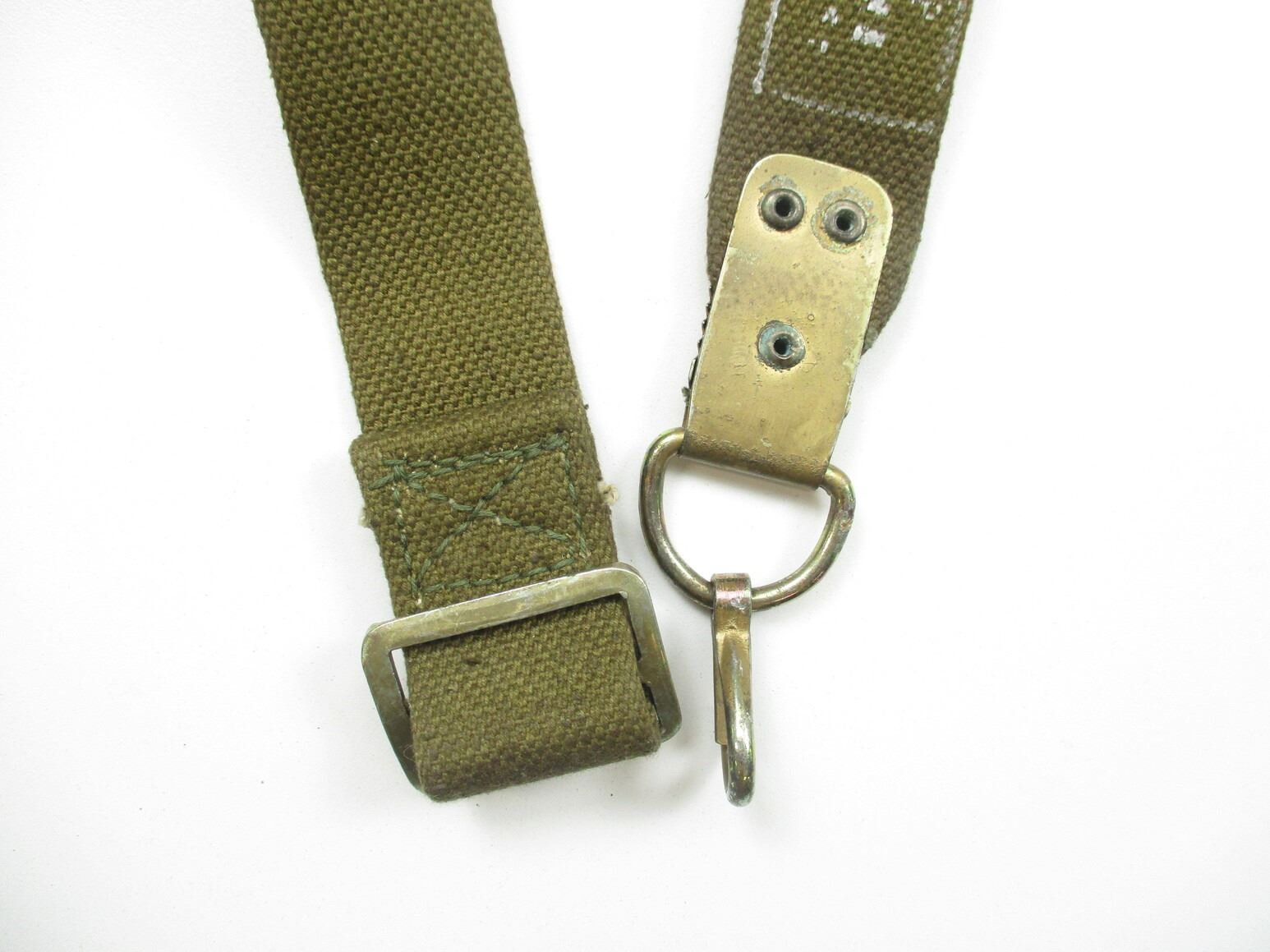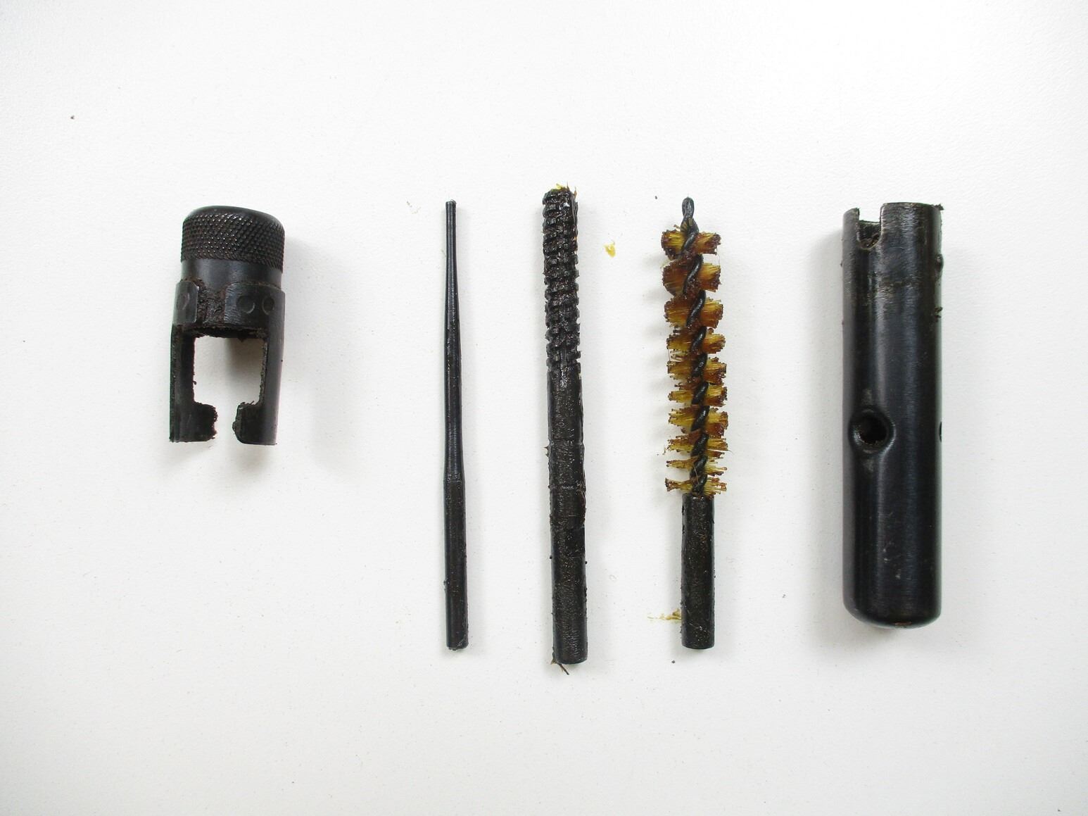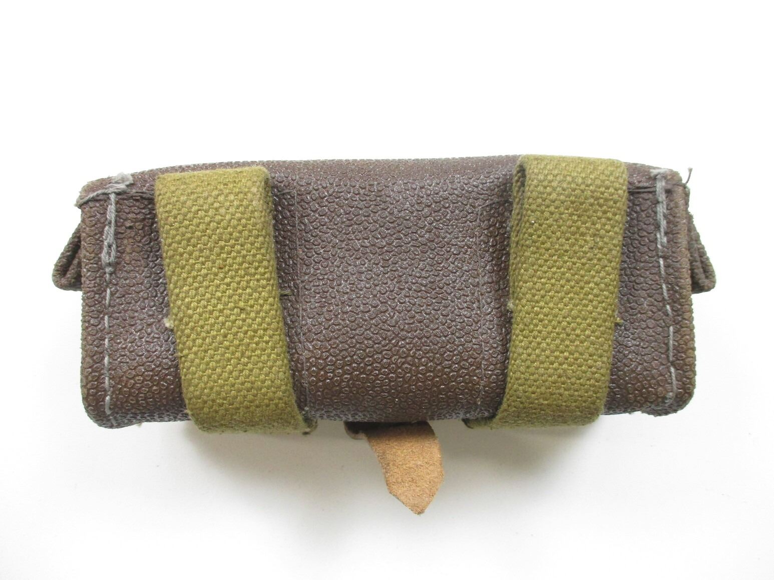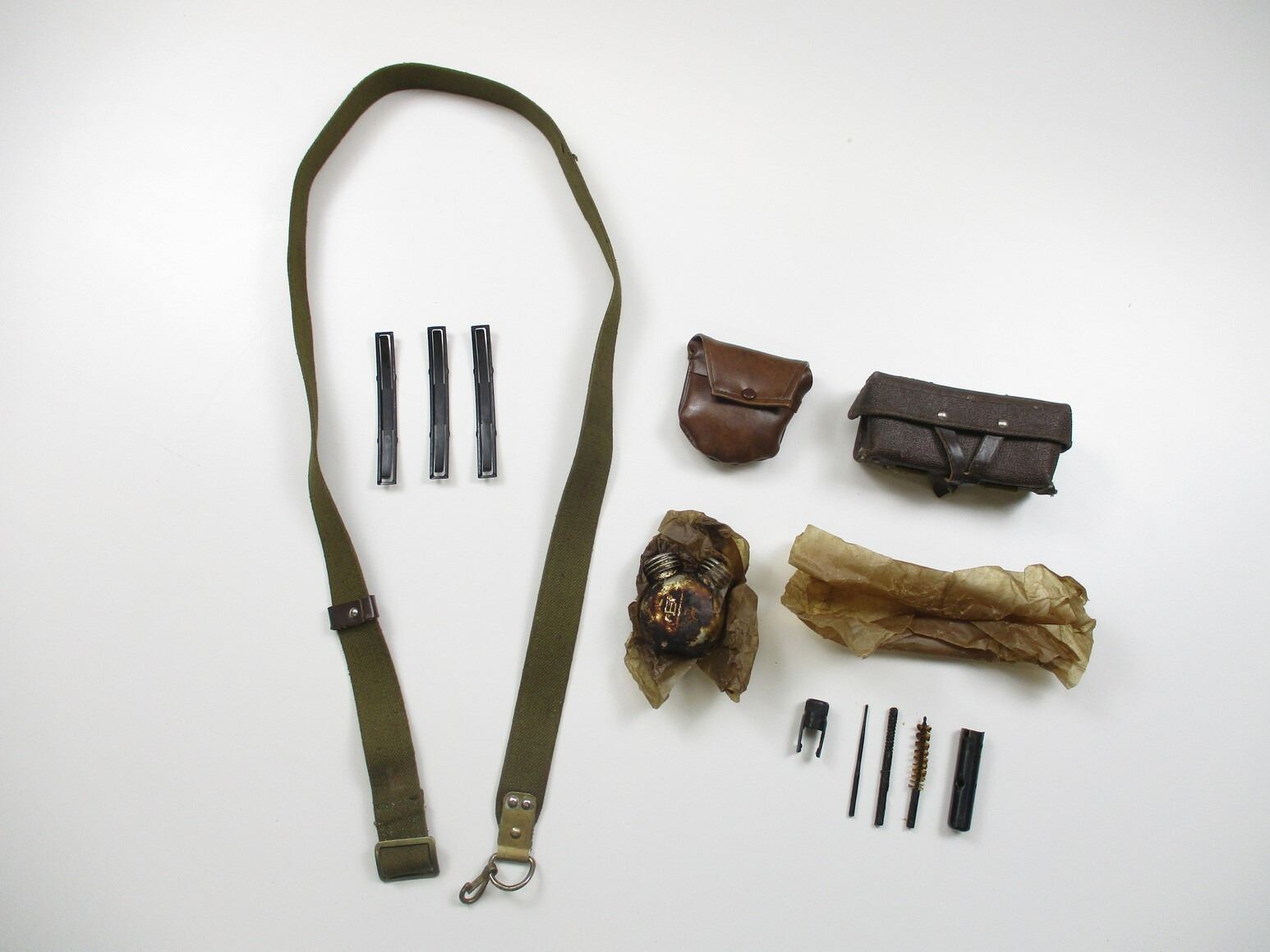 RUSSIAN SKS ACCESSORIES LOT, LOT INCLUDES; (1) CANVAS SLING WITH METAL FITTINGS, VARIOUS MARKINGS, OAL APPROX. 54", (1) BROWN LEATHER AMMO POUCH, NO VISIBLE MARKINGS, (1) CLEANING KIT (JAG, PUNCH & BRUSH), (1) OILER WITH POUCH & (3) 10-RND 7.62X39MM STRIPPER CLIPS WITH PROOF MARKS. SEE PHOTOS.