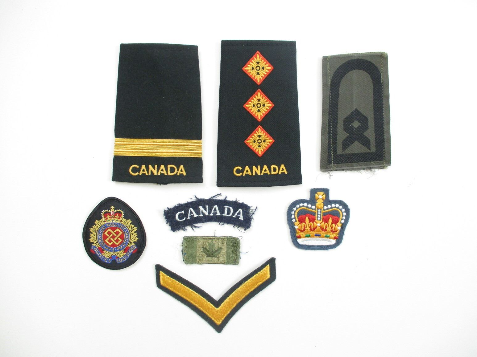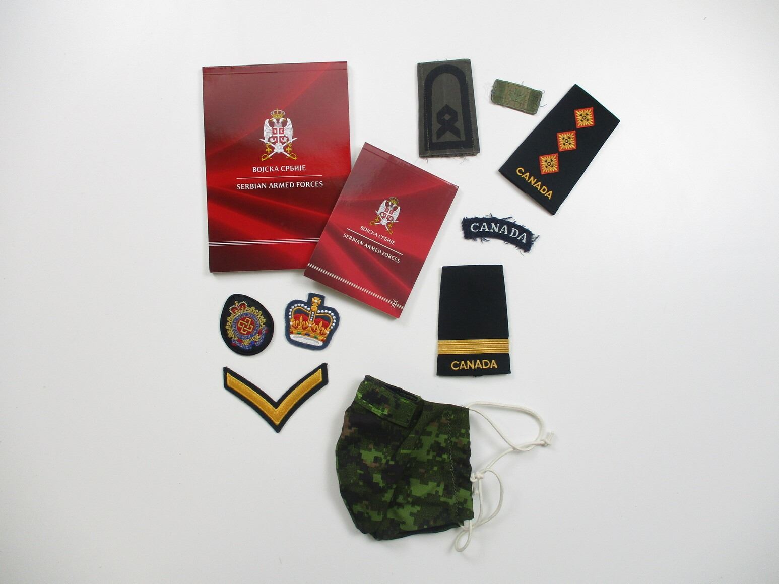 ASSORTED CANADIAN MILITARY ACCESSORIES LOT, ITEMS FROM VARIOUS COUNTRIES INCLUDING; CANADIAN RANK BADGES, PATCHES, SERBIAN ARMED FORCES NOTEBOOKS, MASK, ETC. SEE PHOTOS.