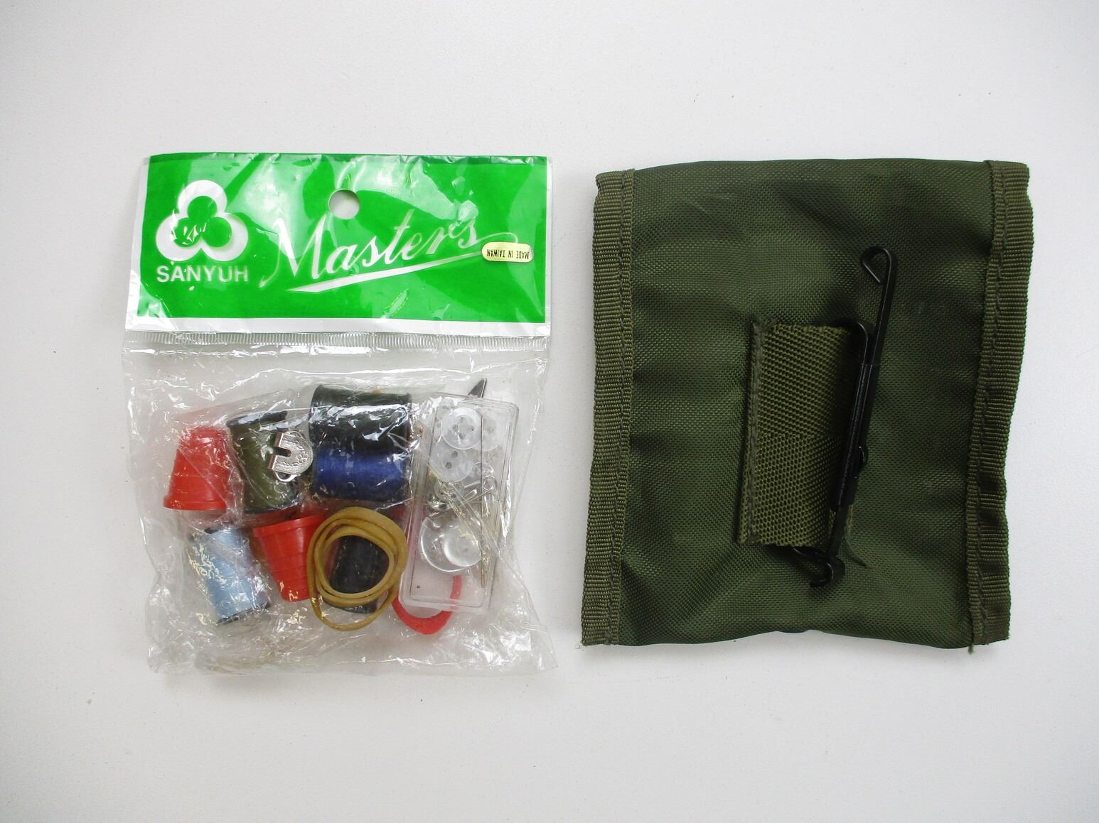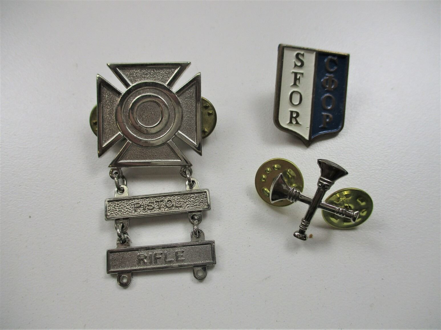 ASSORTED CANADIAN MILITARY ACCESSORIES LOT, ITEMS FROM VARIOUS COUNTRIES INCLUDING; CANADIAN BELT (NOS,) TIE CLASP, SEWING KIT (UNUSED), PEN FROM ITALY (DRY), U.S. MARKSMAN AWARD, SFOR PIN, KEYCHAIN, ETC. SEE PHOTOS.